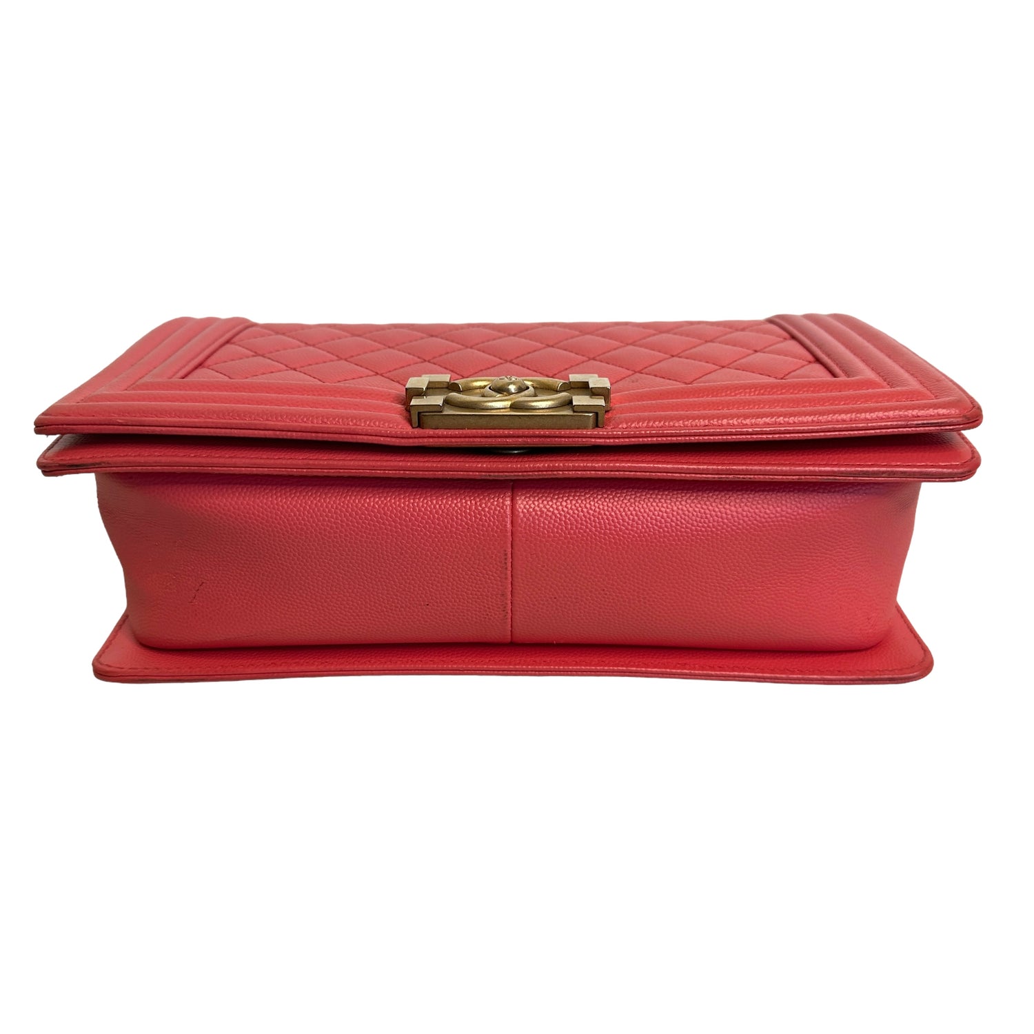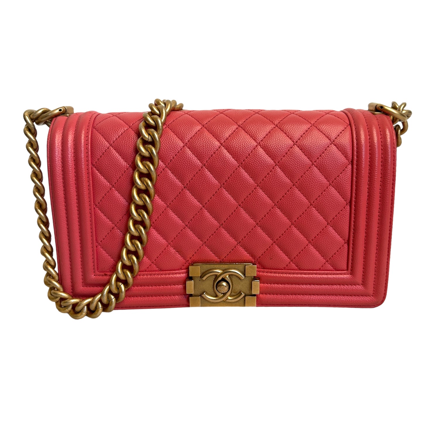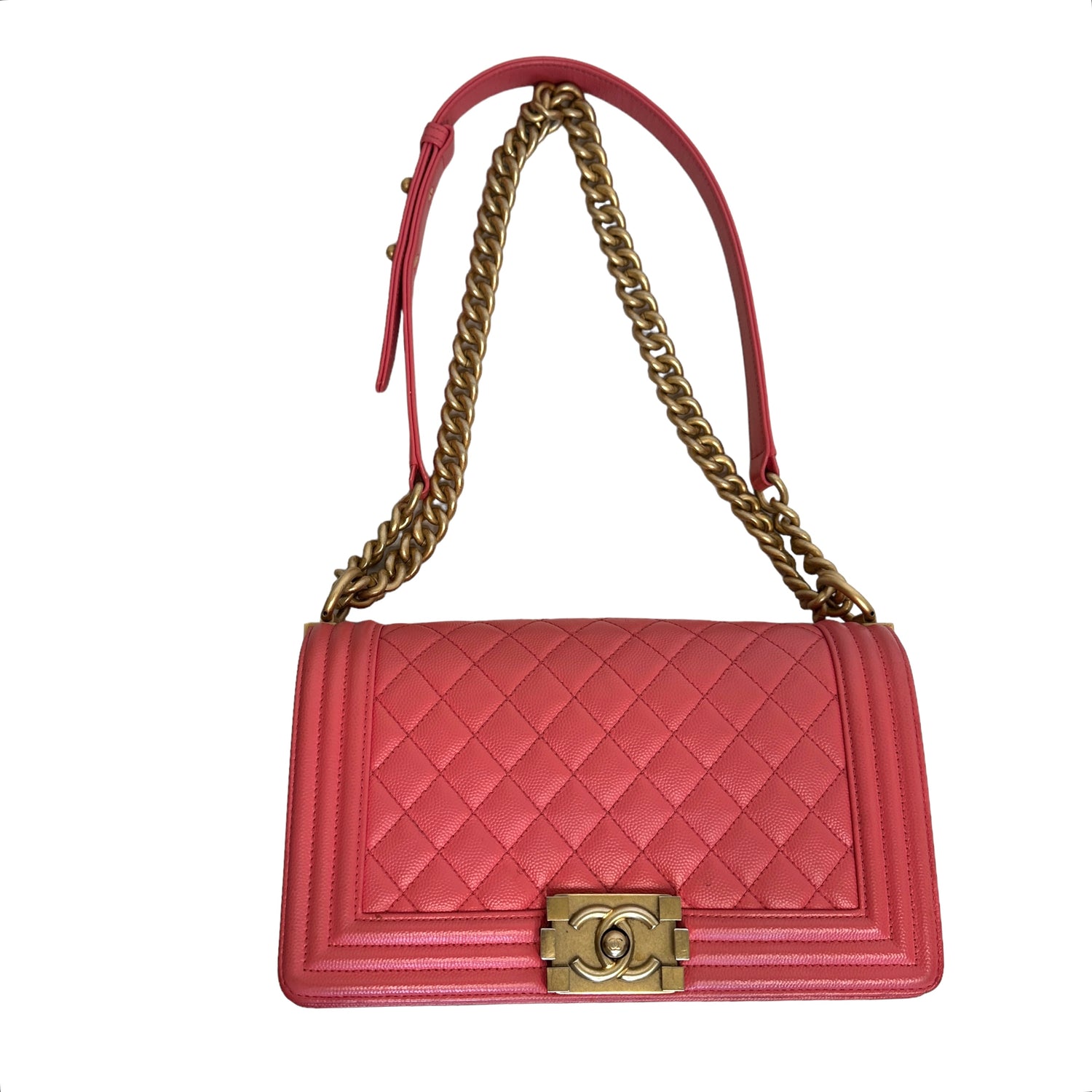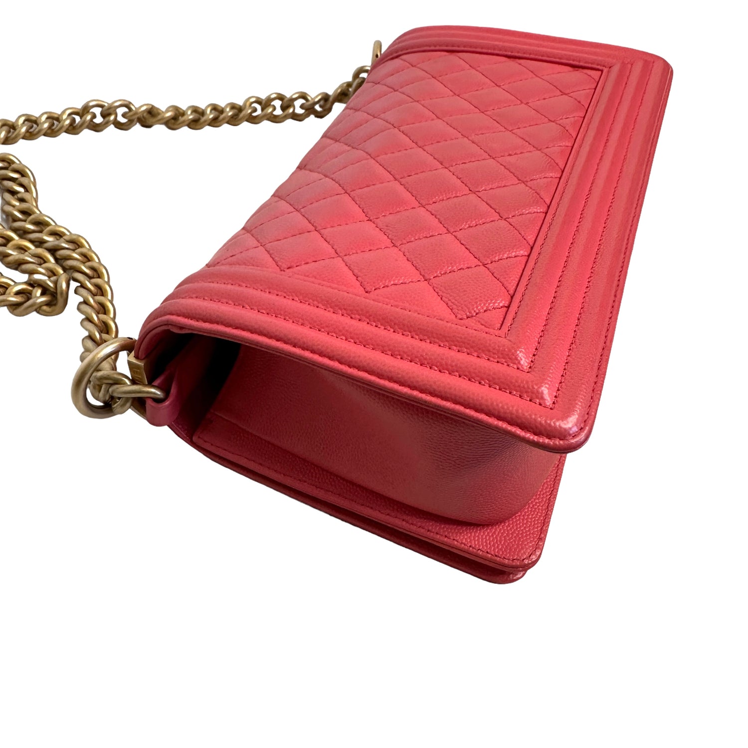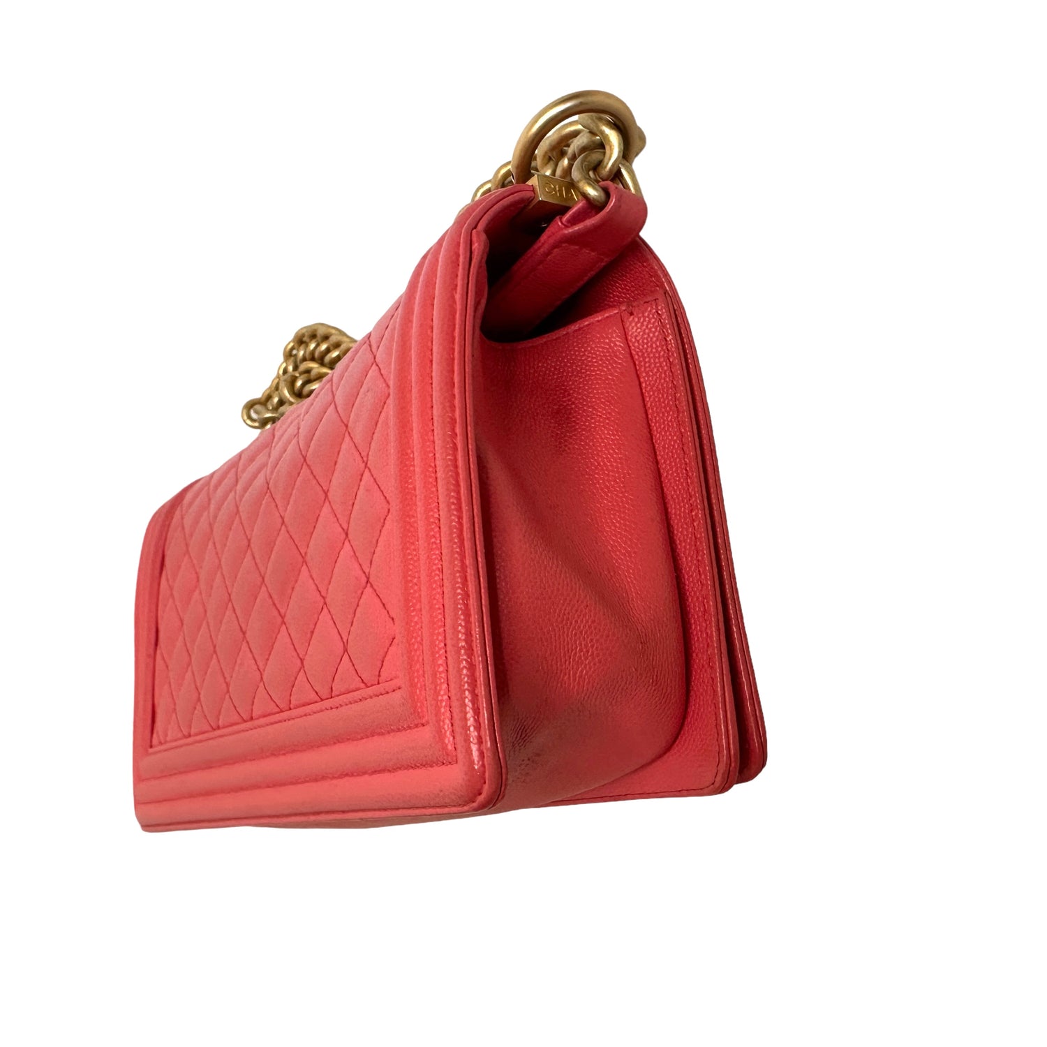 Chanel 2018 Boy bag. Diamond quilted caviar leather in a coral pink color. Brushed gold-tone hardware. Snap flap closure. Grosgrain lining. The long chain can be carried as a shoulder bag or a crossbody bag making this bag versatile.