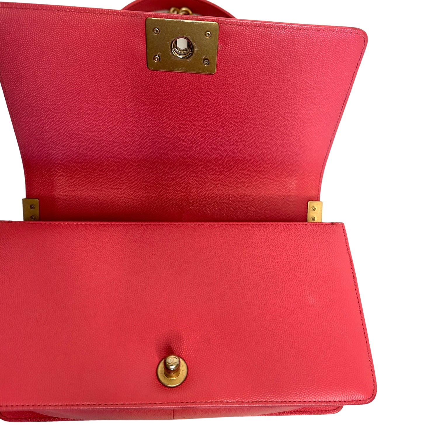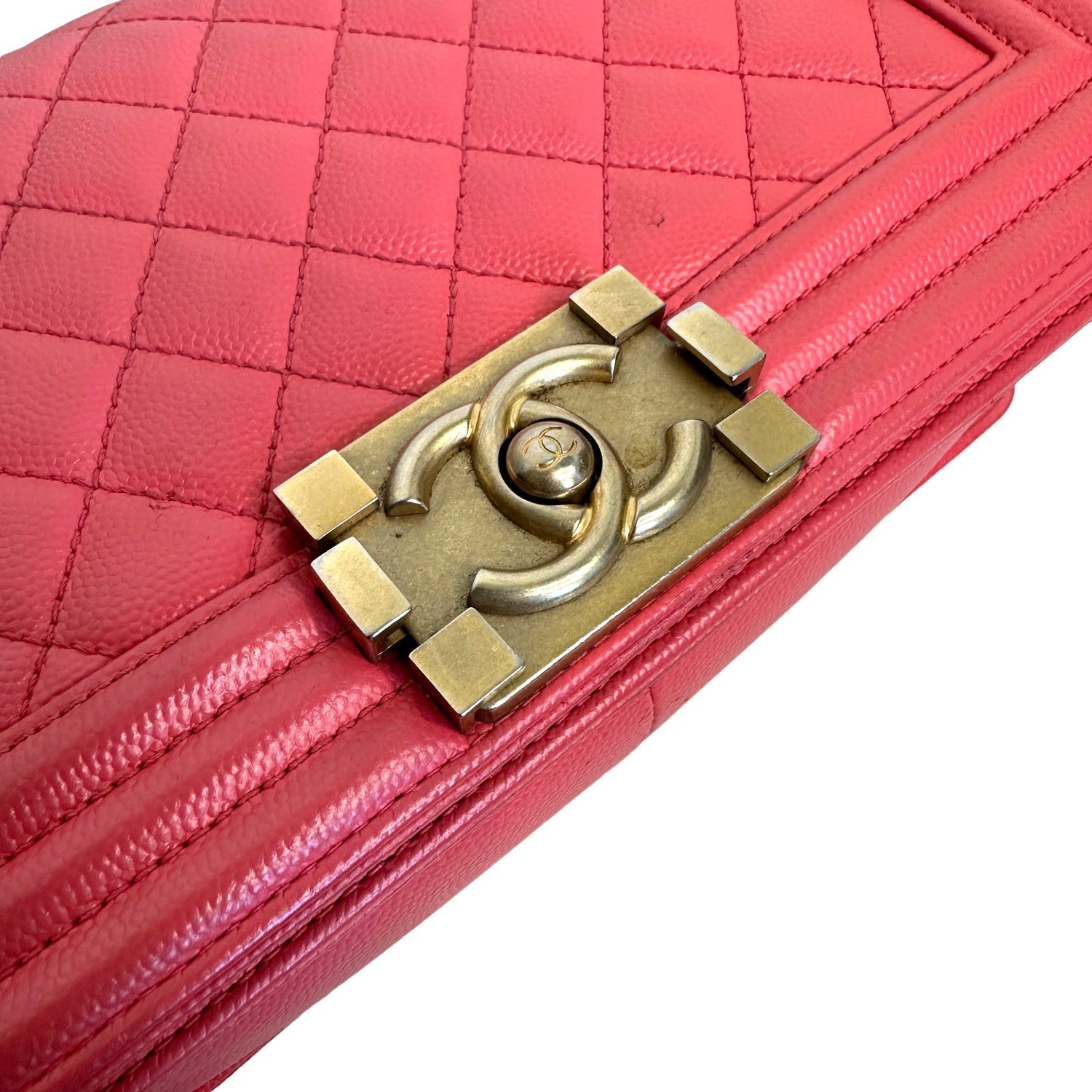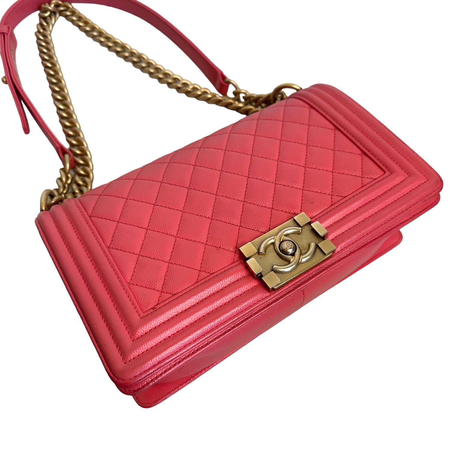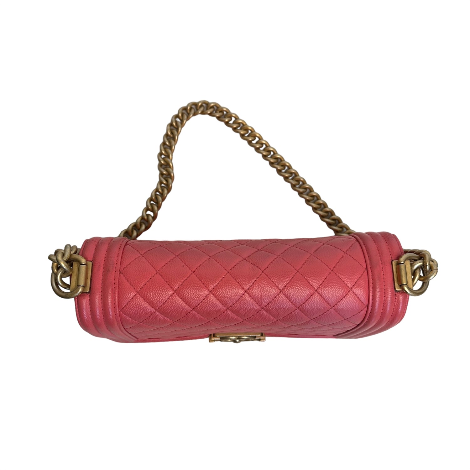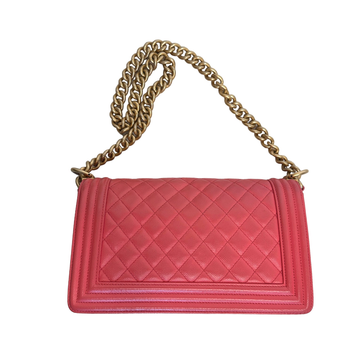Chanel 2018 Boy bag. Diamond quilted caviar leather in a coral pink color. Brushed gold-tone hardware. Snap flap closure. Grosgrain lining. The long chain can be carried as a shoulder bag or a crossbody bag making this bag versatile.