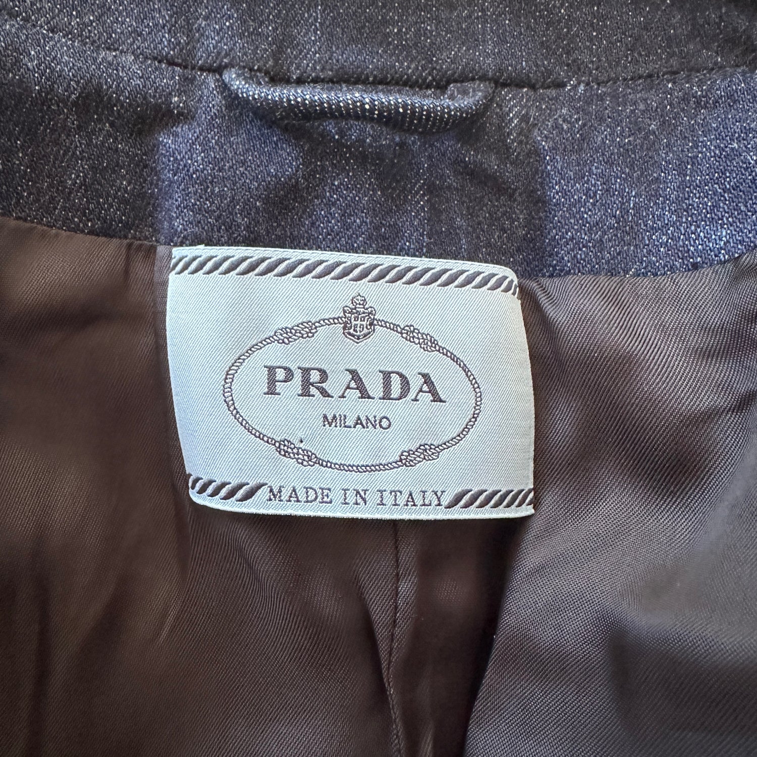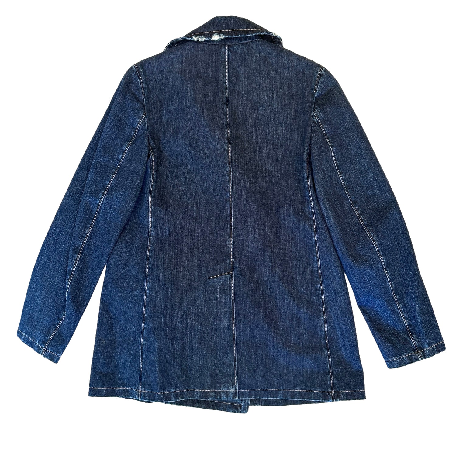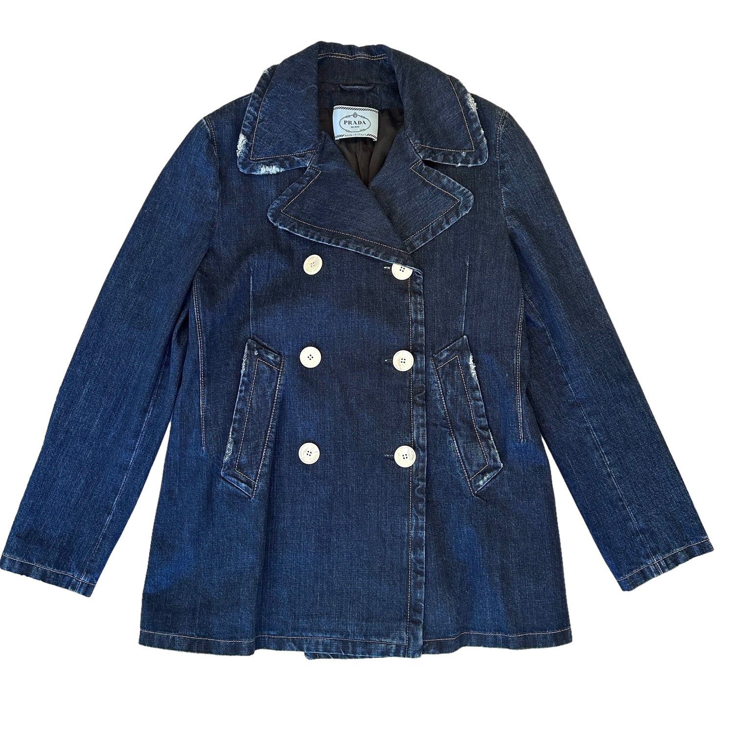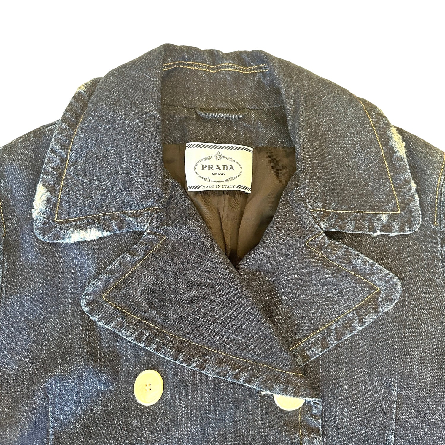 Prada denim jacket from the Spring/Summer 2019 collection. Dark blue denim. Pointed collar. Slit pockets. Large beautiful large mother of pearl buttons. Distressed accents. Designer size 42.