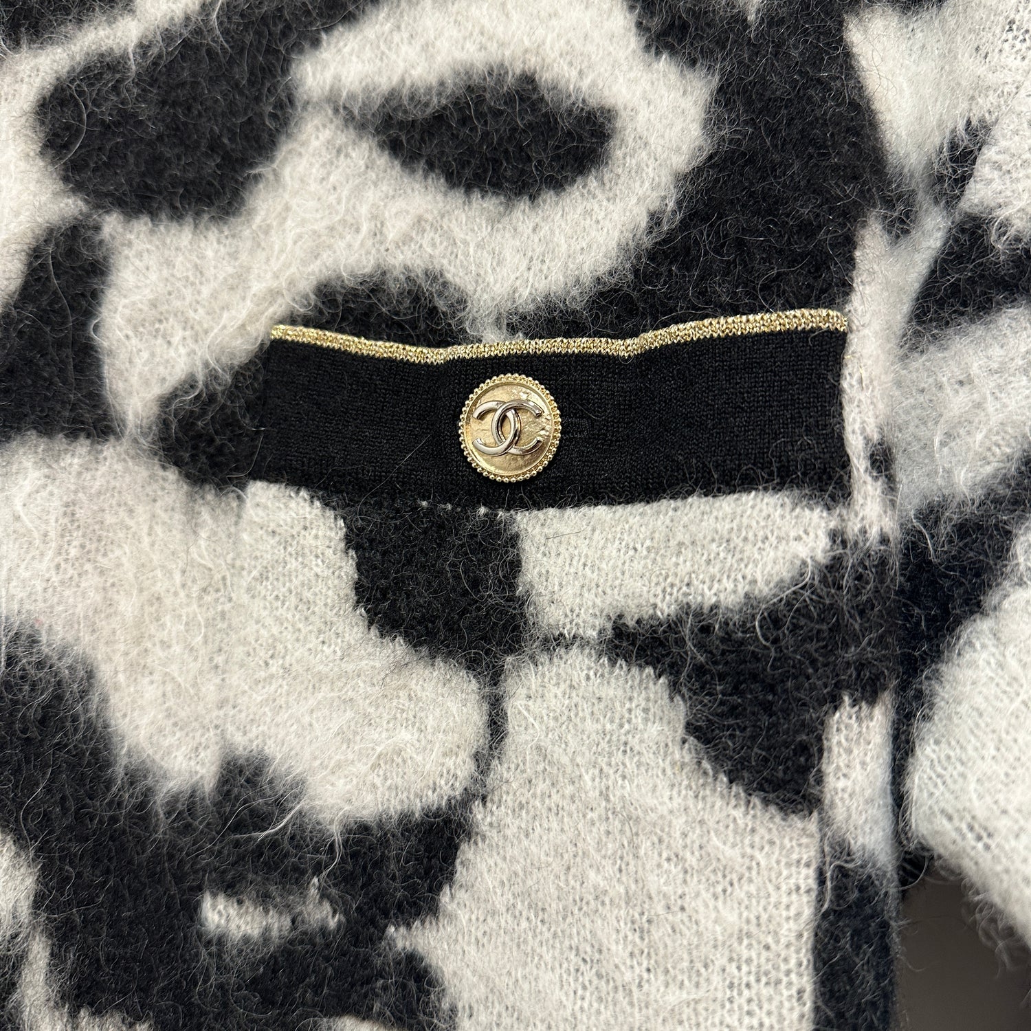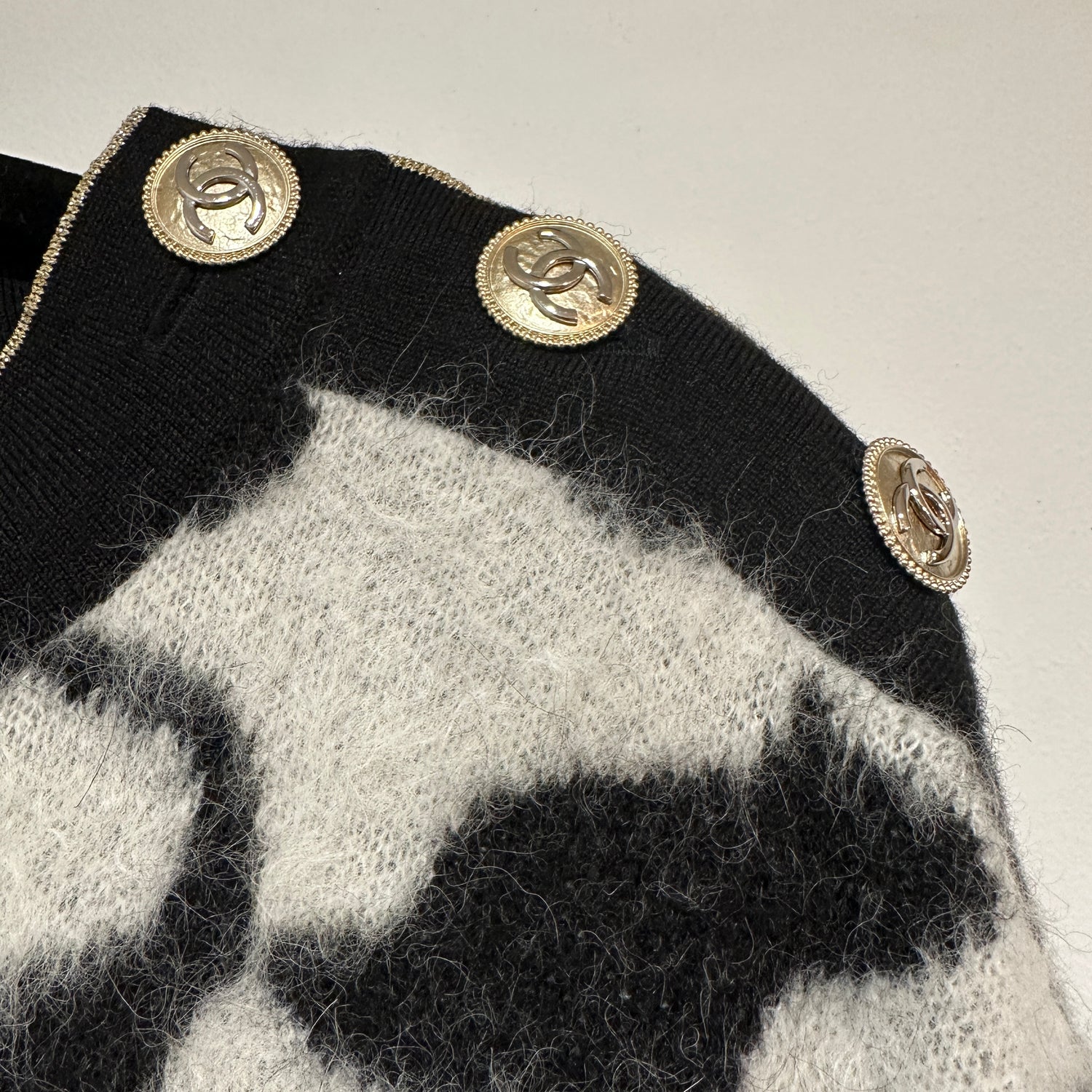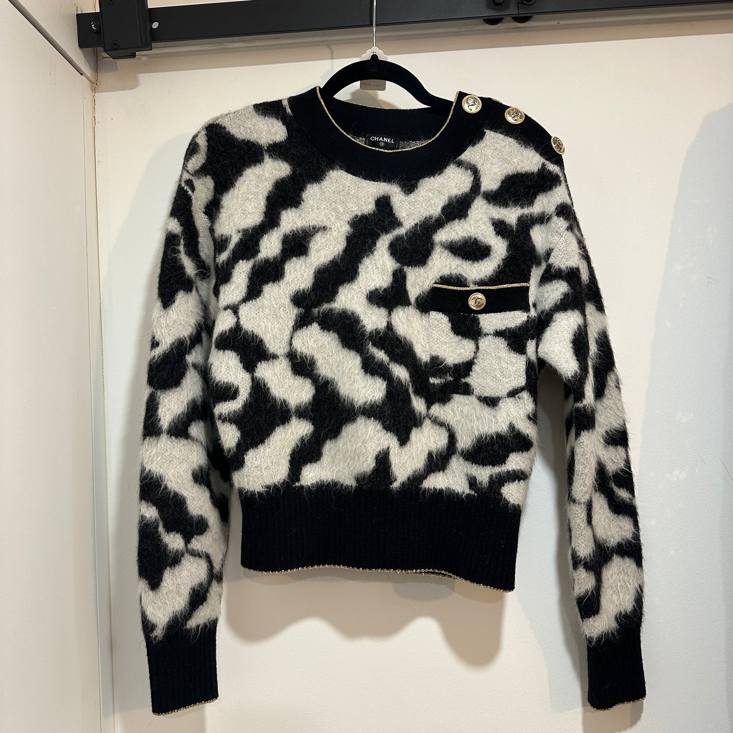 Chanel black and white sweater from 2020 collection. Round neck. CC logo at shoulder. Gold-tone hardware. Designer size 38.