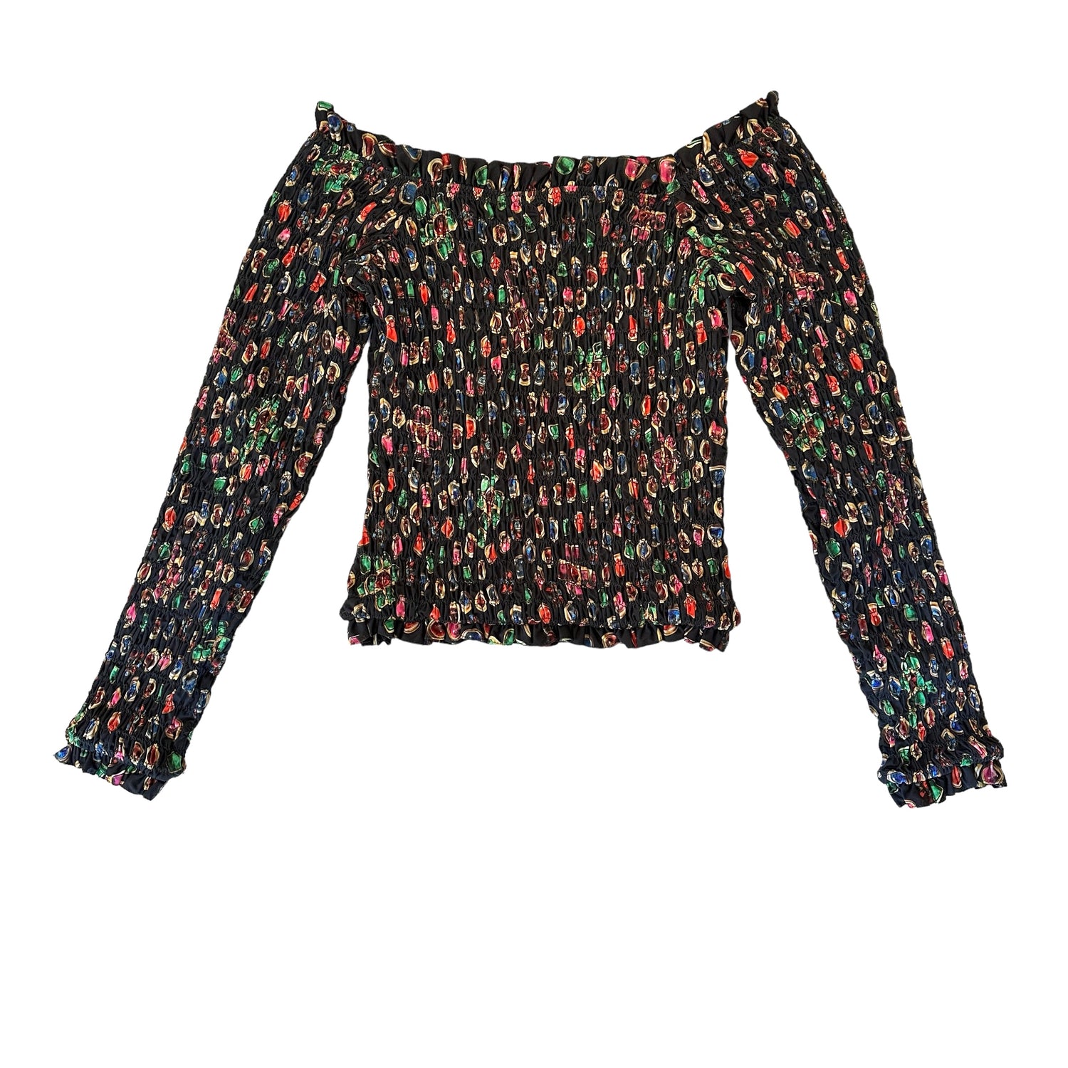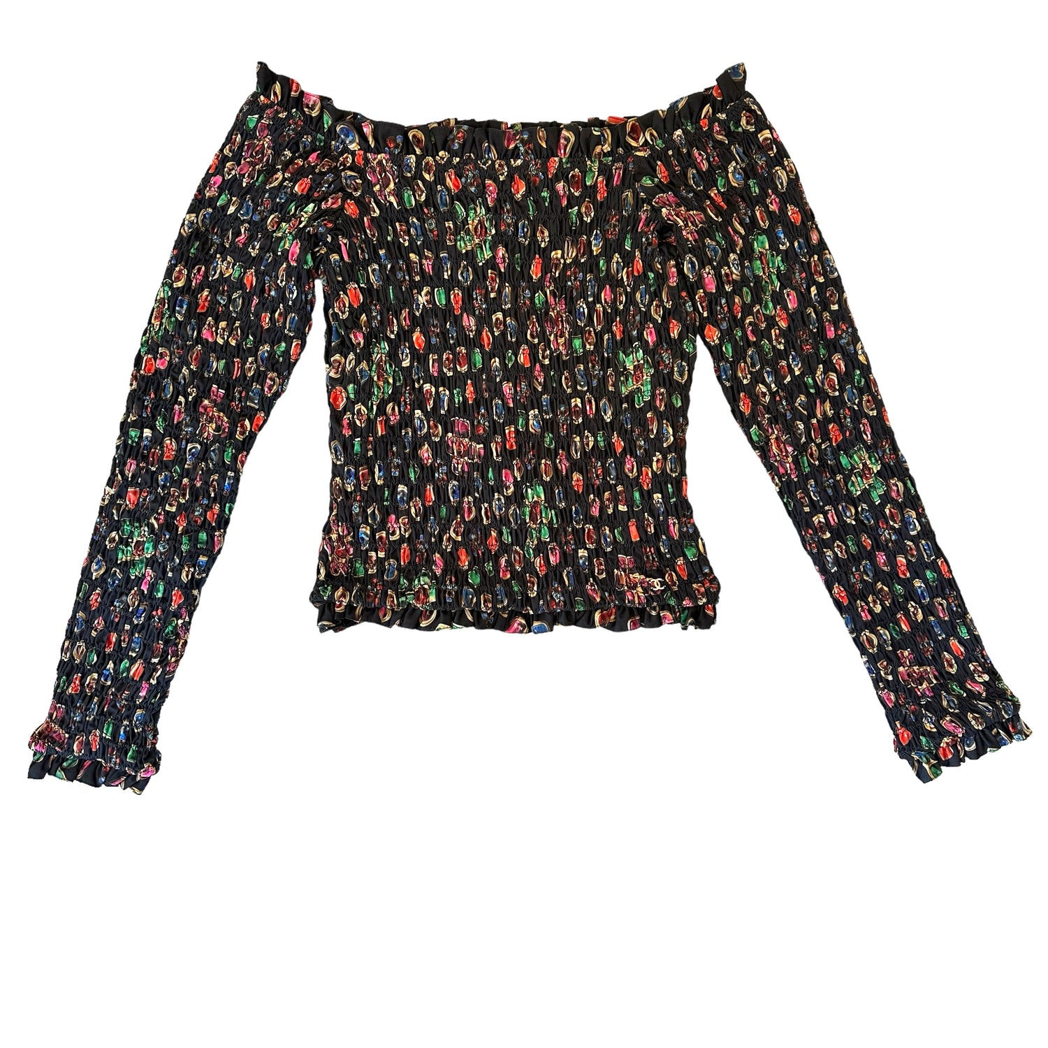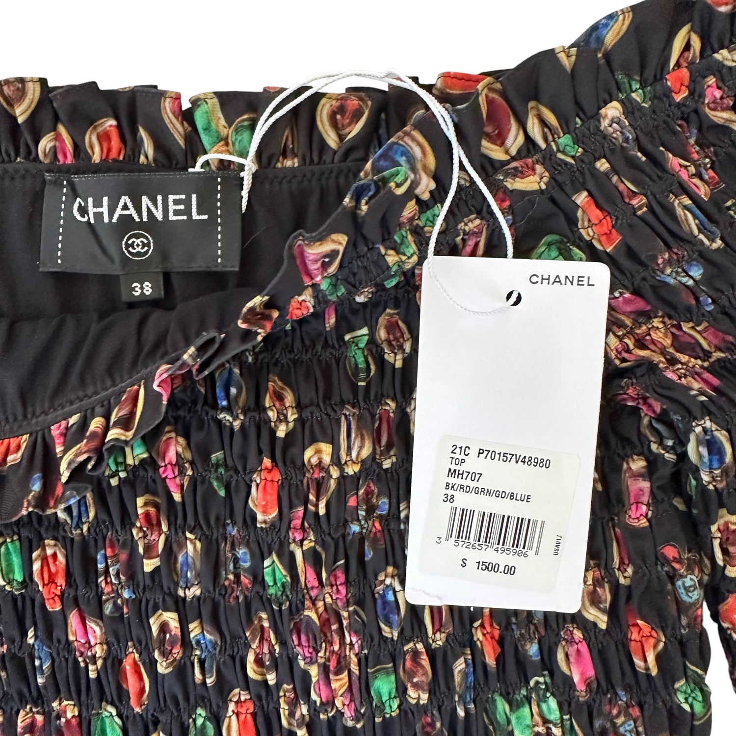Chanel 2021 Cruise collection top. Black with beautiful multicolor jewellery print and CC. Elasticised throughout. Off shoulder. Long sleeves and mini ruffle details at sleeves and collar. Silver-tone CC logo at front. Designer size 38.