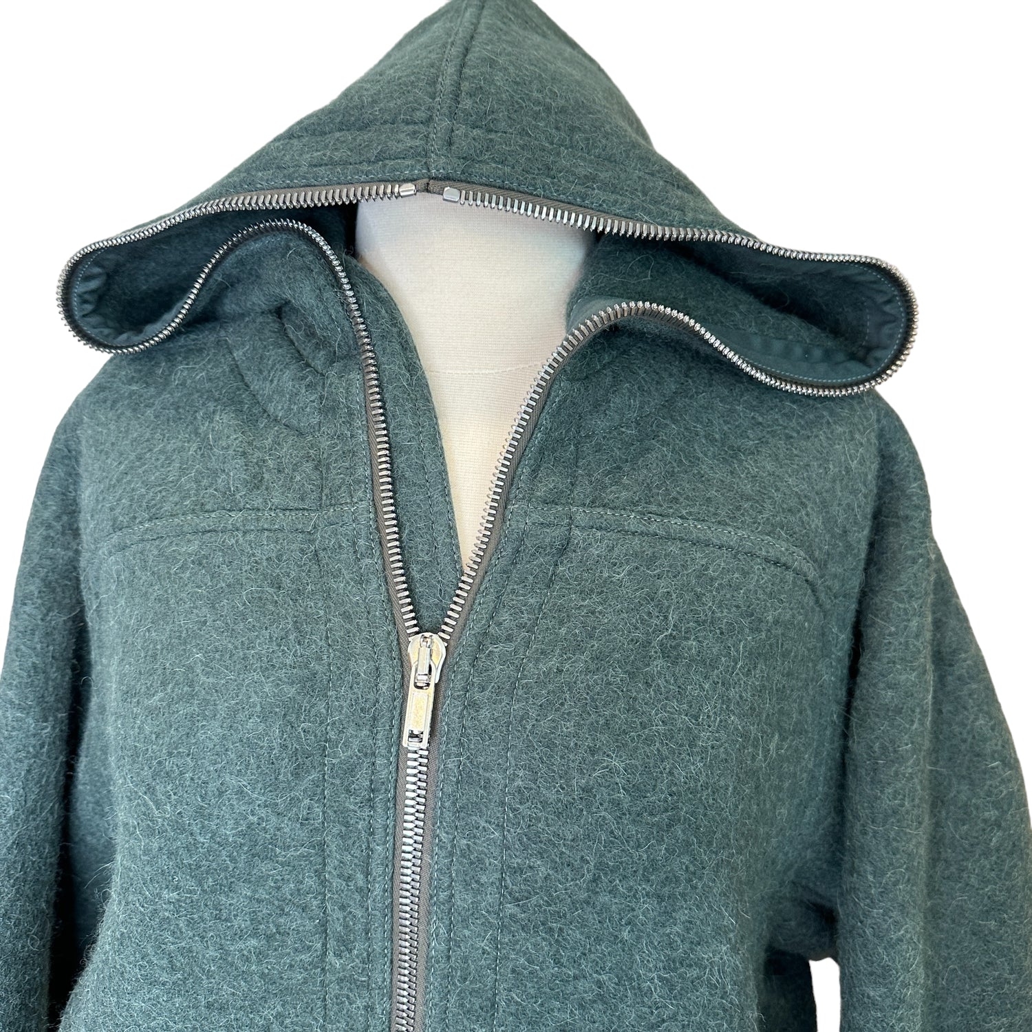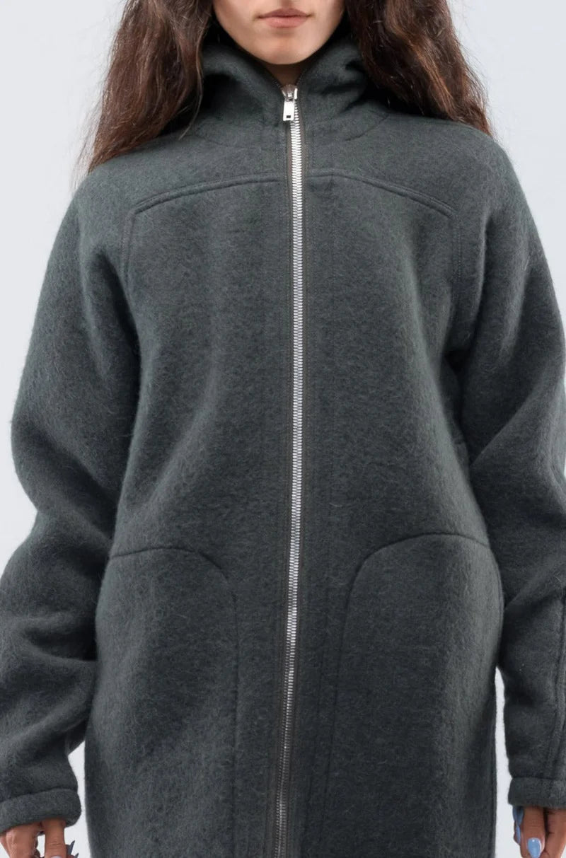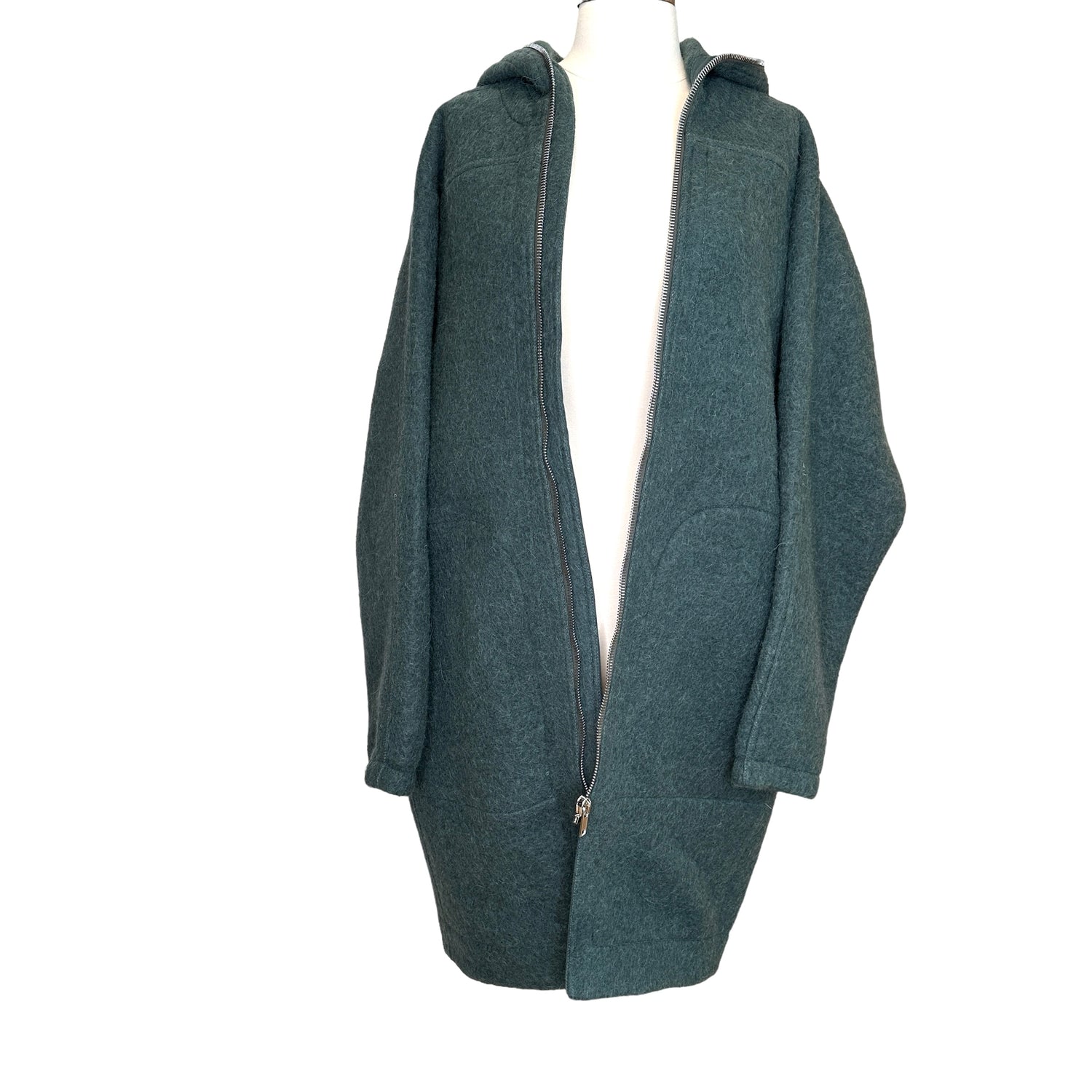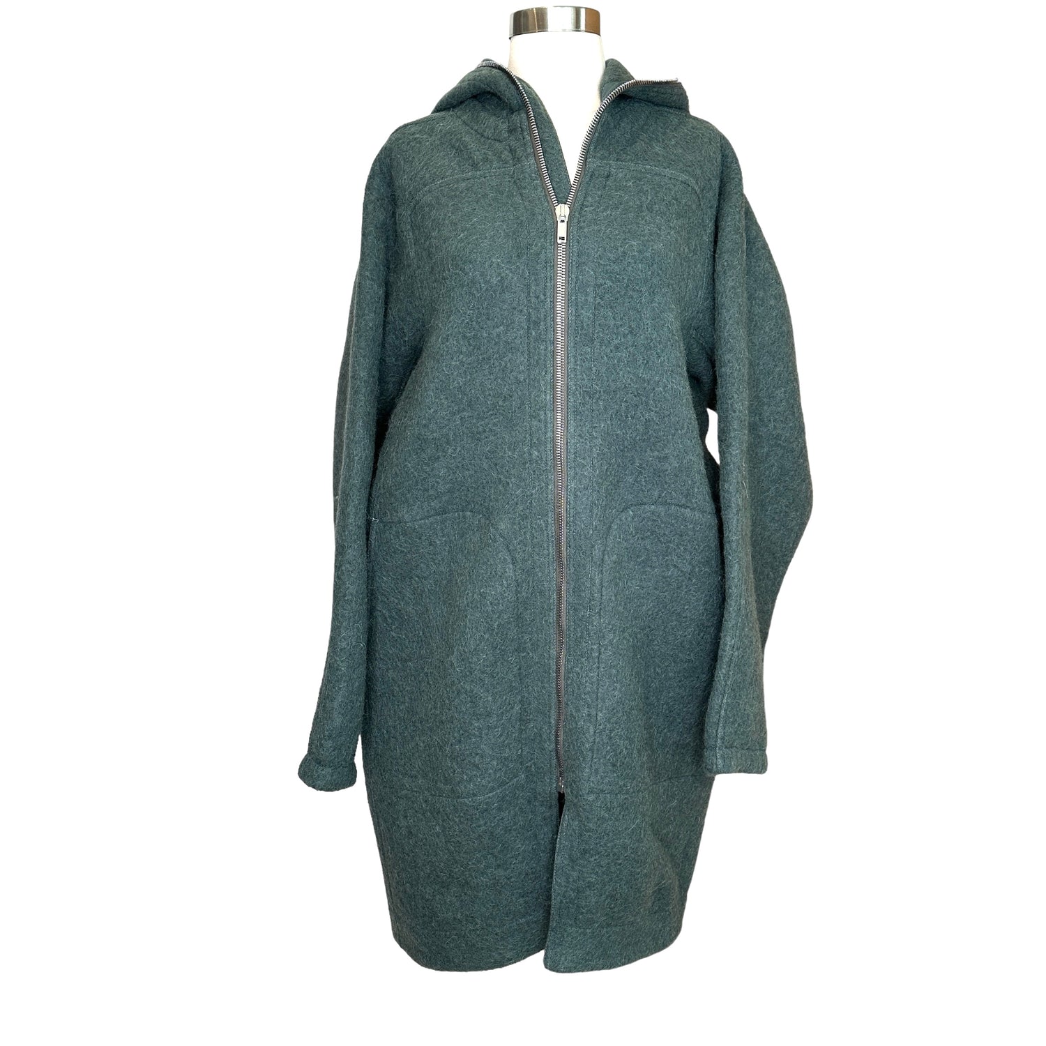Rick Owens green/grey oversized coat. Zipper closure with hood. Knee-length. Drop shoulders. Large patch pockets. Designer size 42.