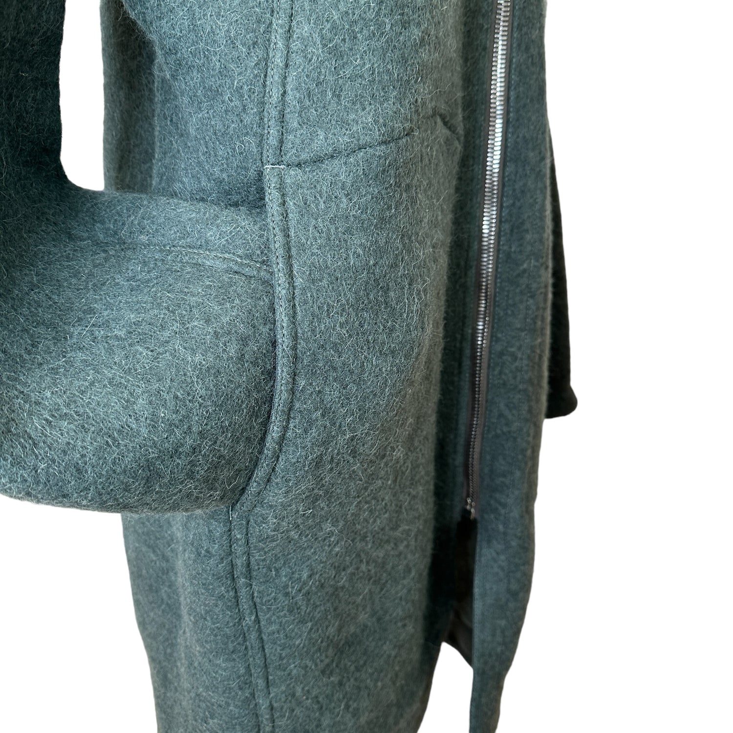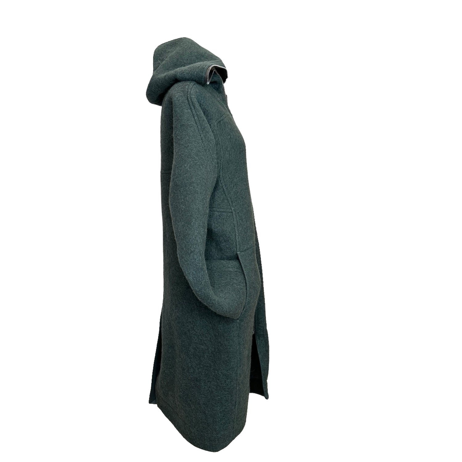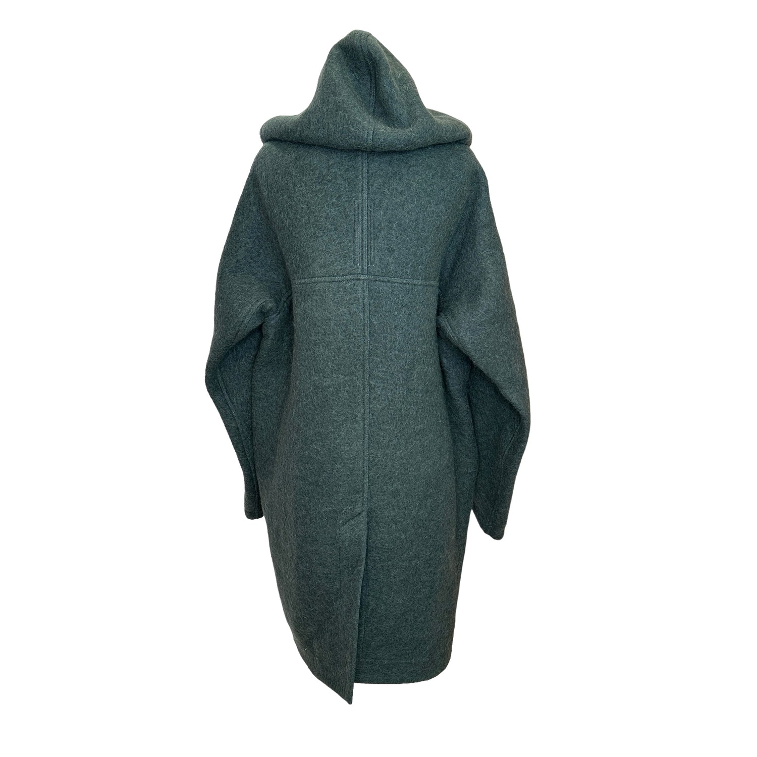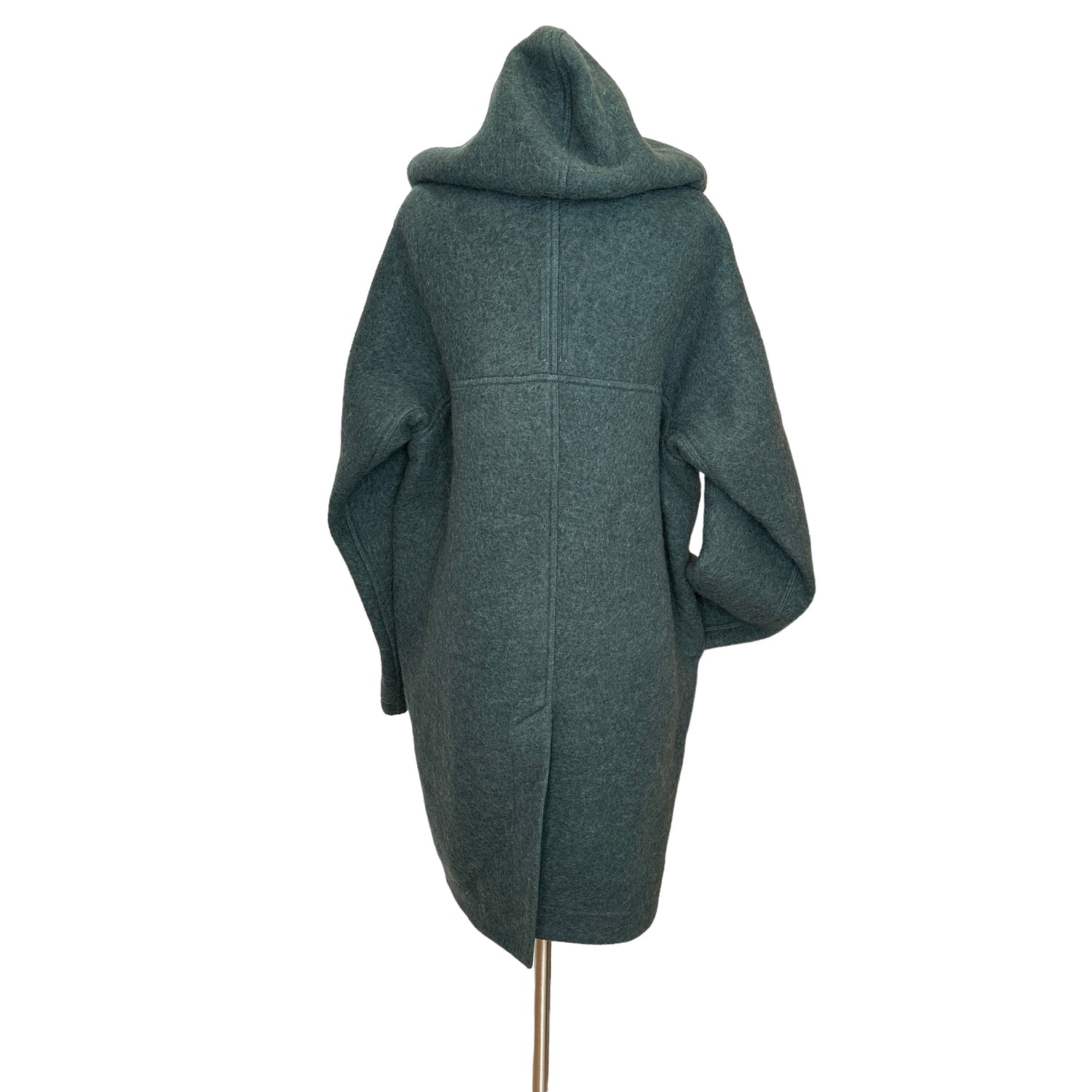 Rick Owens green/grey oversized coat. Zipper closure with hood. Knee-length. Drop shoulders. Large patch pockets. Designer size 42.