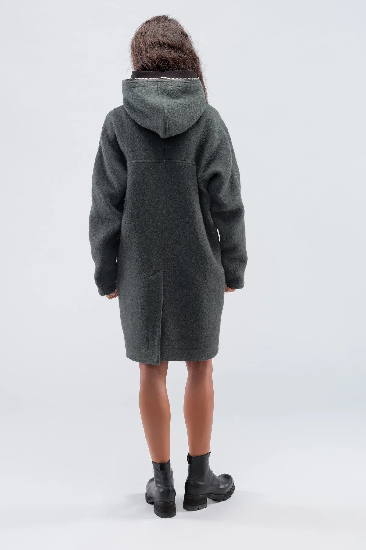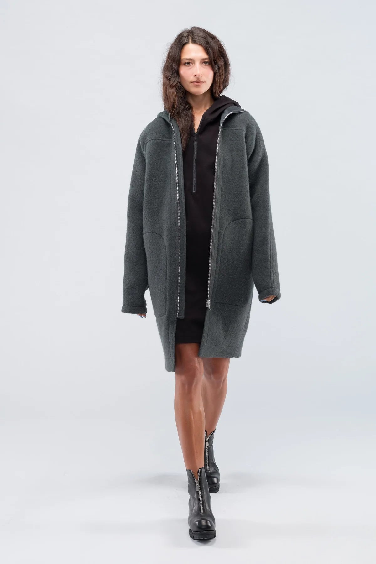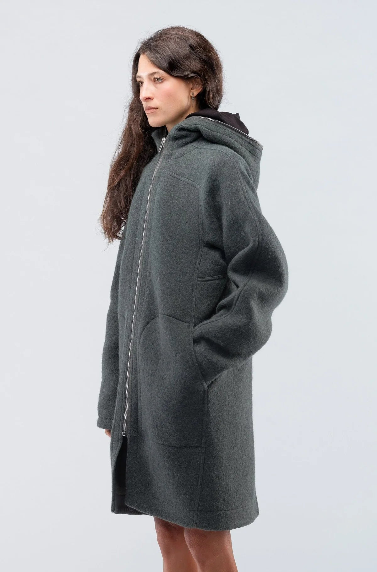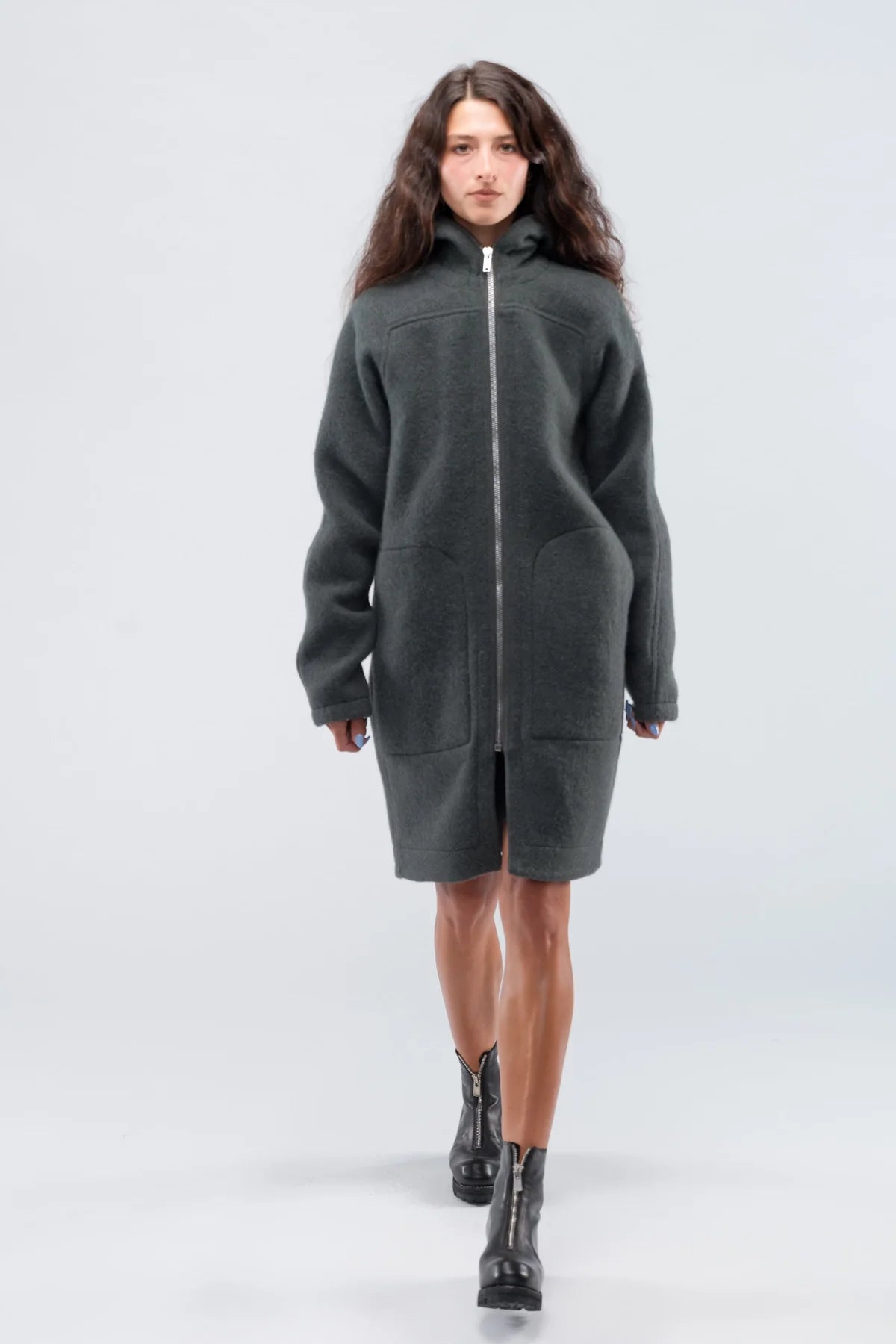 Rick Owens green/grey oversized coat. Zipper closure with hood. Knee-length. Drop shoulders. Large patch pockets. Designer size 42.