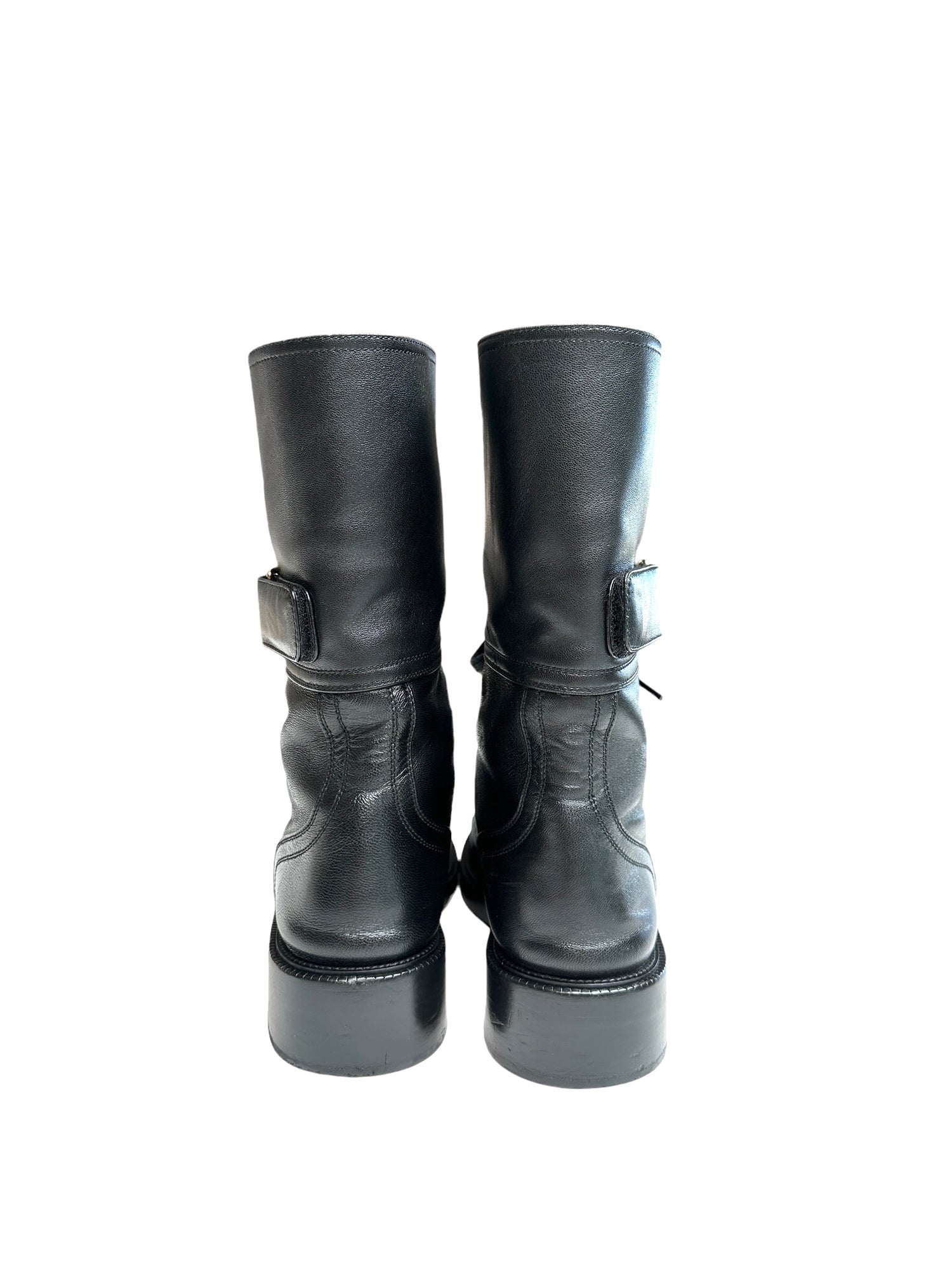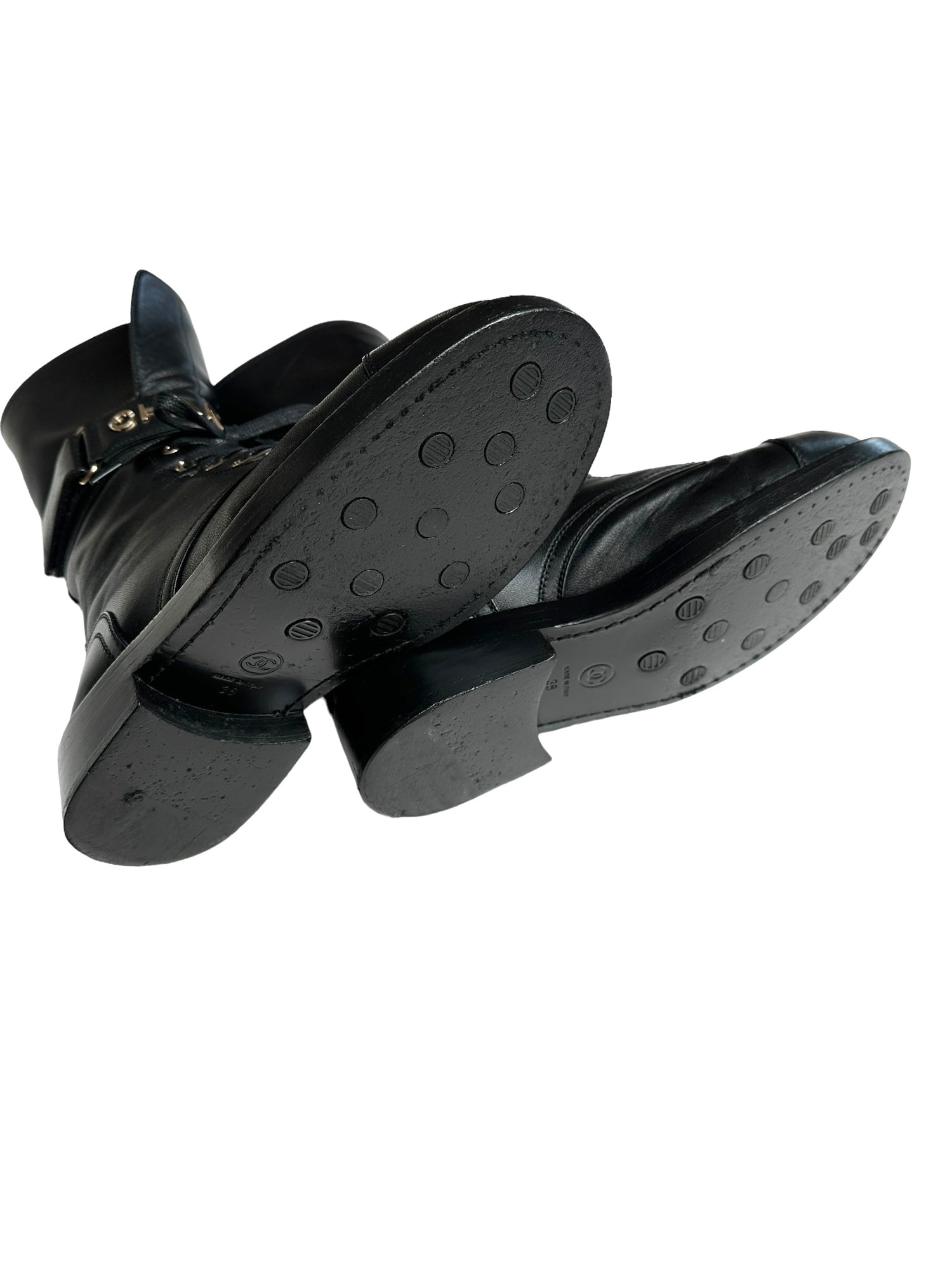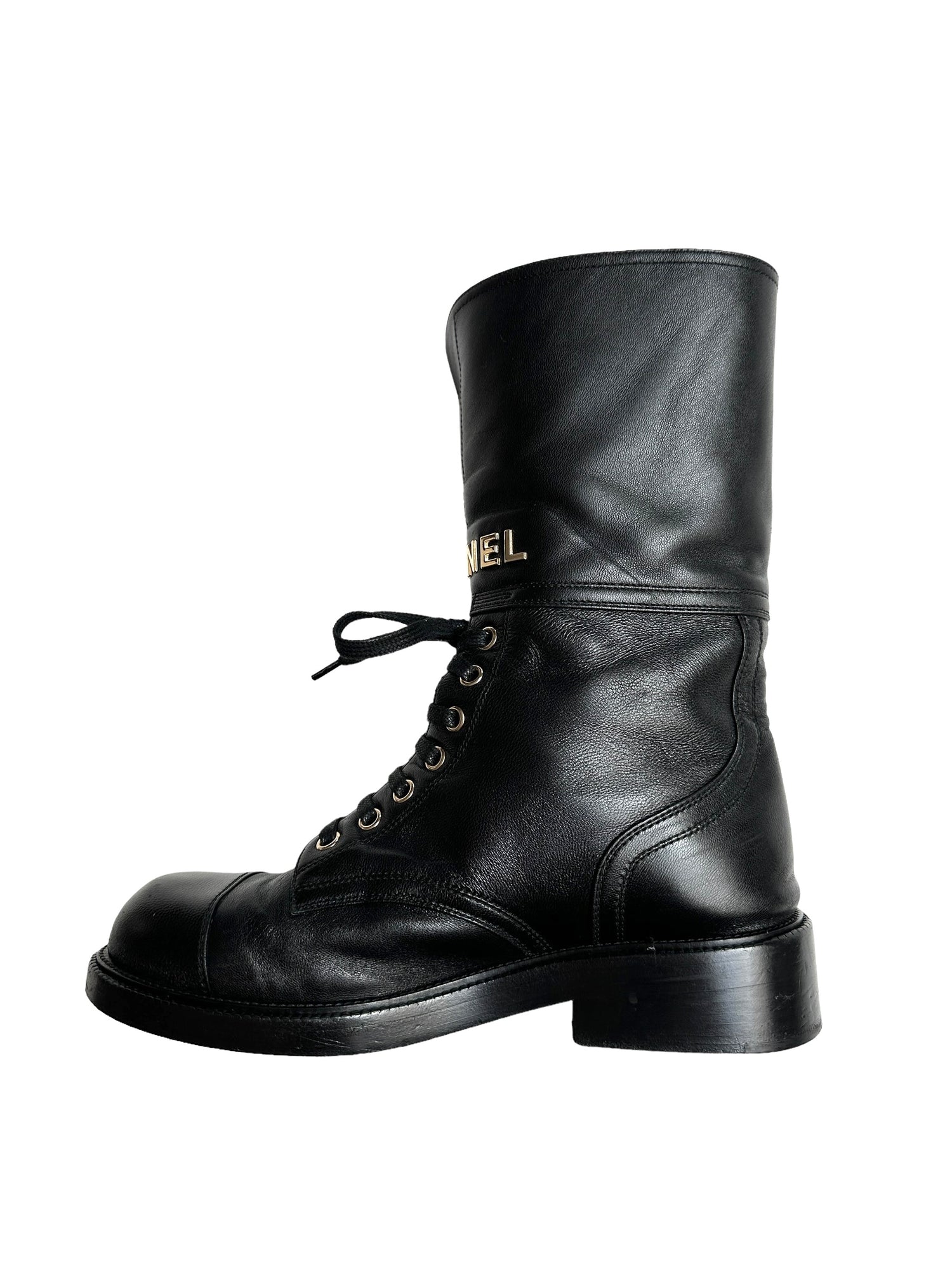 Chanel black logo combat boots. Laces at front. Scratch closure at top. Black lambskin leather and gold-tone hardware and CHANEL logo. Round toe cap. Designer size 38.