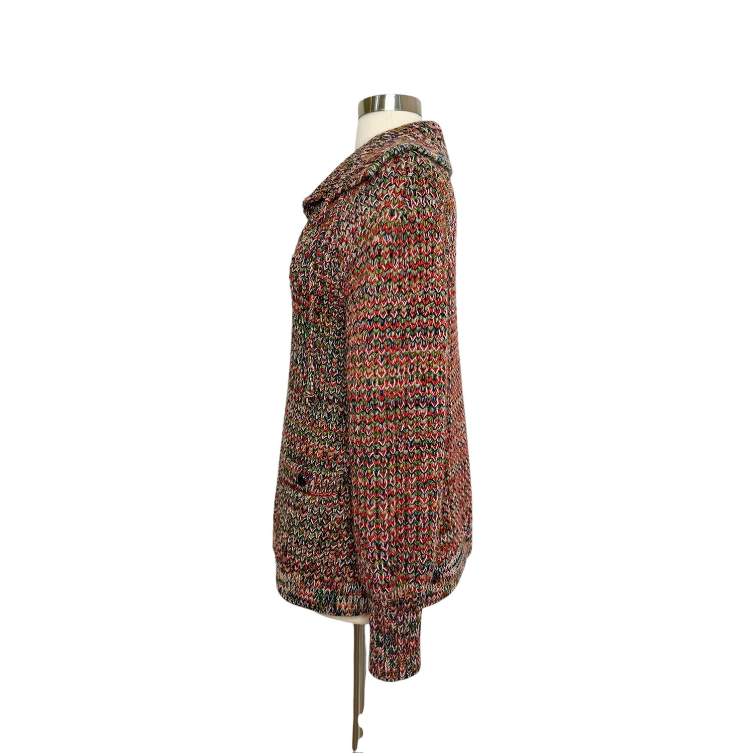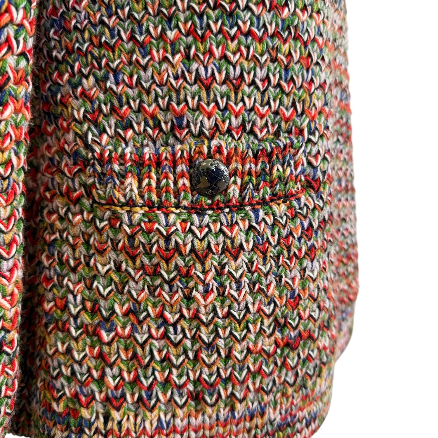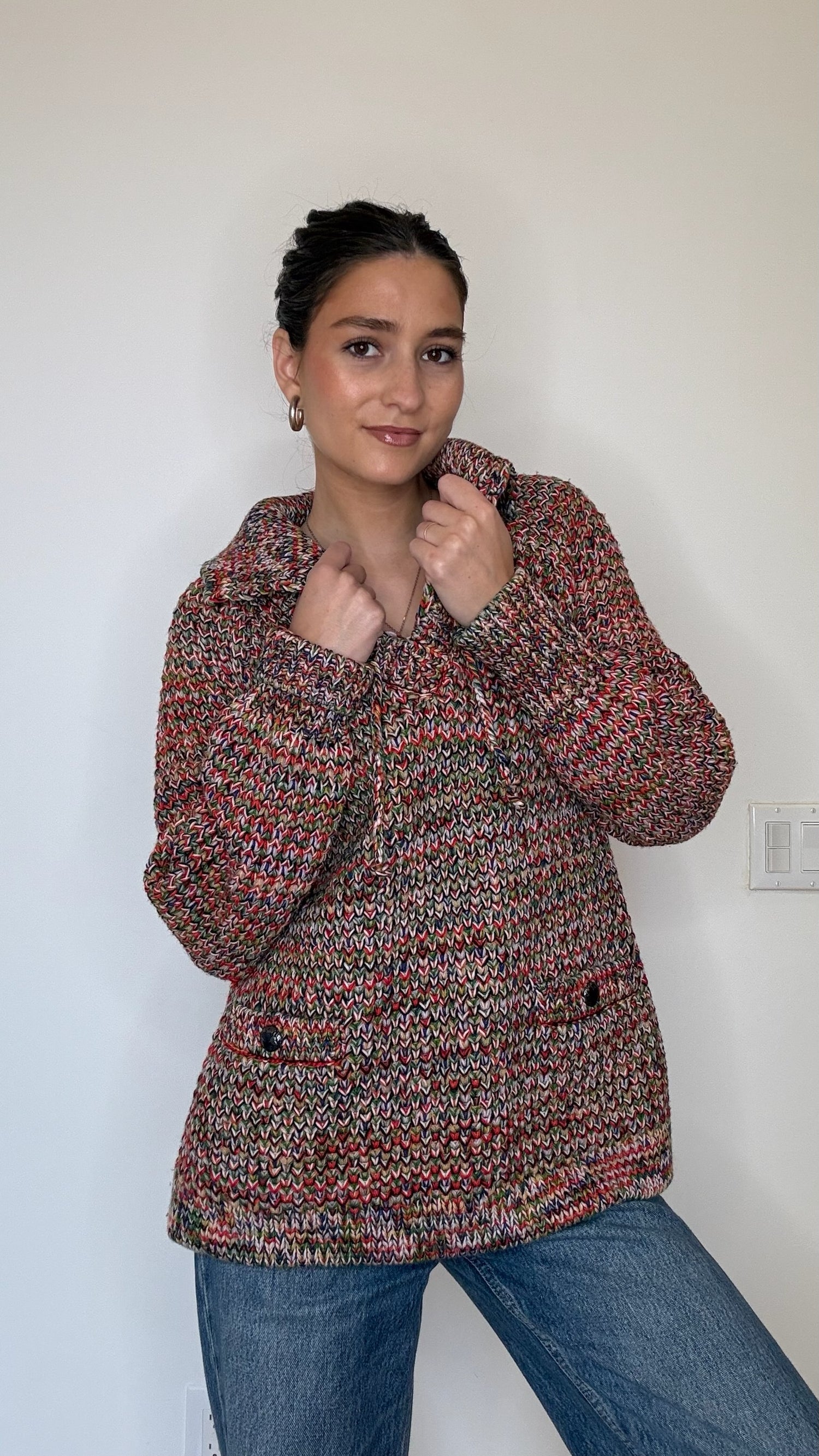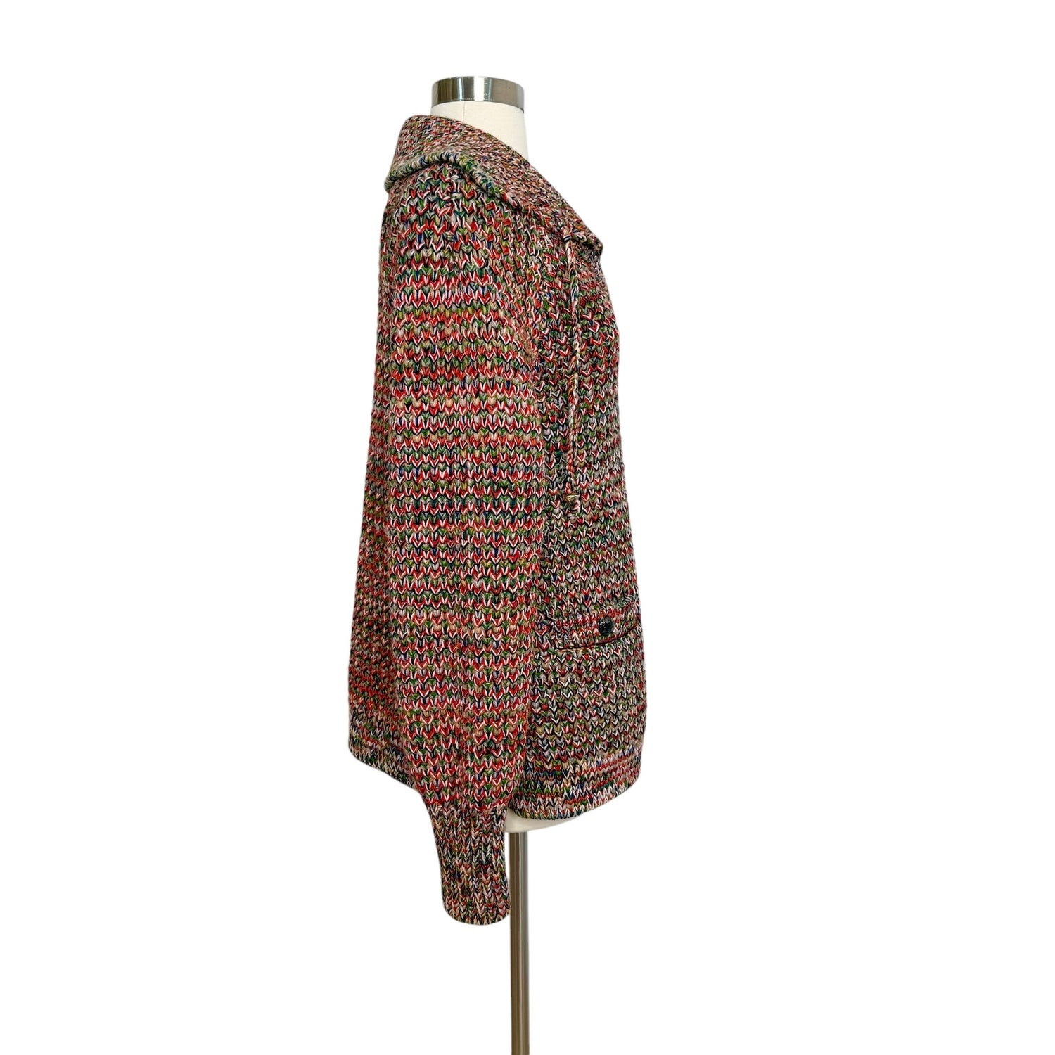 Chanel airline collection sweater. Multicolor wool knits. Drawstring at collar. Large CC buttons at front pockets. Designer size 38.