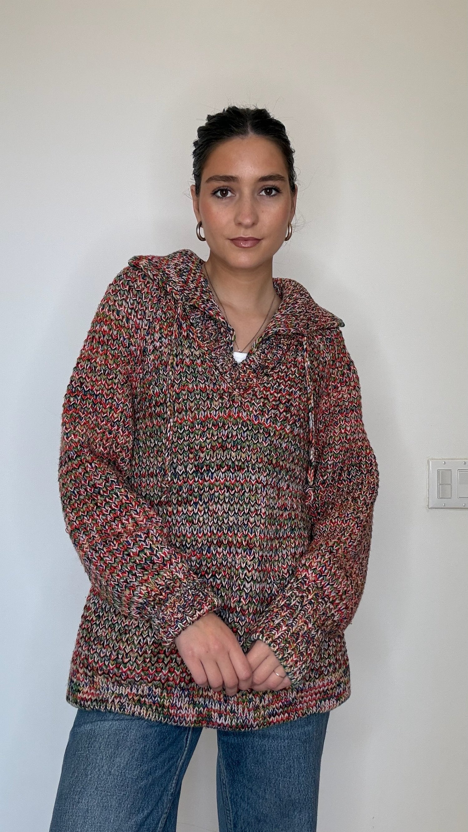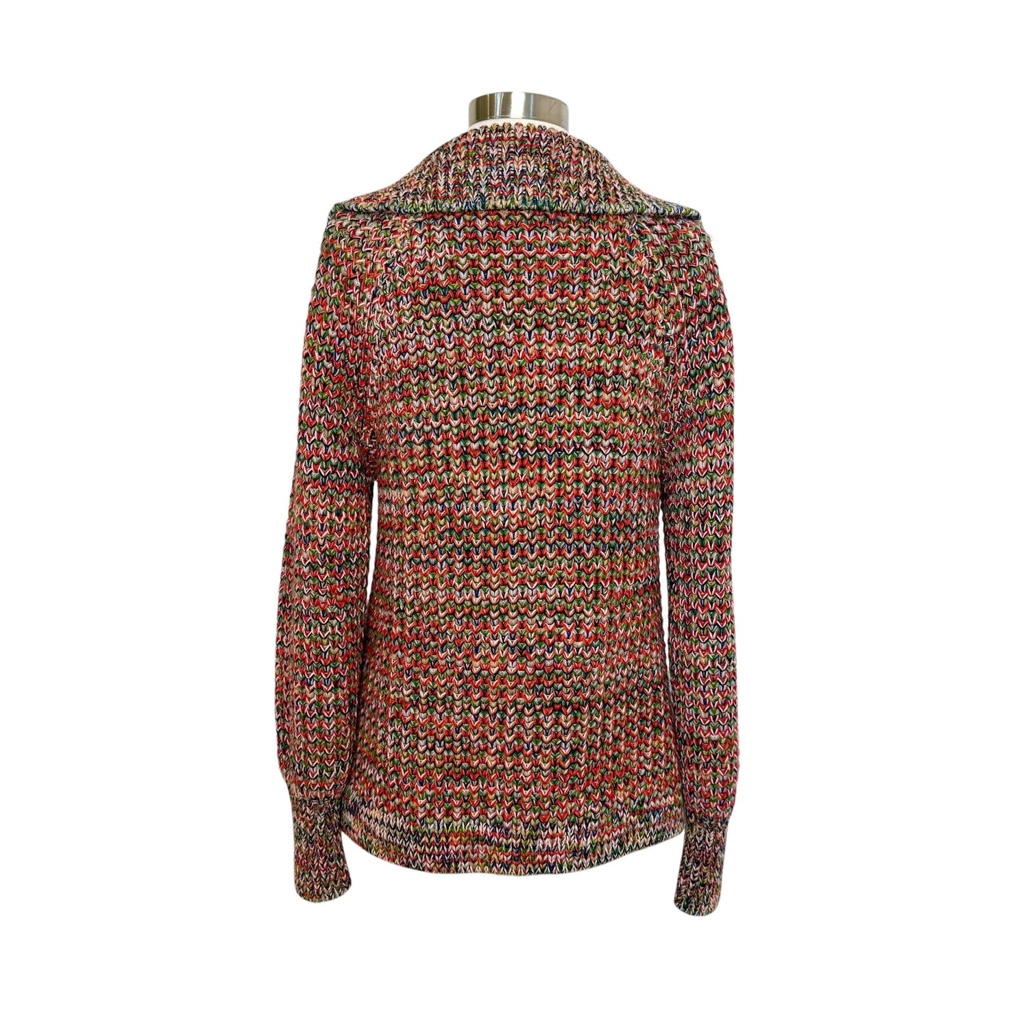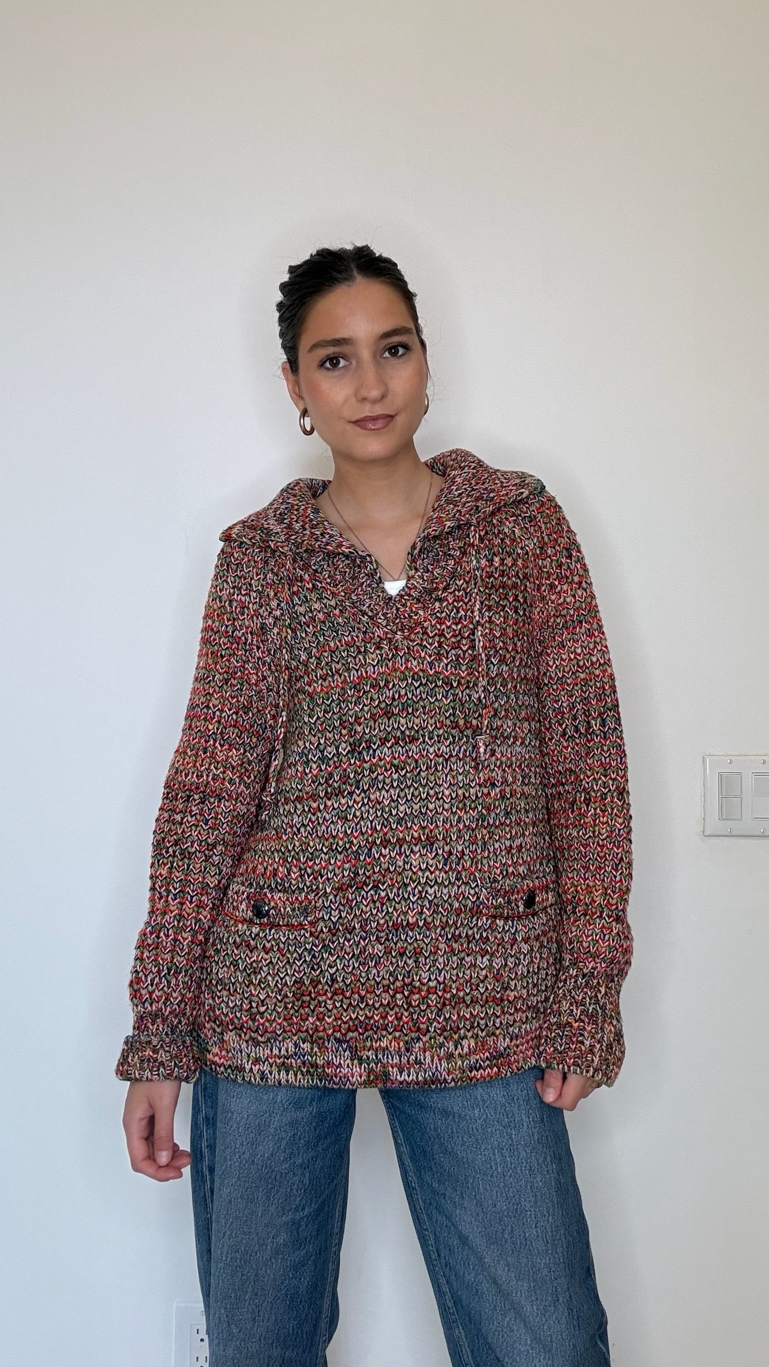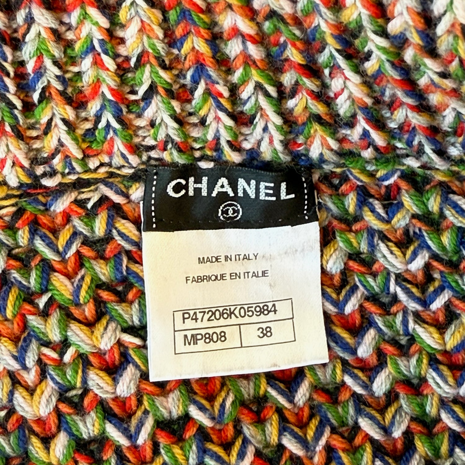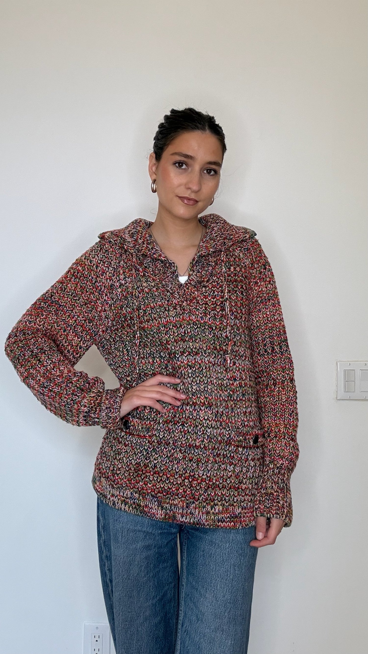 Chanel airline collection sweater. Multicolor wool knits. Drawstring at collar. Large CC buttons at front pockets. Designer size 38.