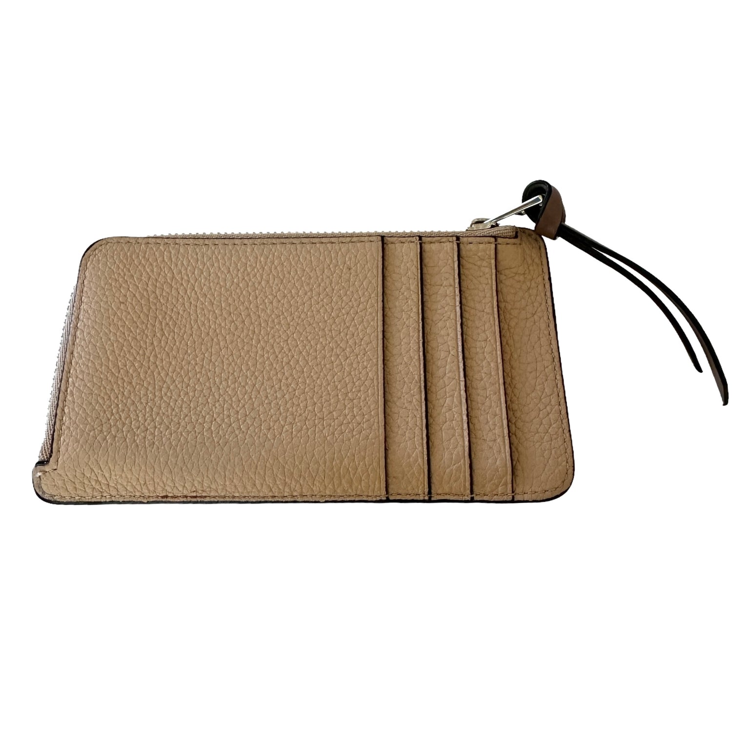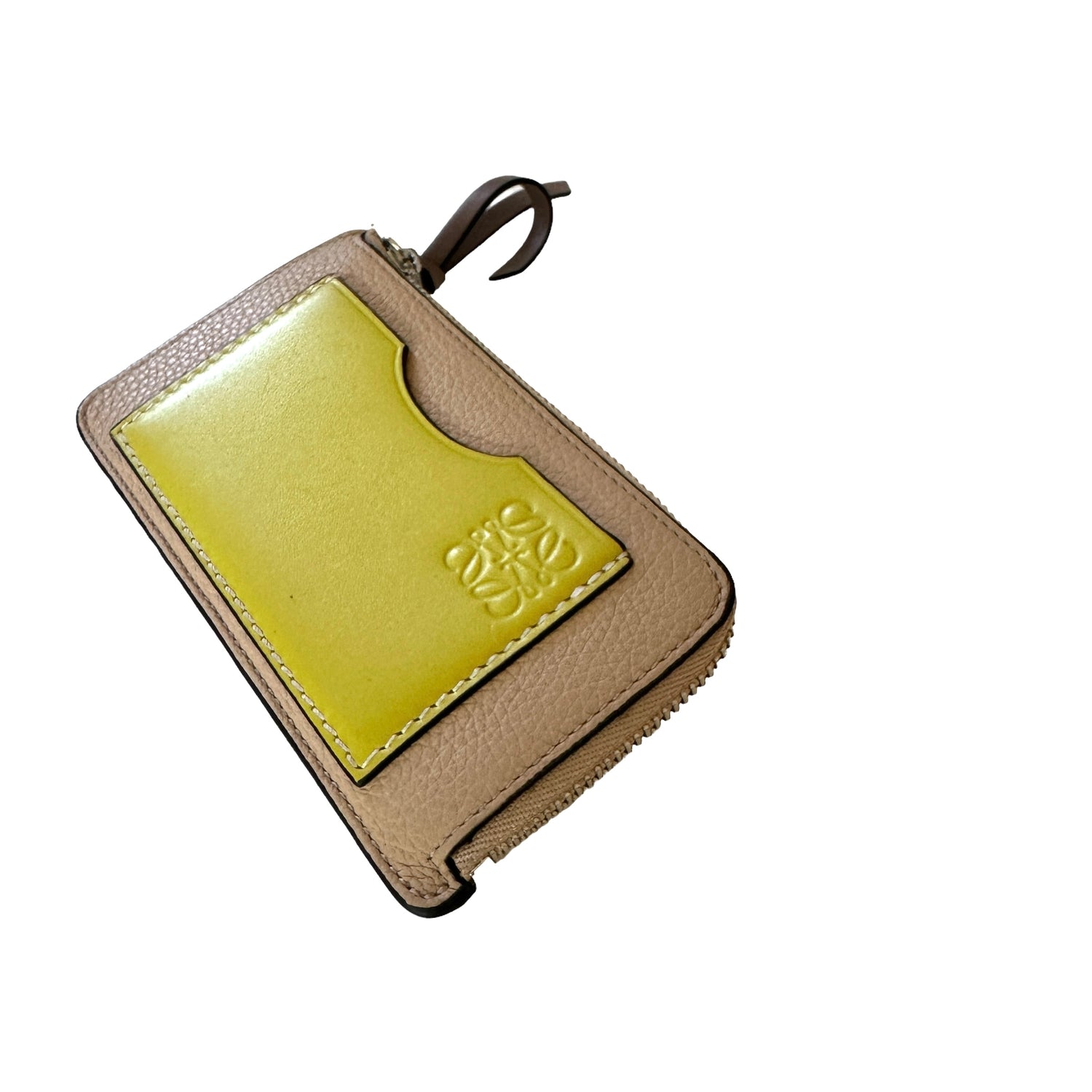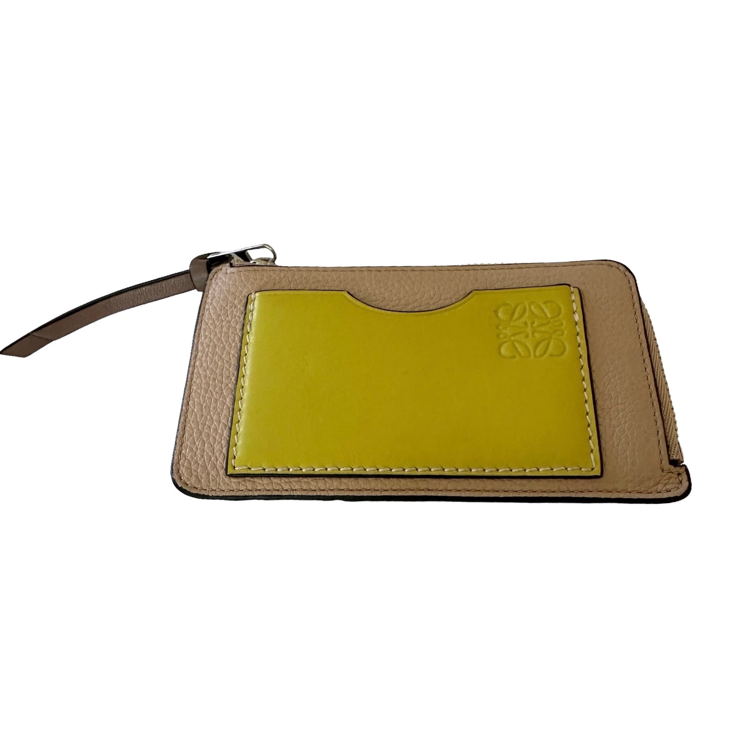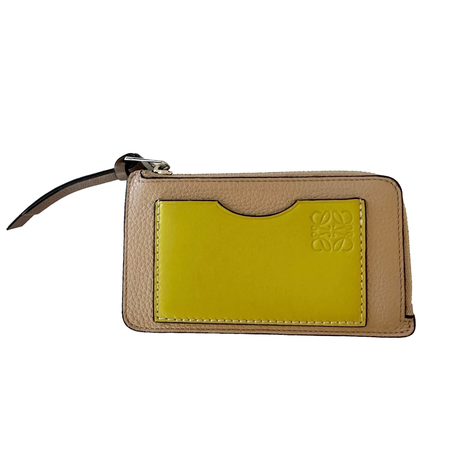 Loewe bicolor wallet. Nude leather with yellow pocket with anagram logo. Zipper closure. Multiple card slots.