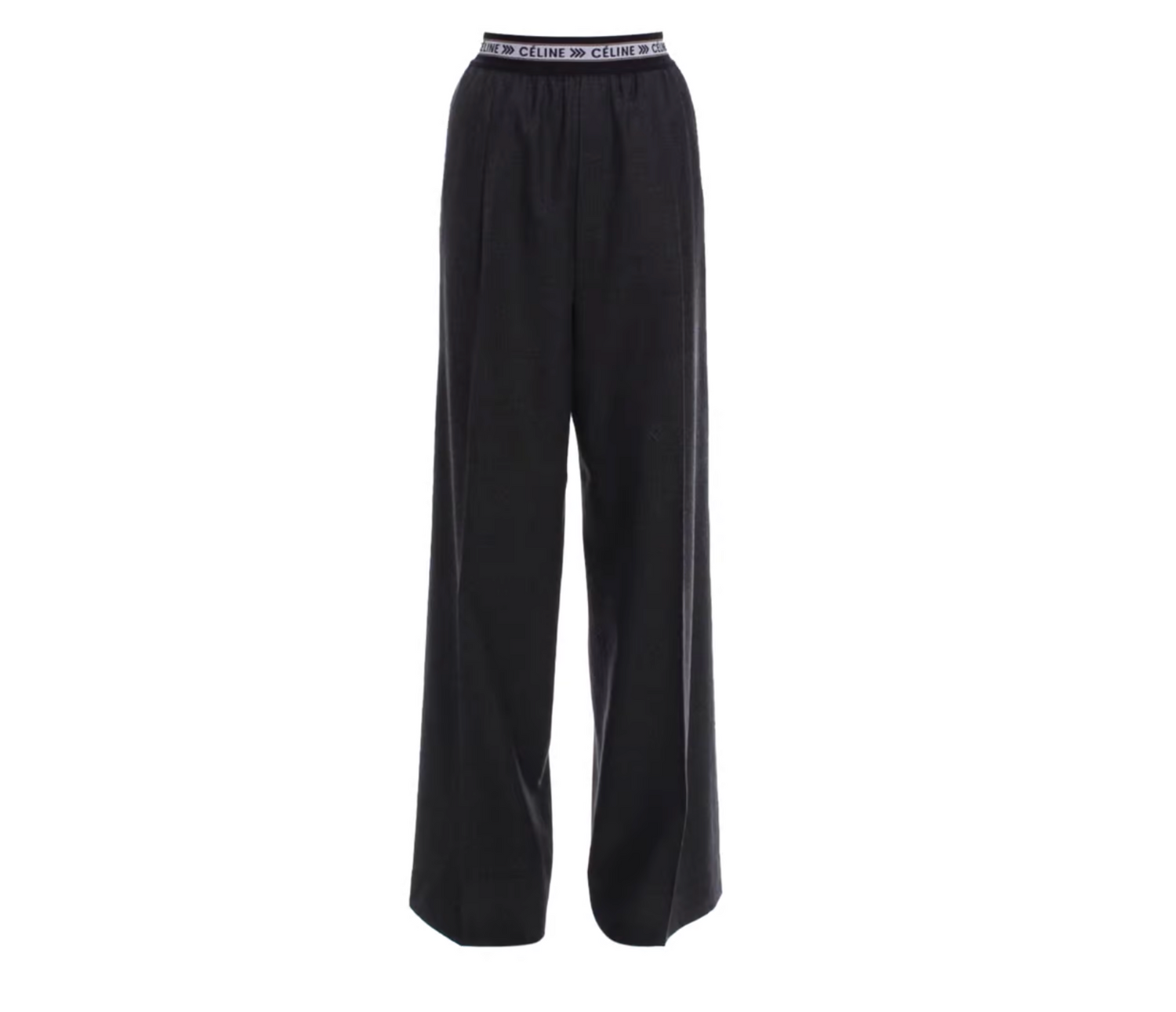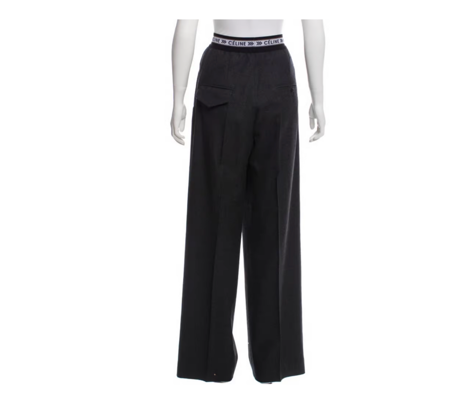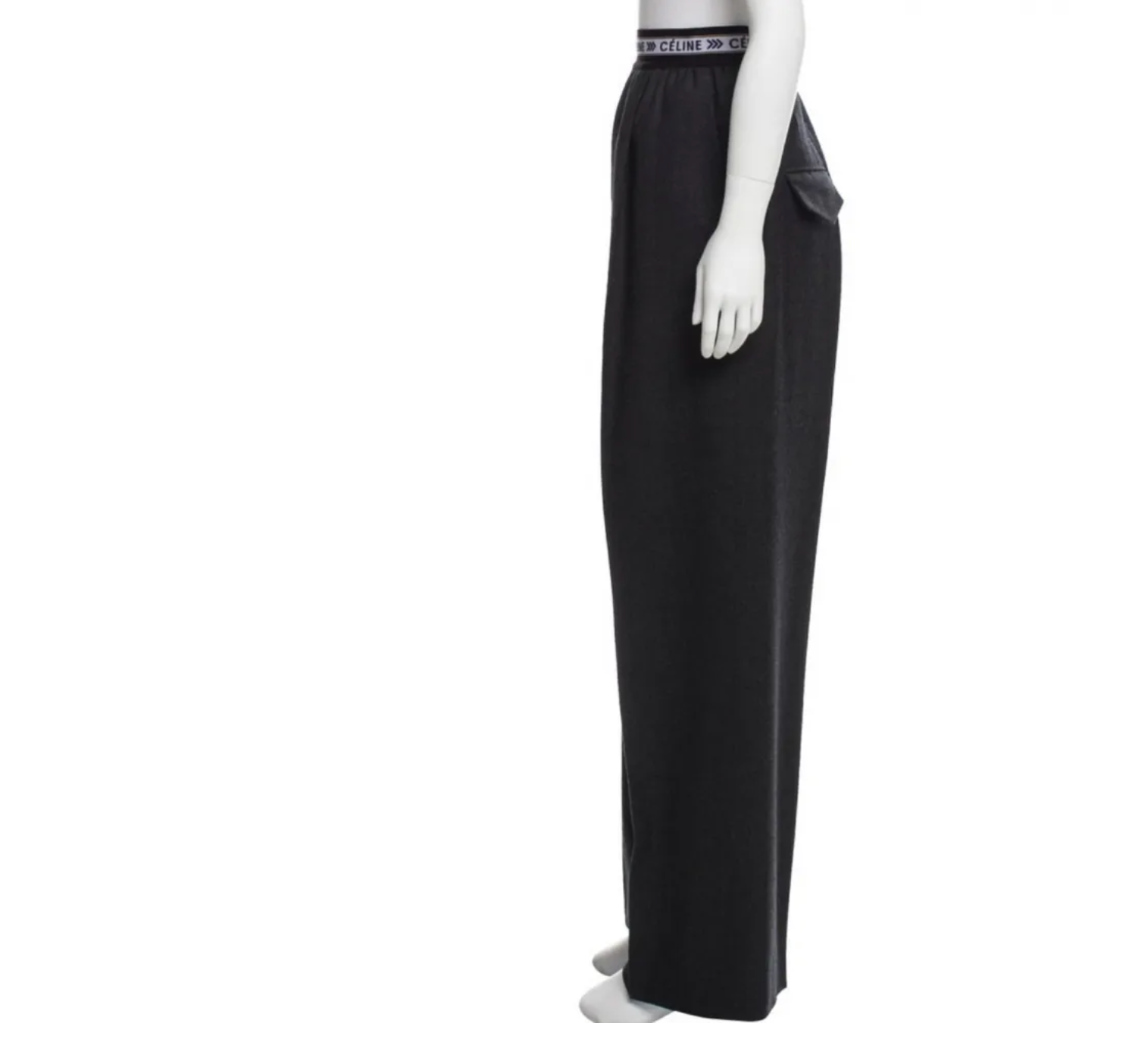 Phoebe Philo Collection. Grey Céline wool high-rise wide-leg pants with four pockets, branded waist and dart accents at waist.