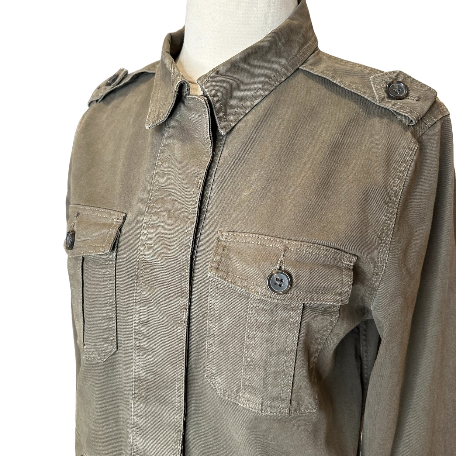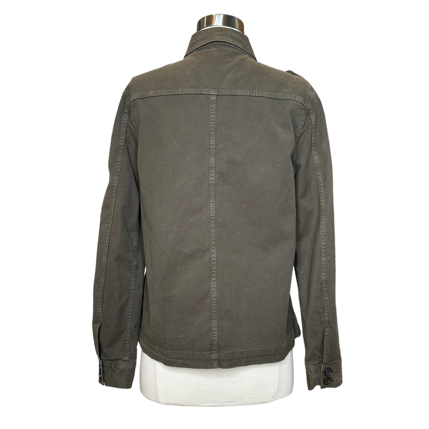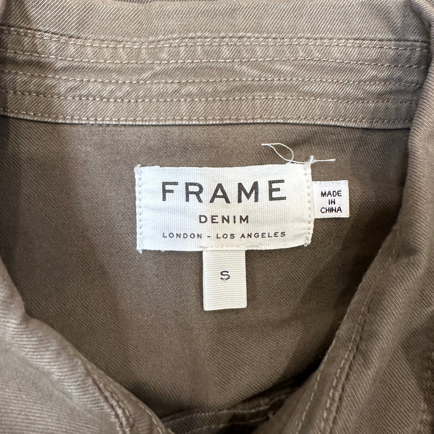 Frame utility jacket. Army green. Button closure at front with pointed collar. Button patch pockets. Designer size Small.