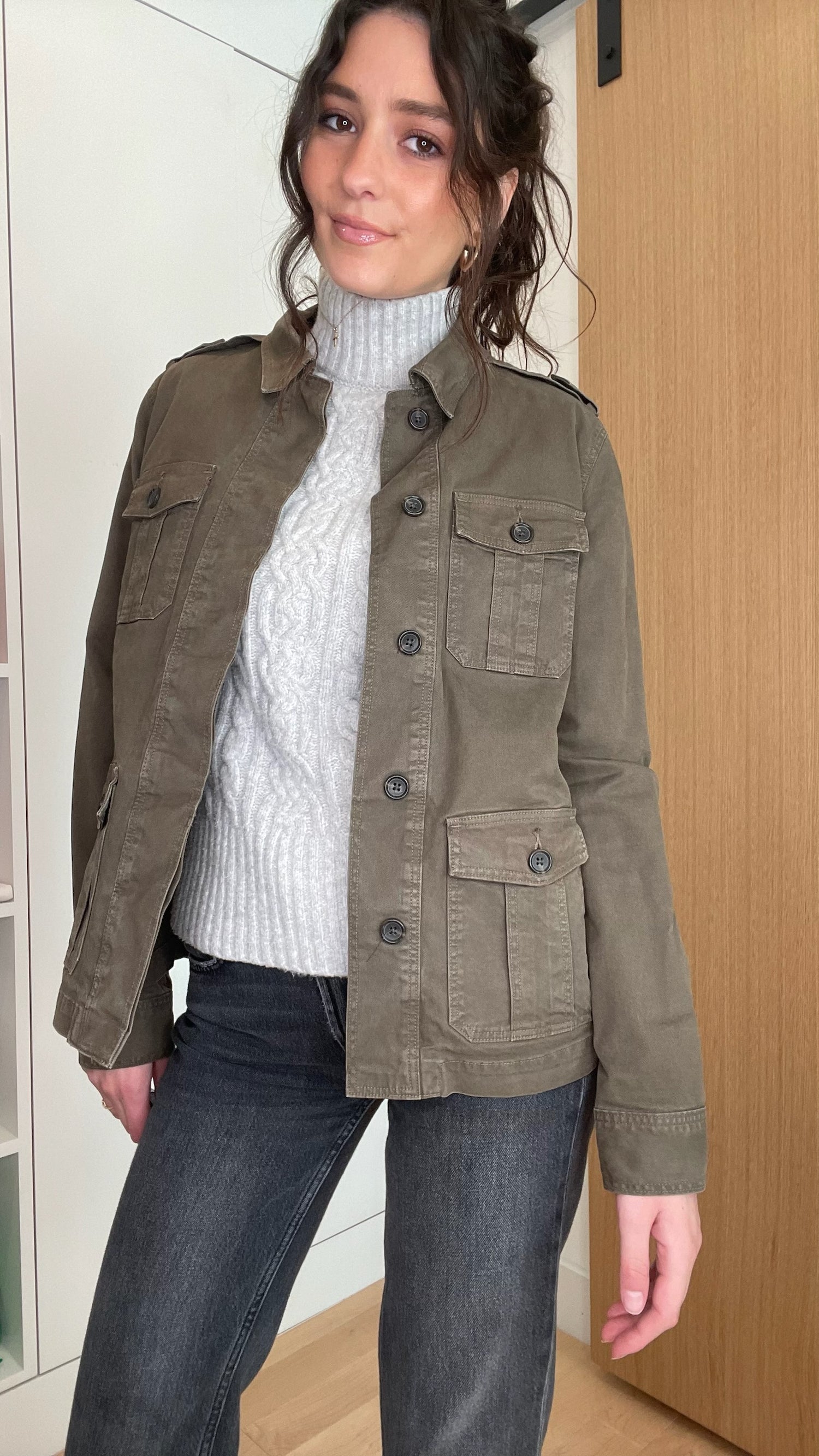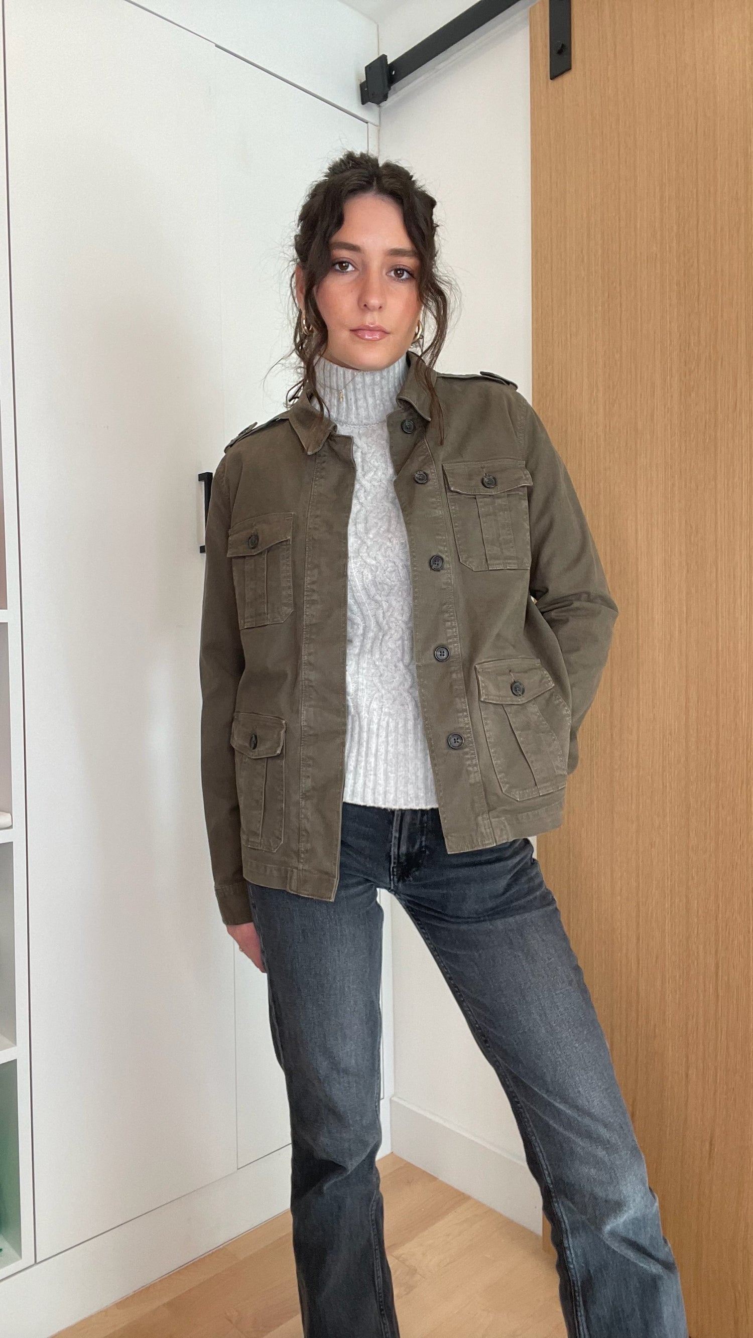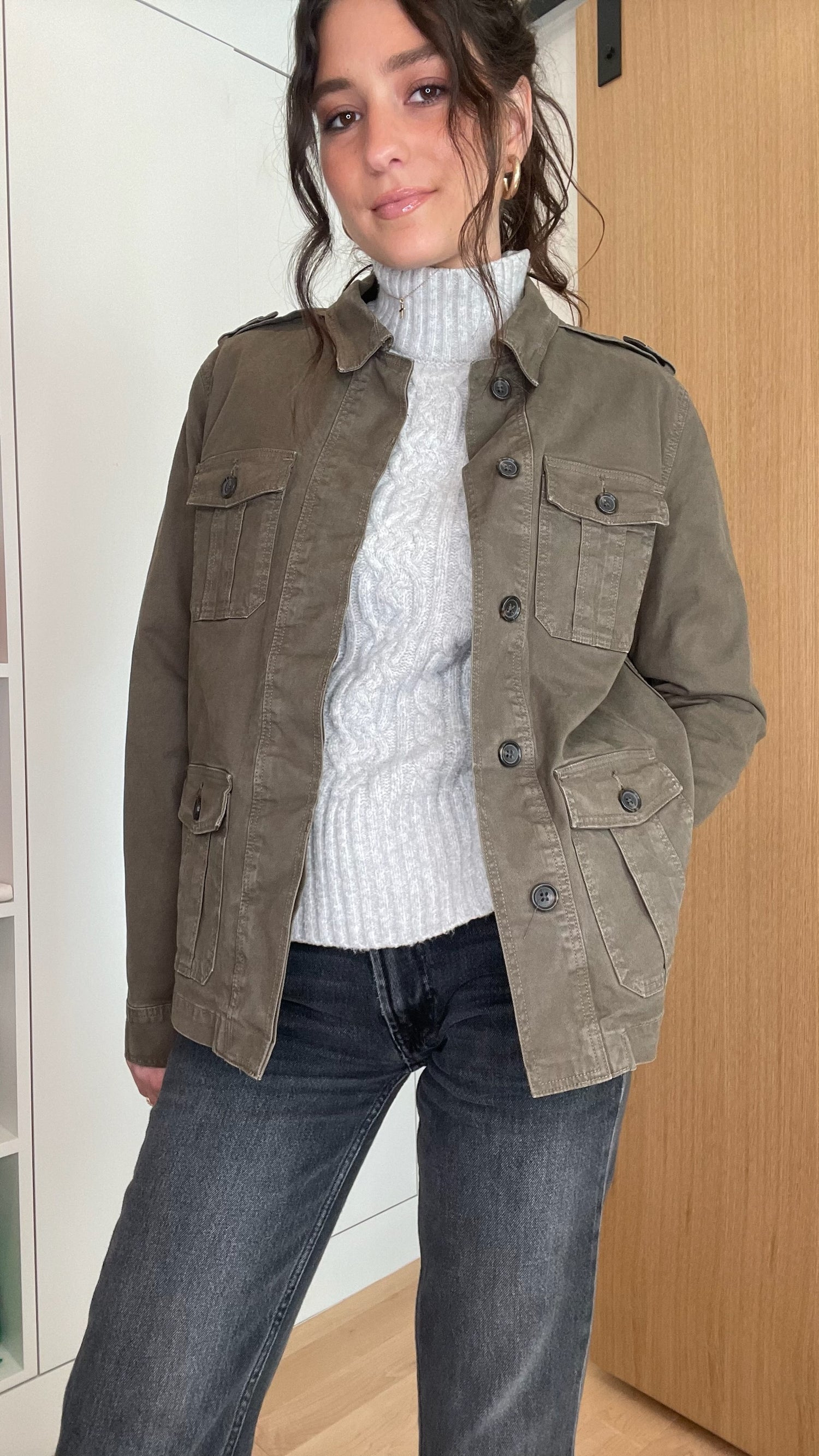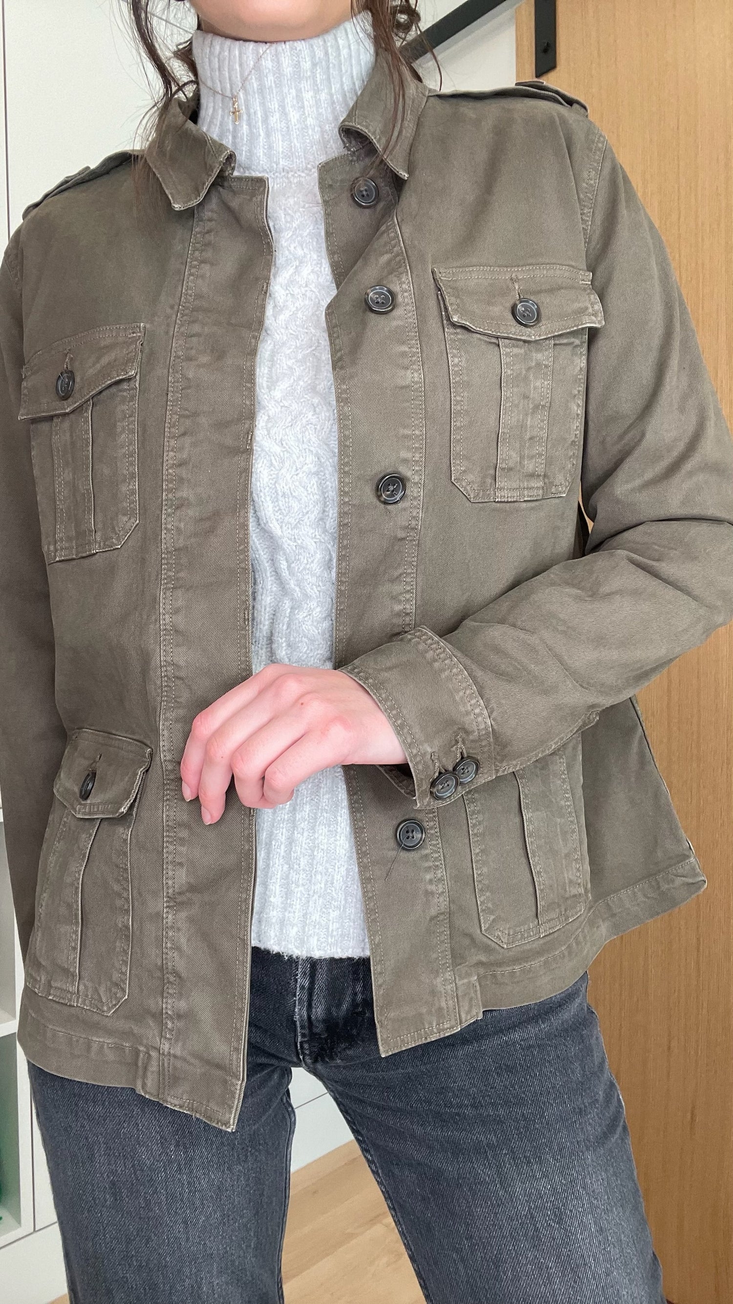 Frame utility jacket. Army green. Button closure at front with pointed collar. Button patch pockets. Designer size Small.