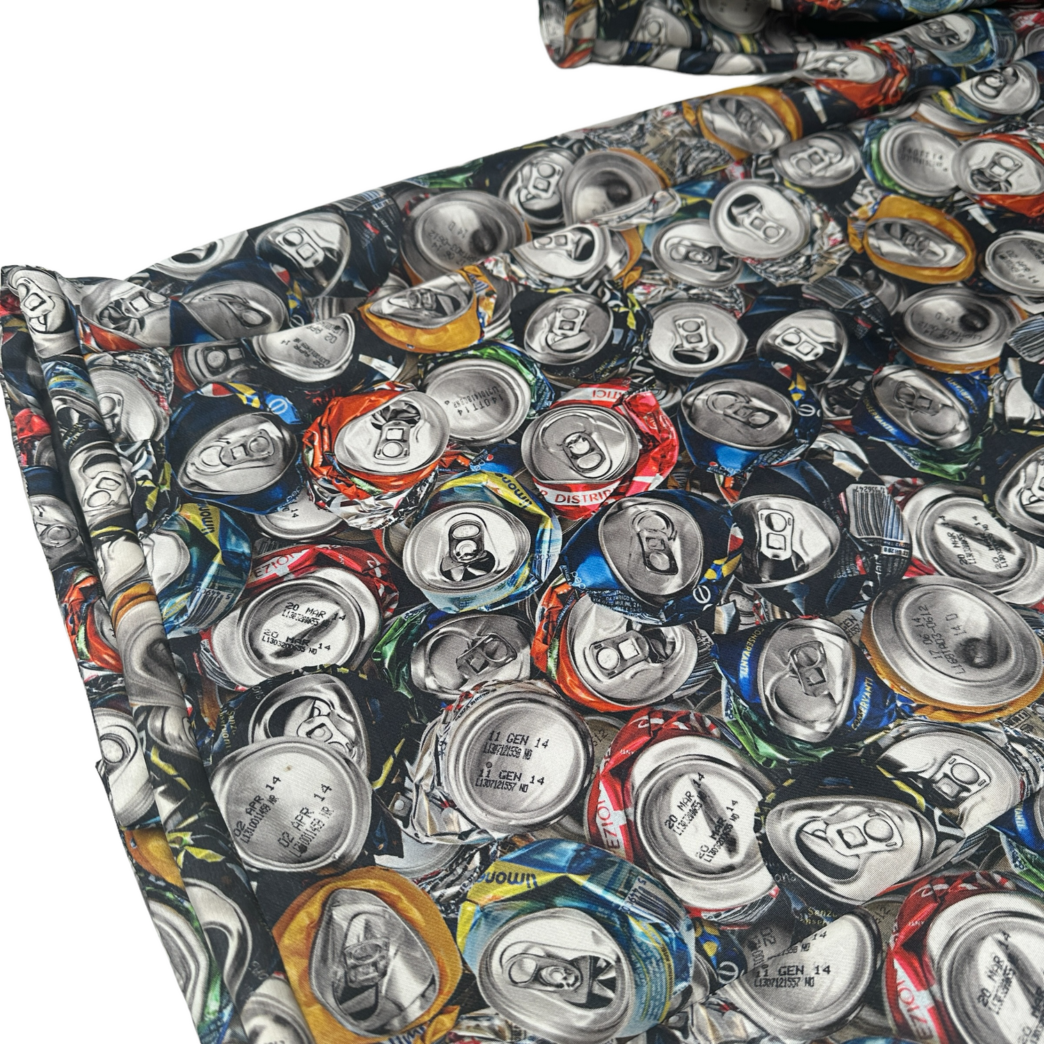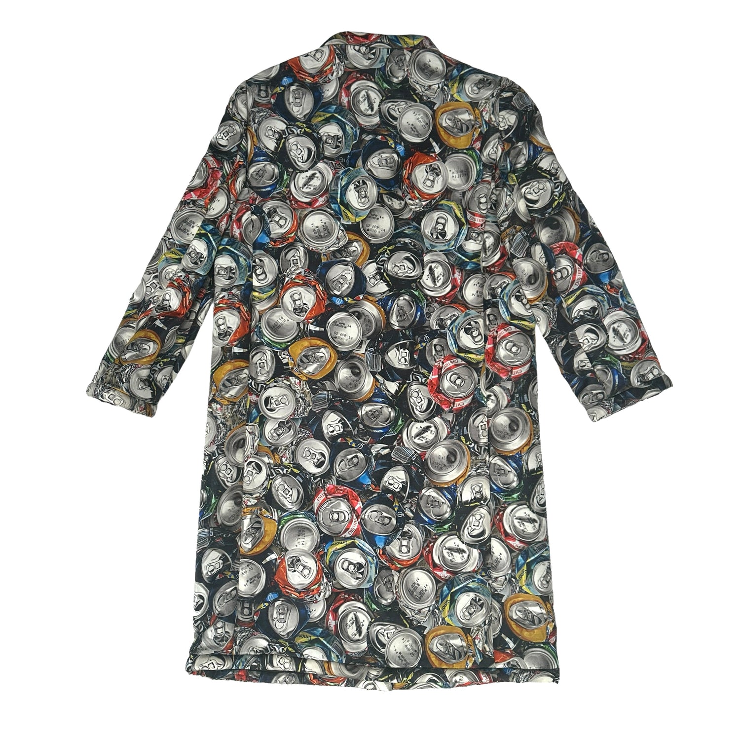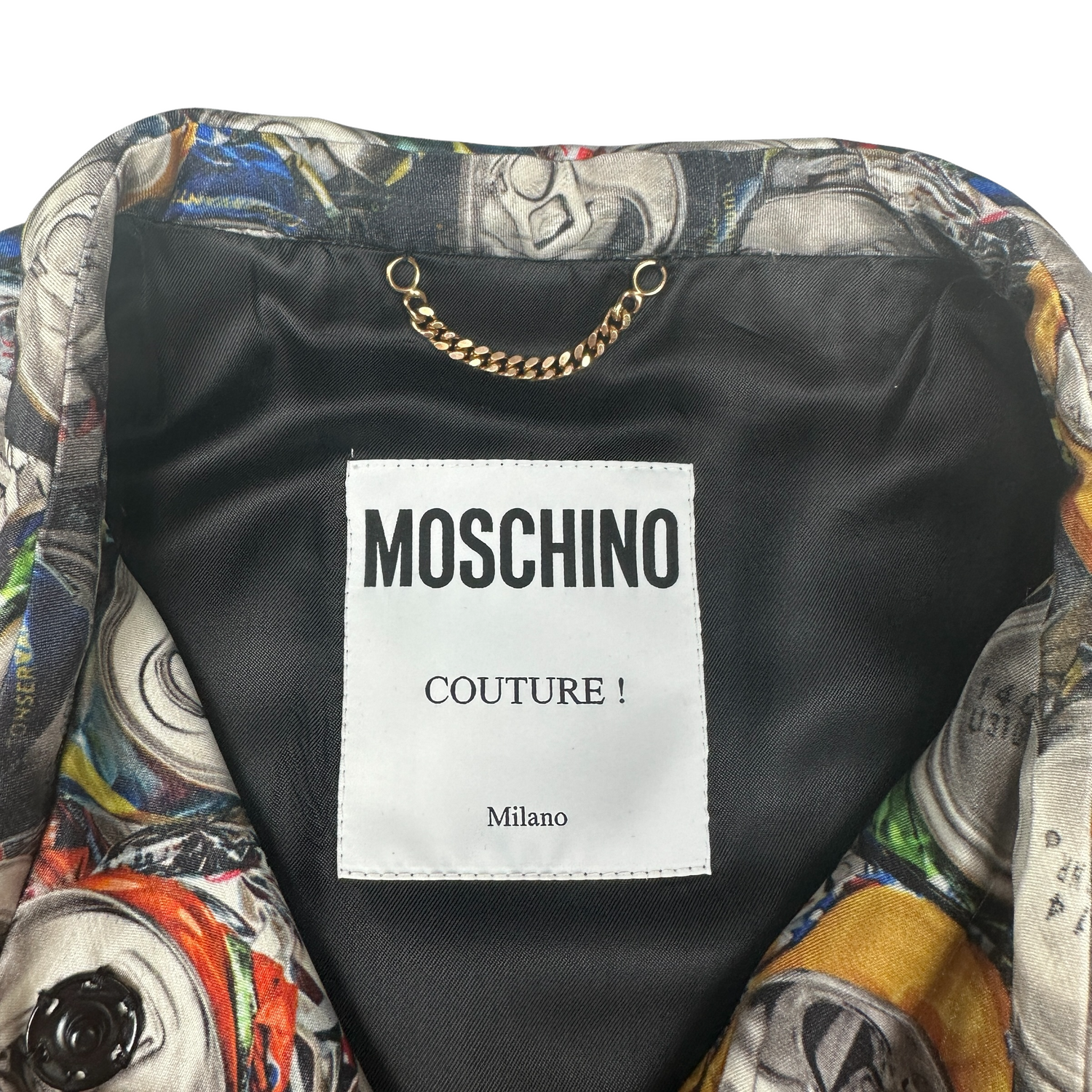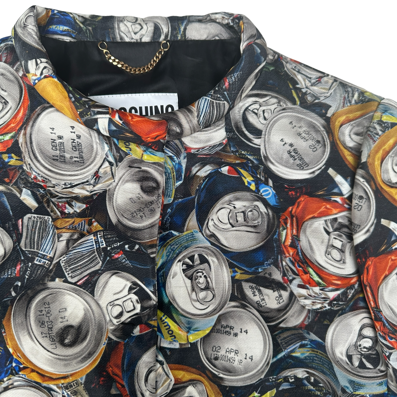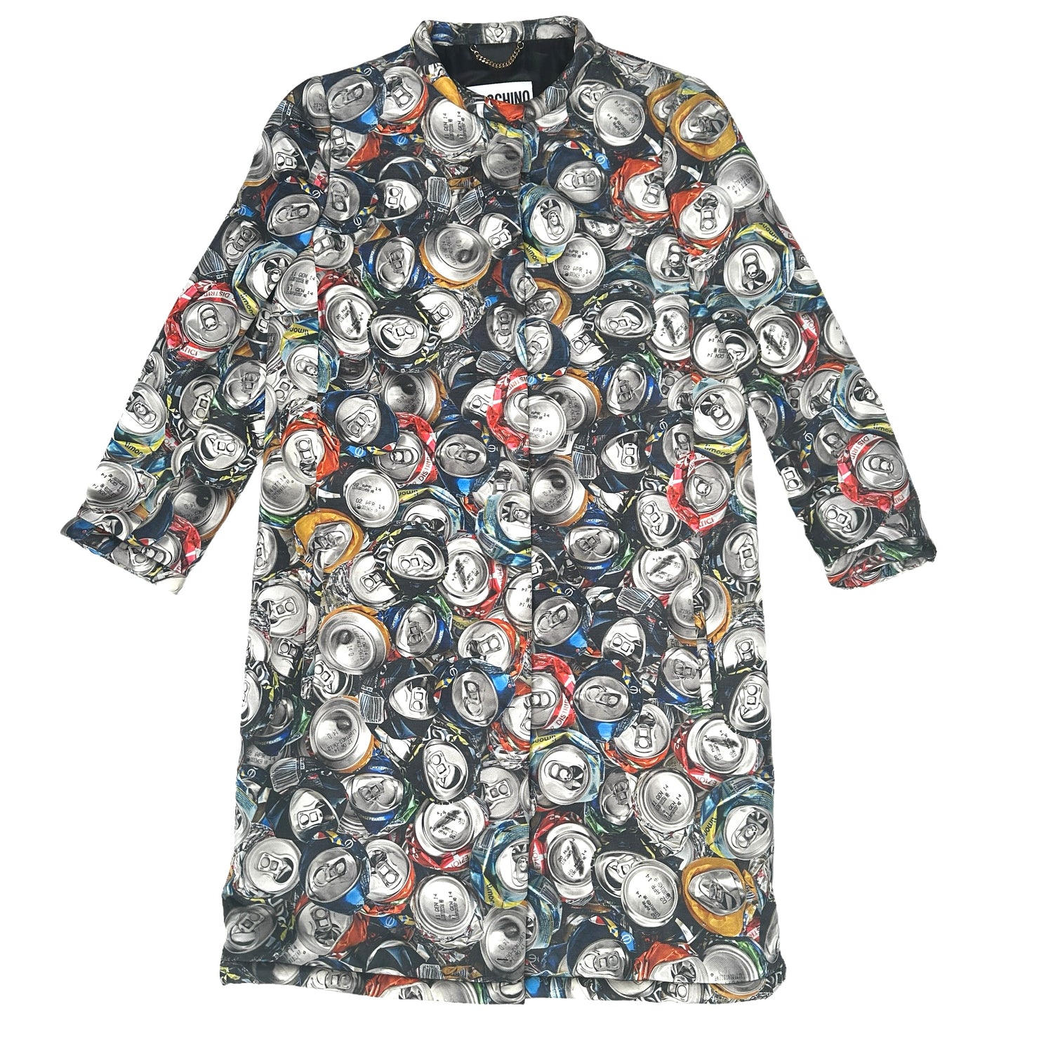 Moschino cans print coat. Concealed snap buttons at front. Round neck. Two slit pockets. Lightweight fabric. Get ready to definitely make an impression in this statement coat!