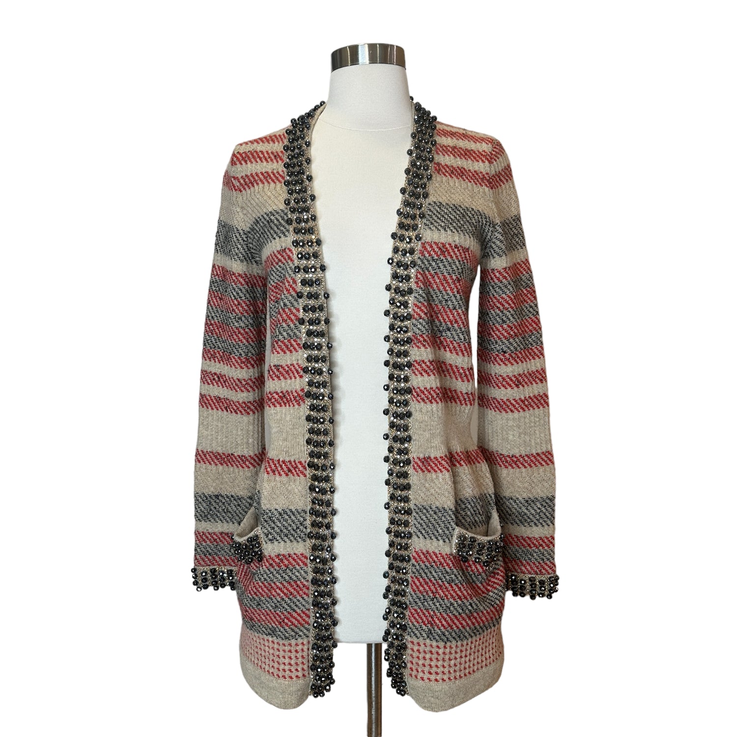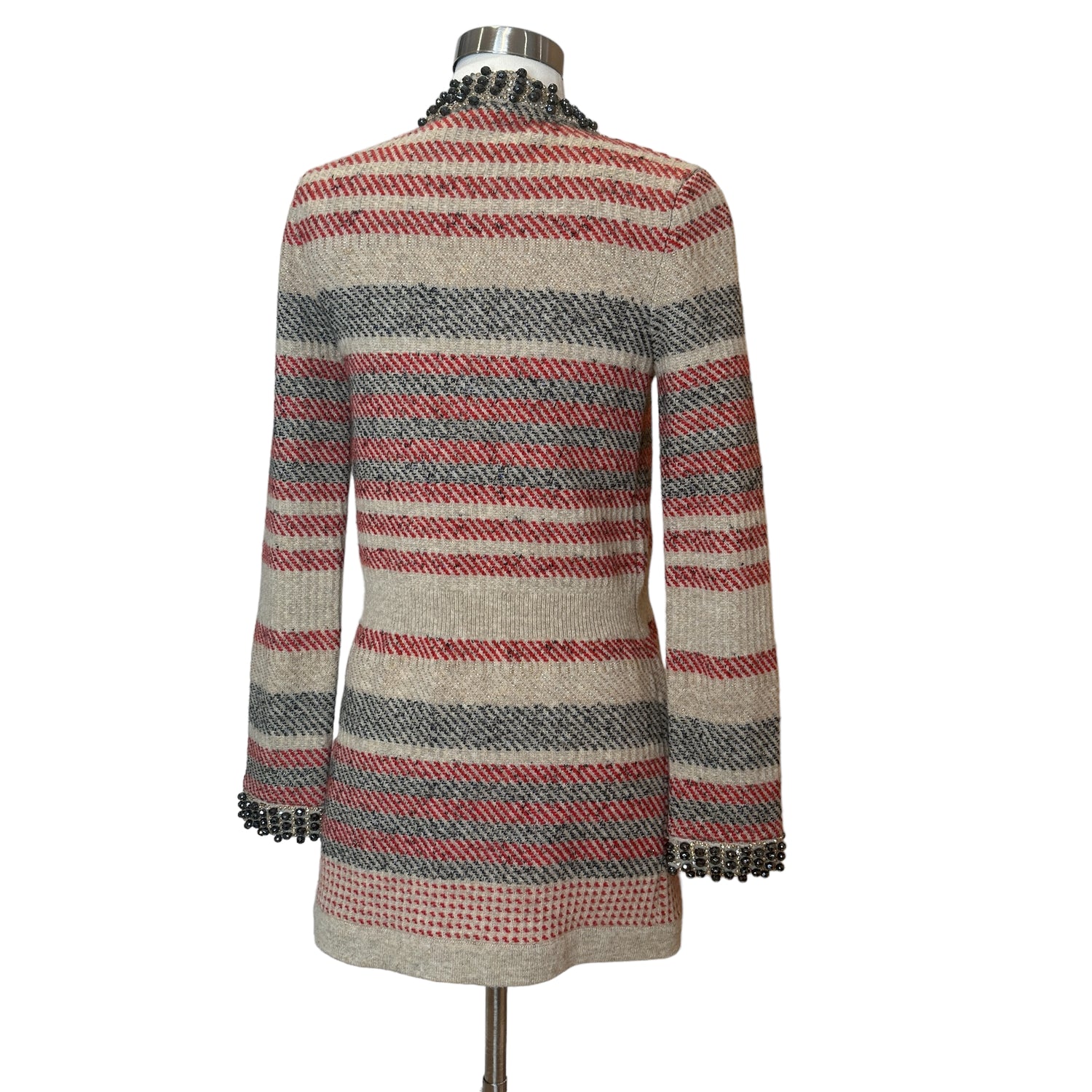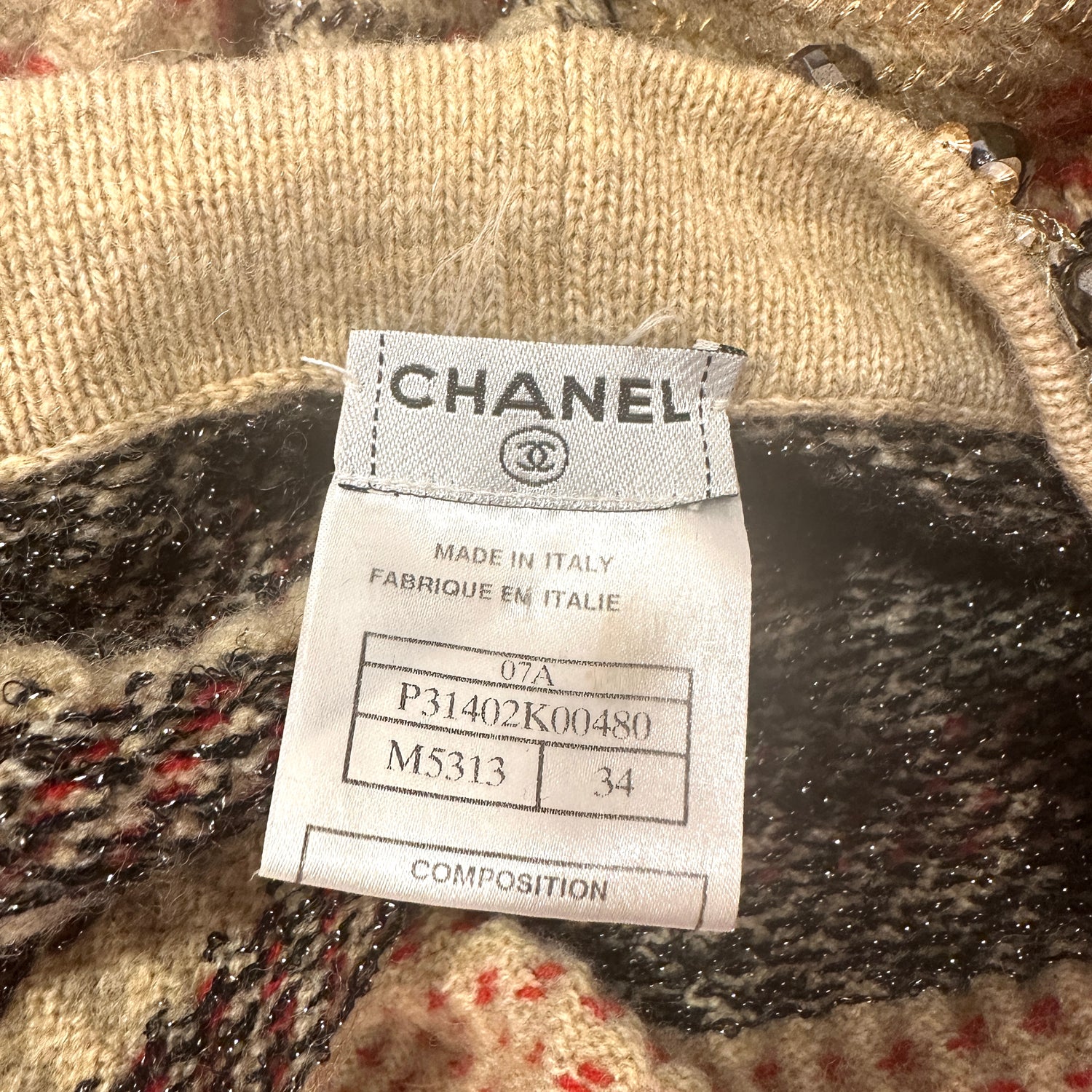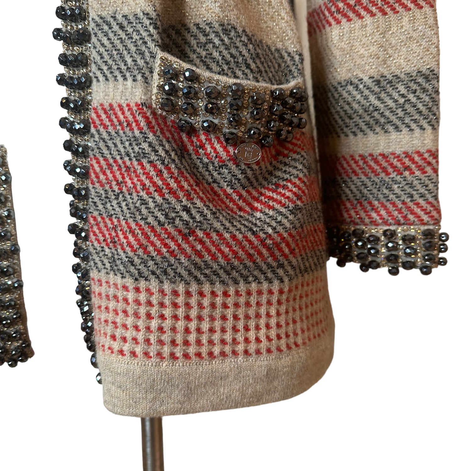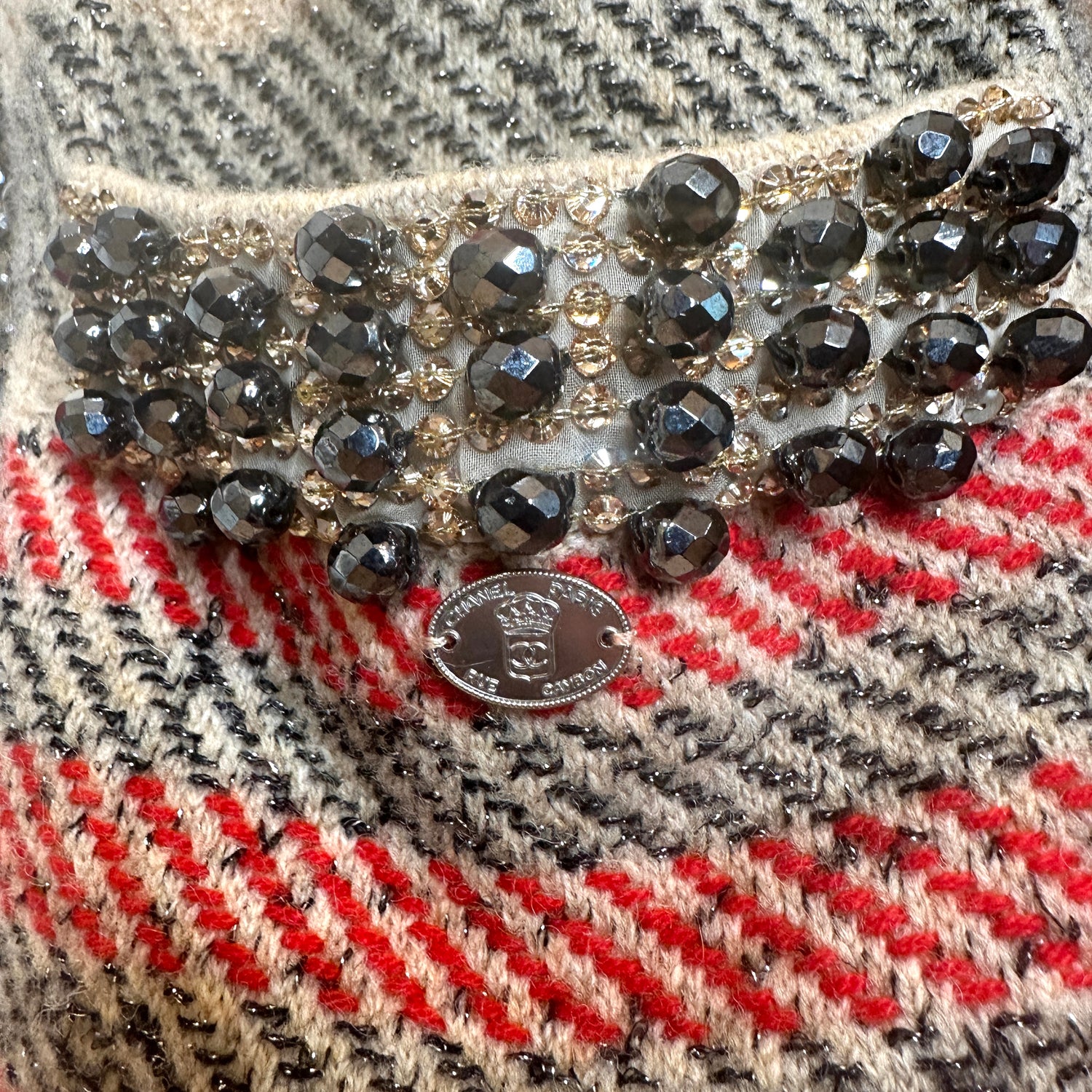 Chanel cardigan. Fall 2007 collection by Karl Lagerfeld. Cream with red, black and metallic gold threads. CC pin logo in silver hardware. Two pockets. Bead and sequins details. Open at front. Designer size 34.