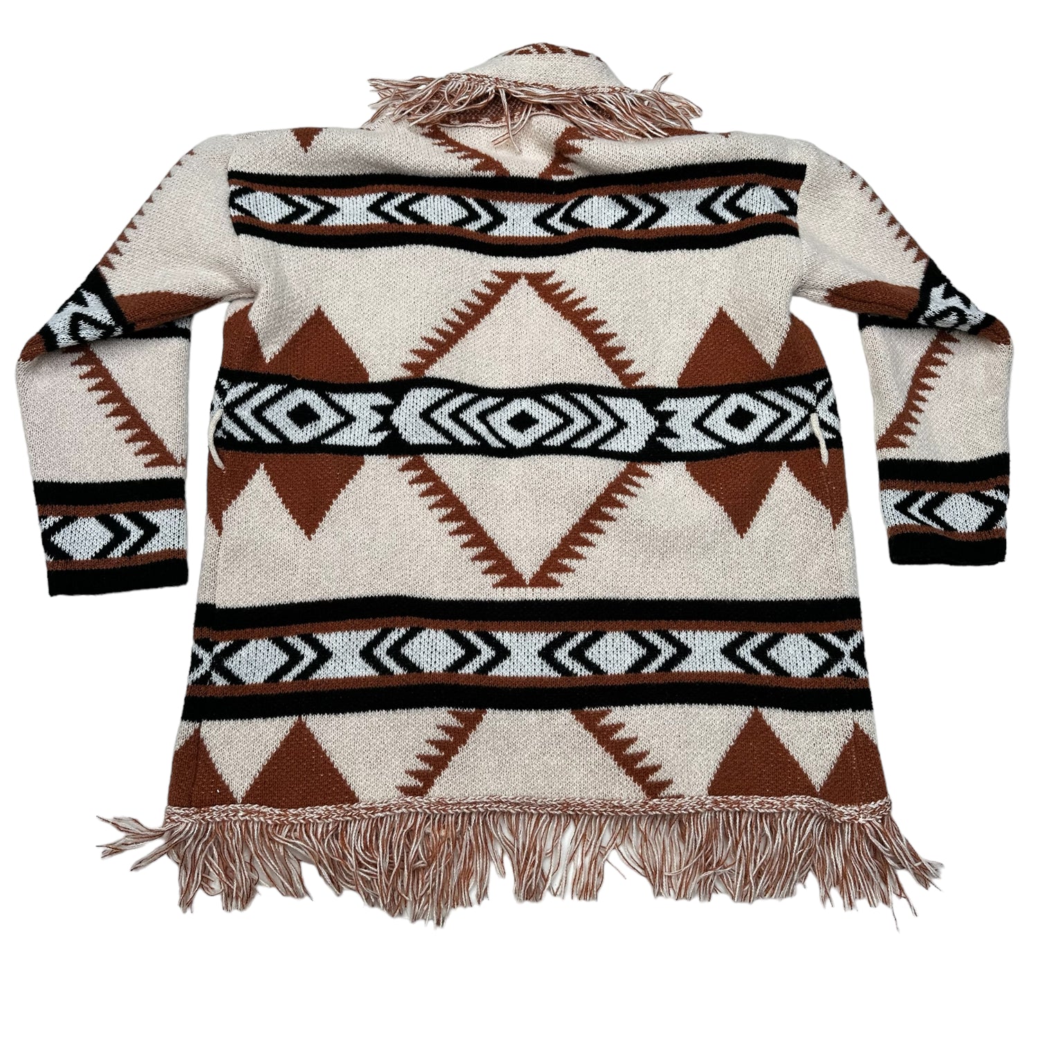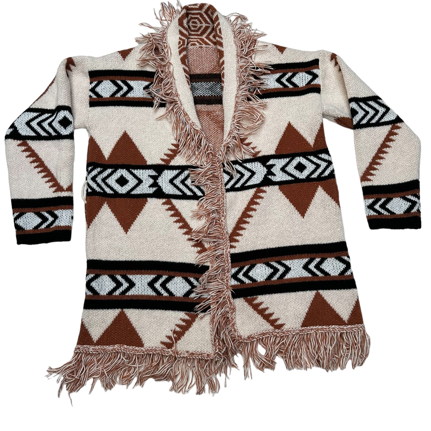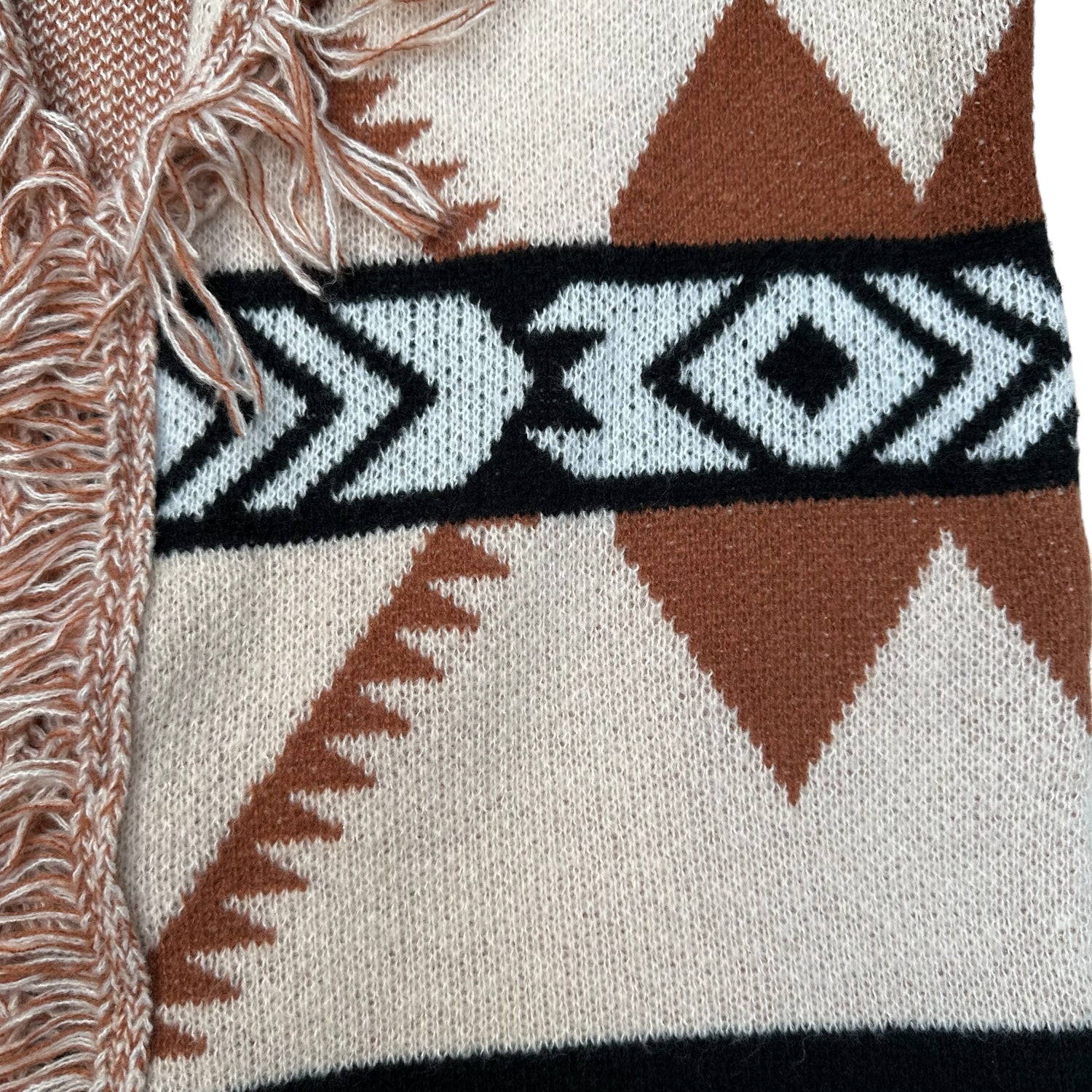 Beige, brown and black fringed sweater. Beautiful pattern. Long sleeves. Perfect for your late summer nights or fall.
