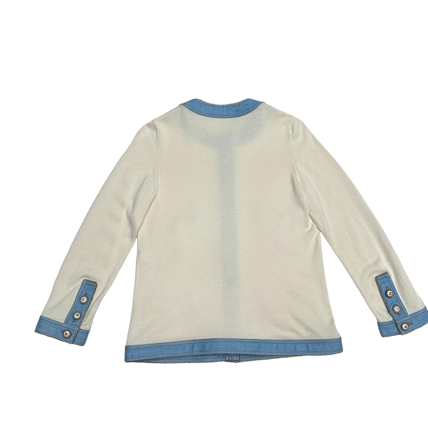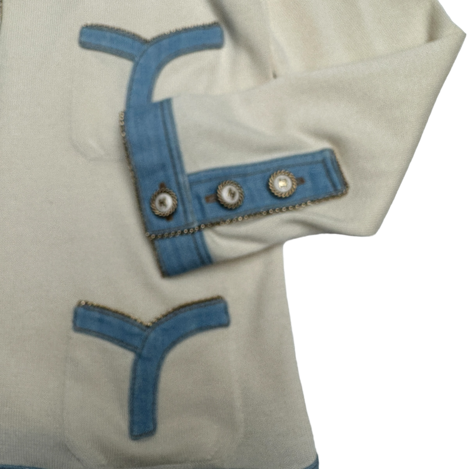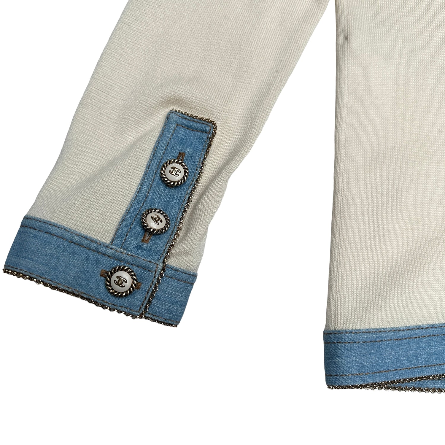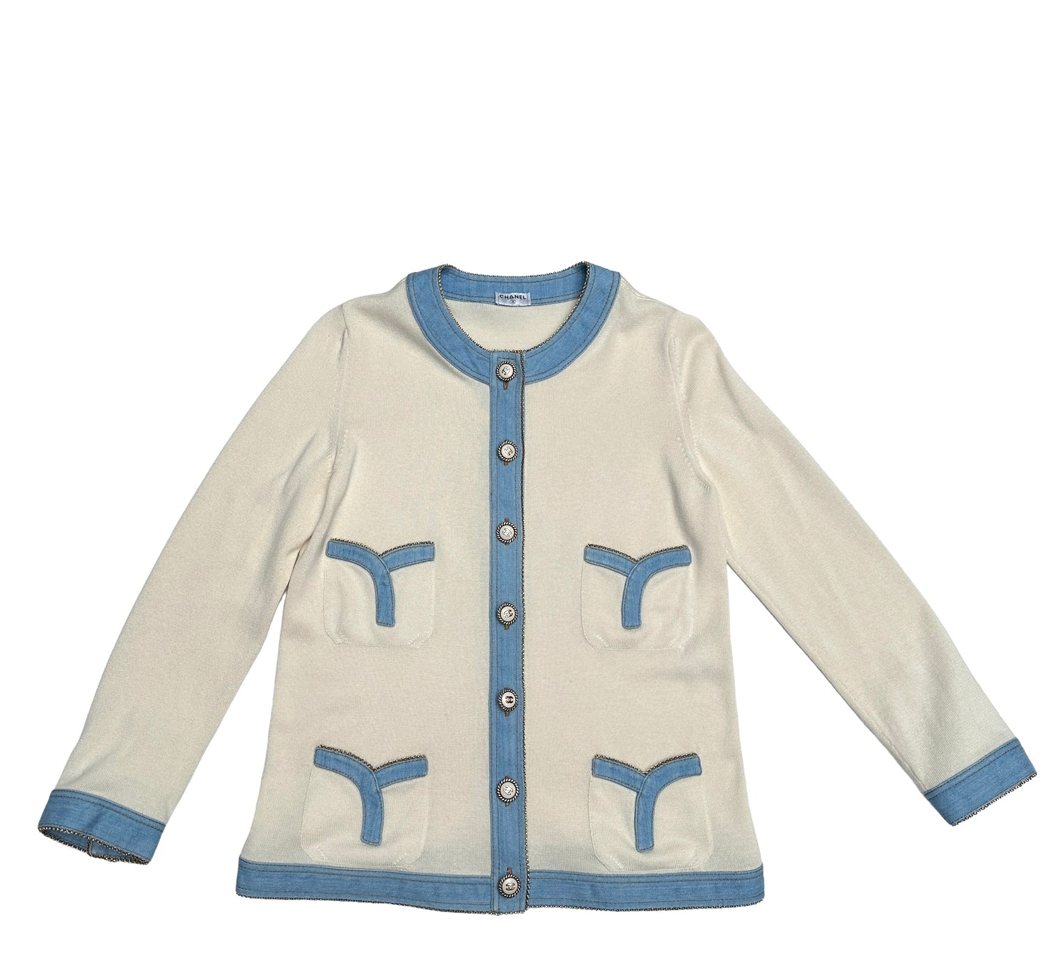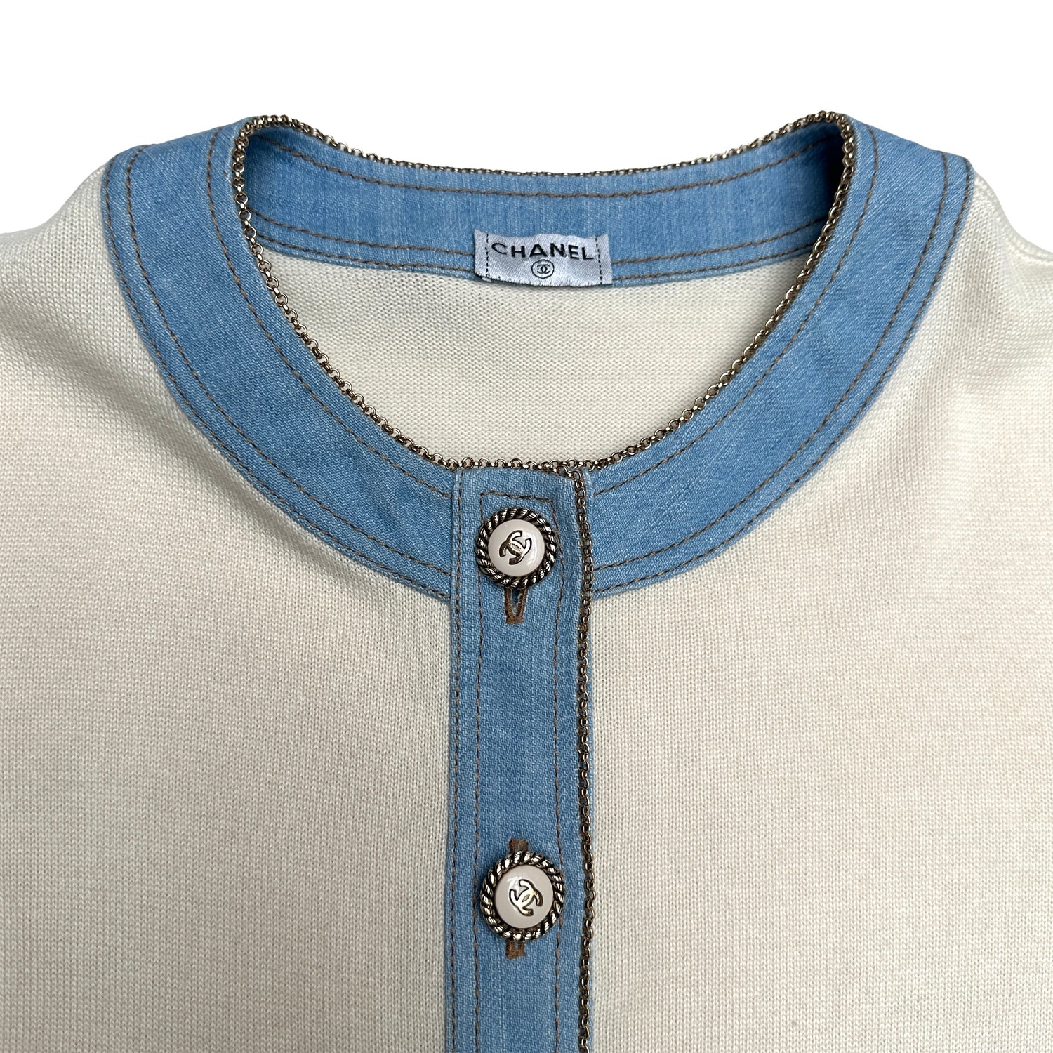 Chanel beige cardigan with denim details. CC logo buttons at front and sleeves. Gold-tone chain details.