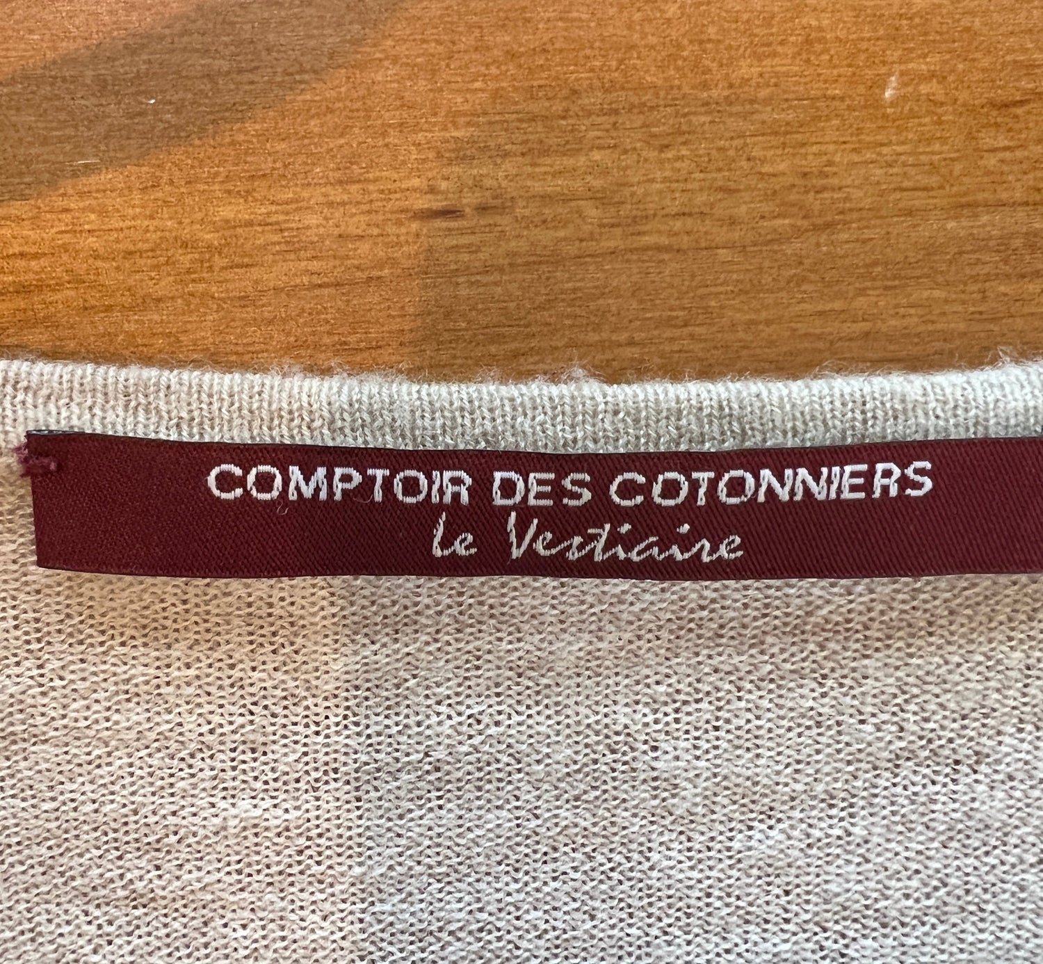 From Parisian Designer Comptoir des Cotonniers, Bateau Neckline. Beige color. Very soft cashmere fabric. A closet go-to!