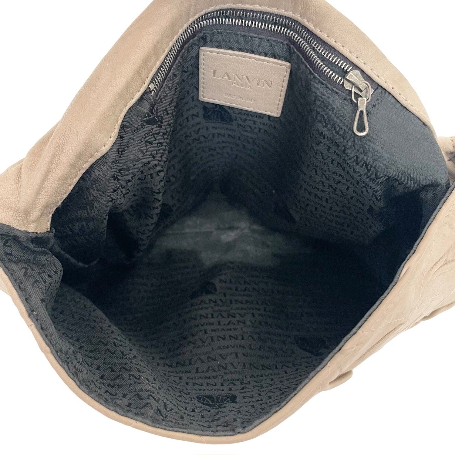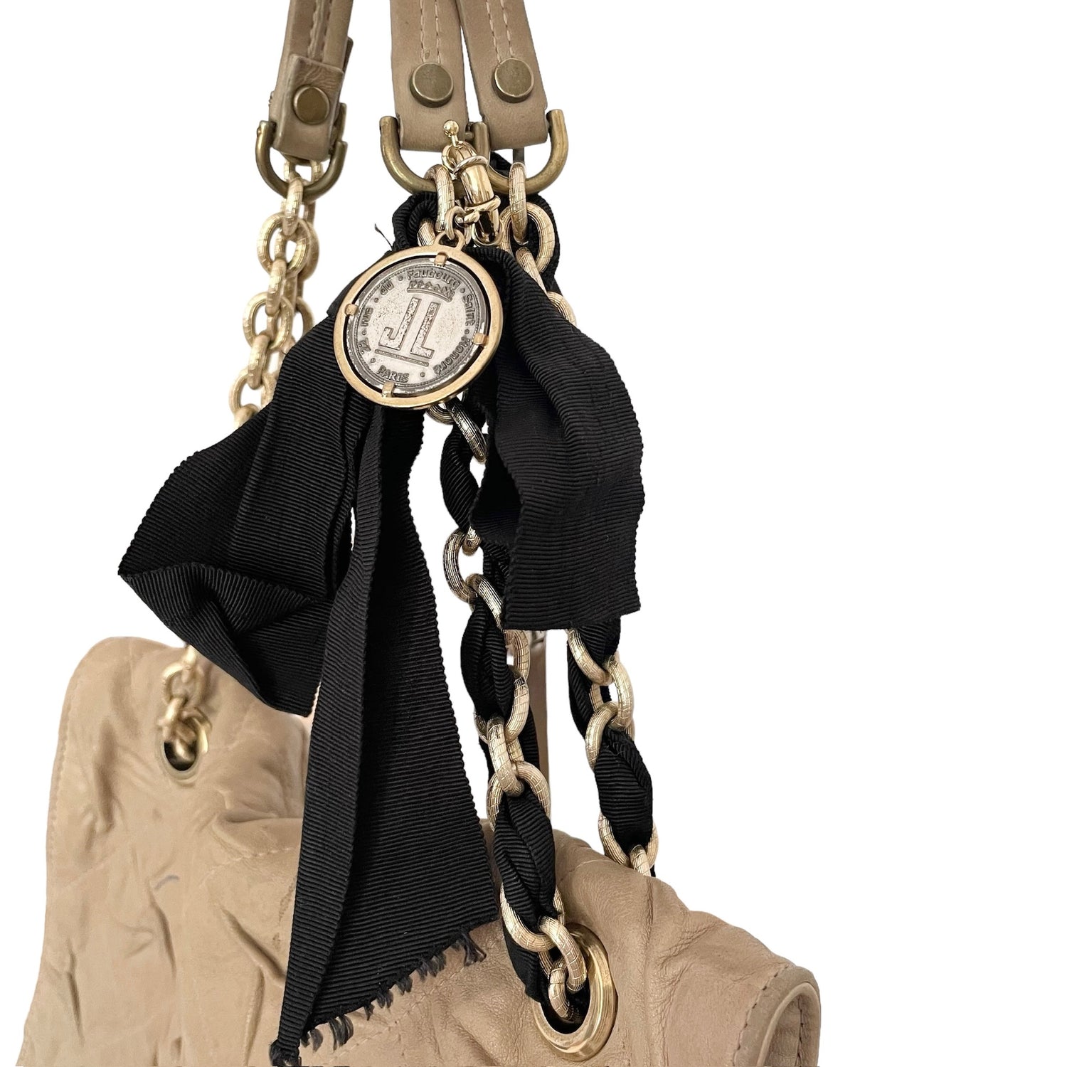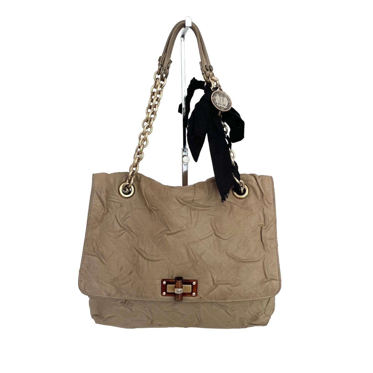 Lanvin beige flap shoulder bag. Gold-tone chain and leather strap. Grosgrain and medallion charms. One interior pocket.