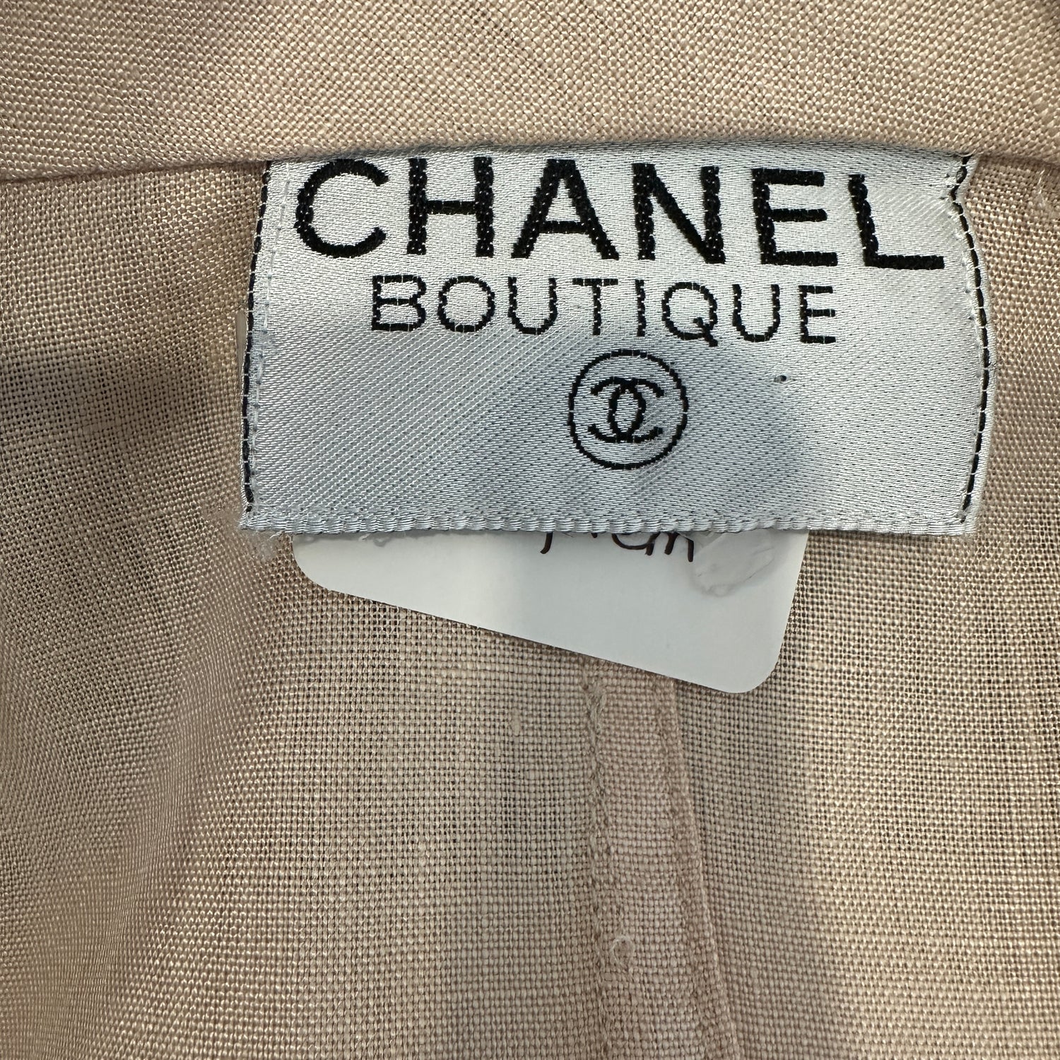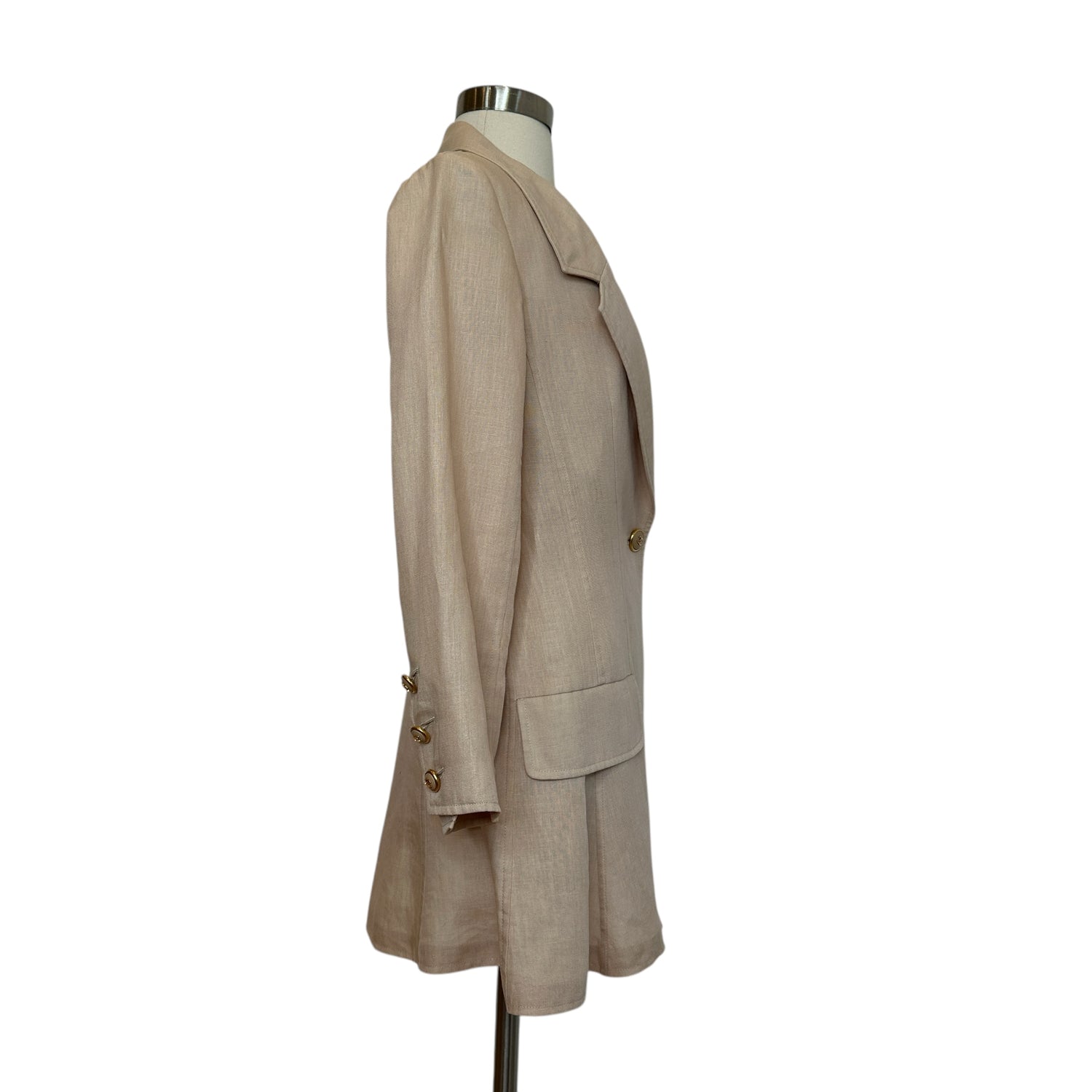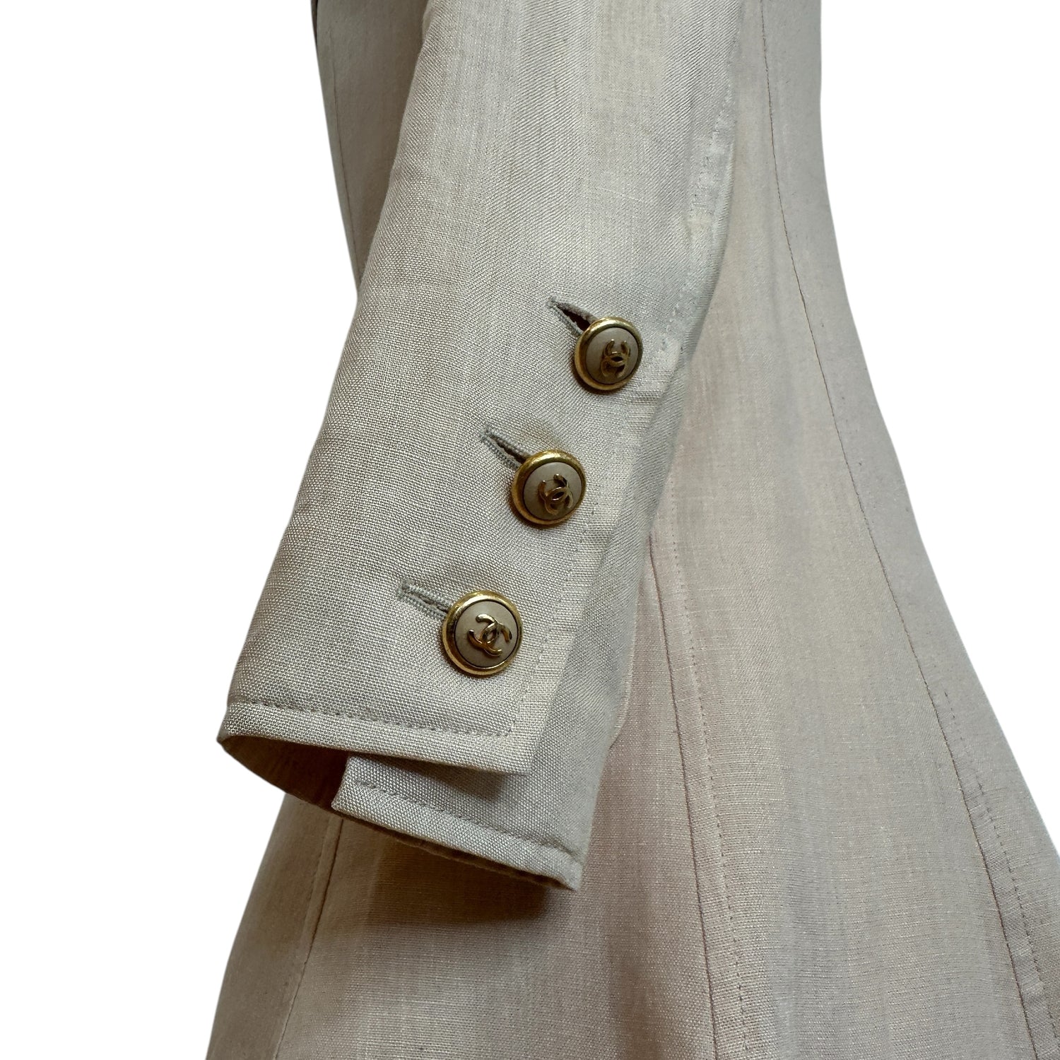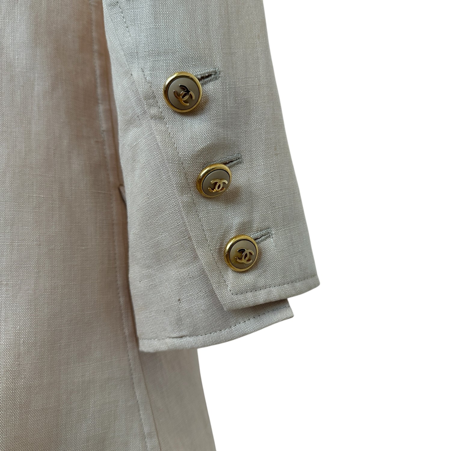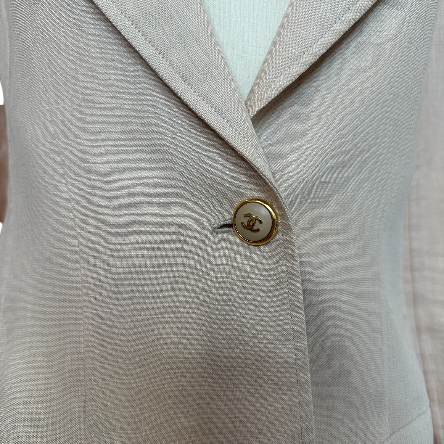 Chanel linen beige blazer. Vintage. Gold-tone CC buttons. Two flap pockets.