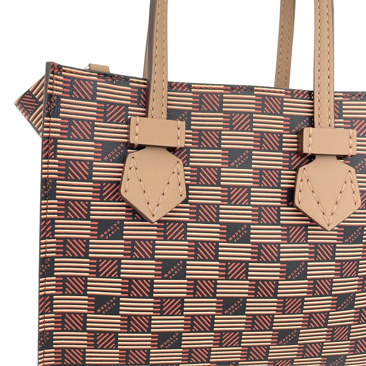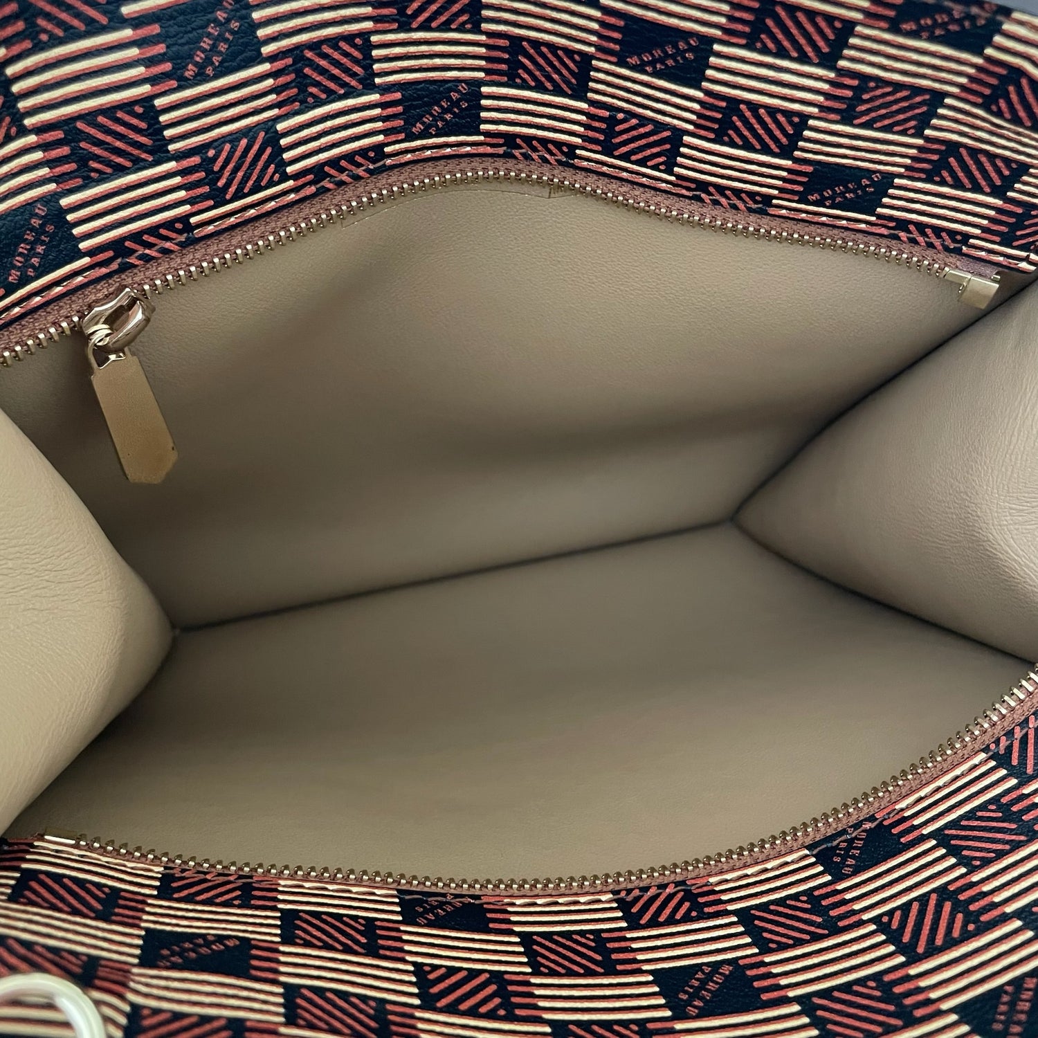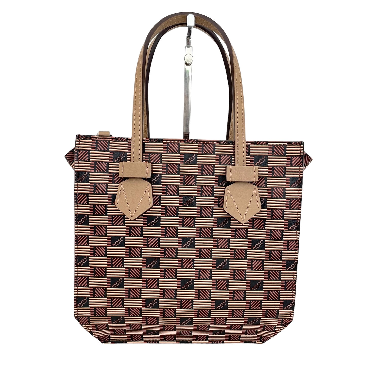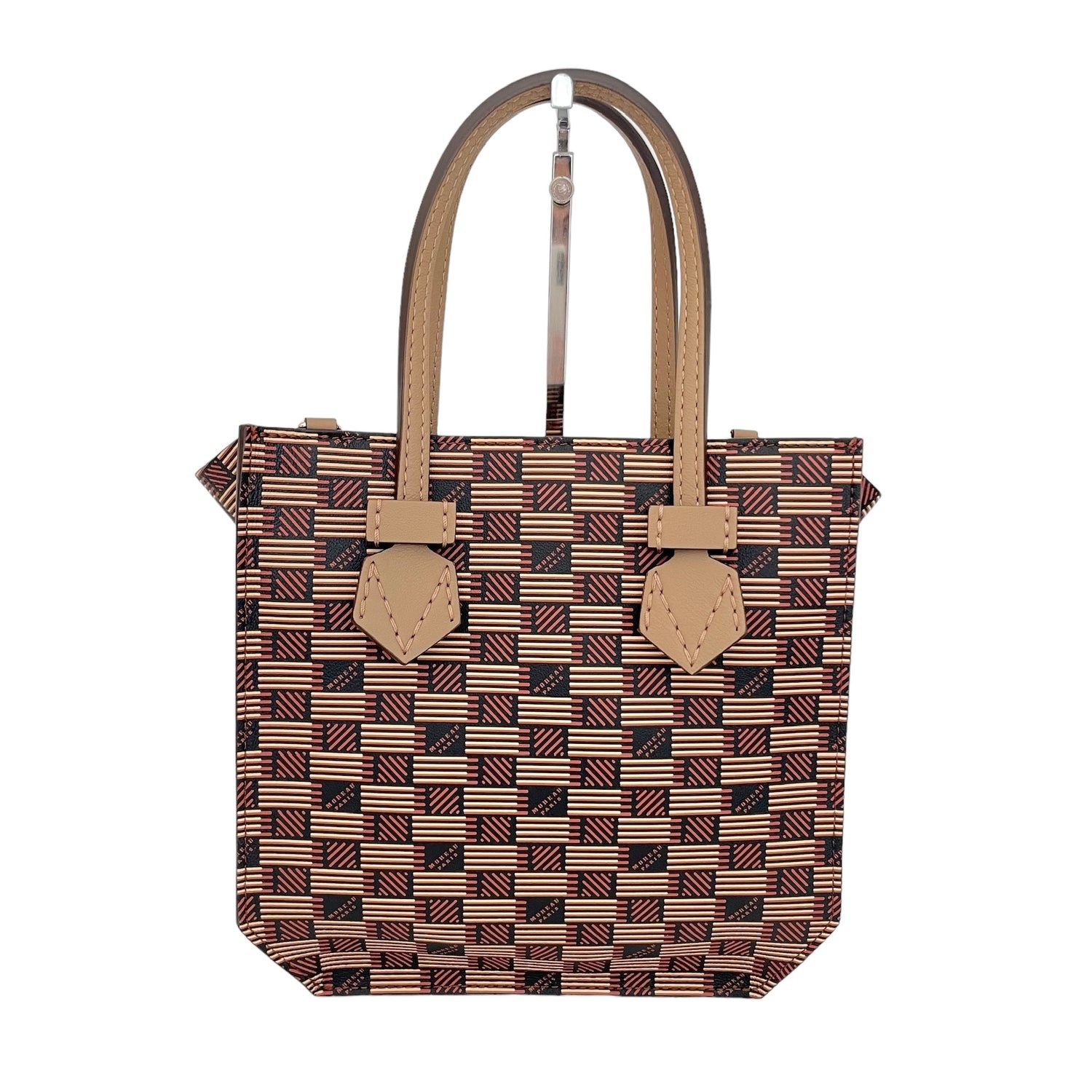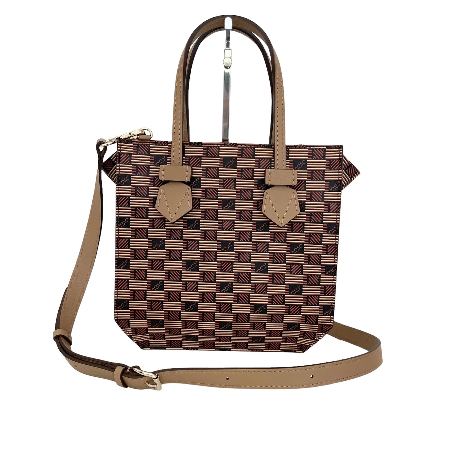 Moreau Bregancon mini zip in beige and brown. Iconic Moreau monogram throughout. Removable crossbody strap. Silver hardware.