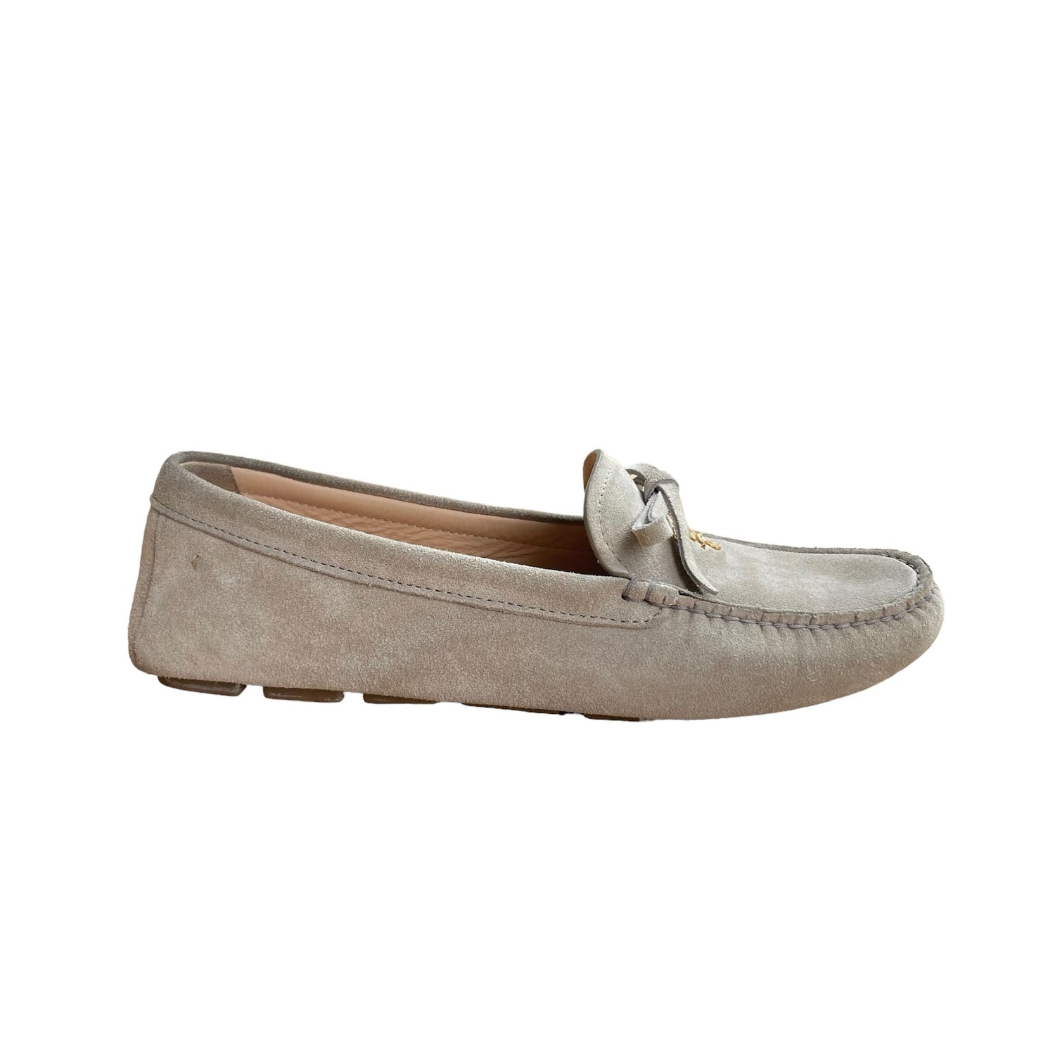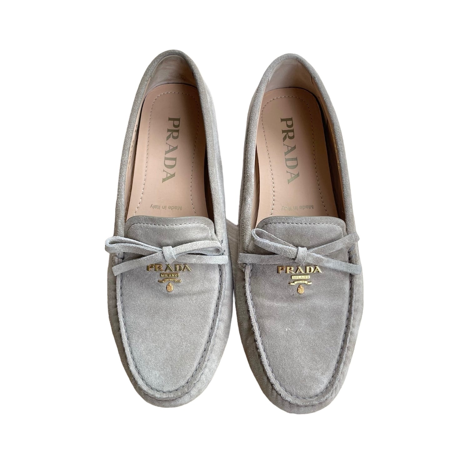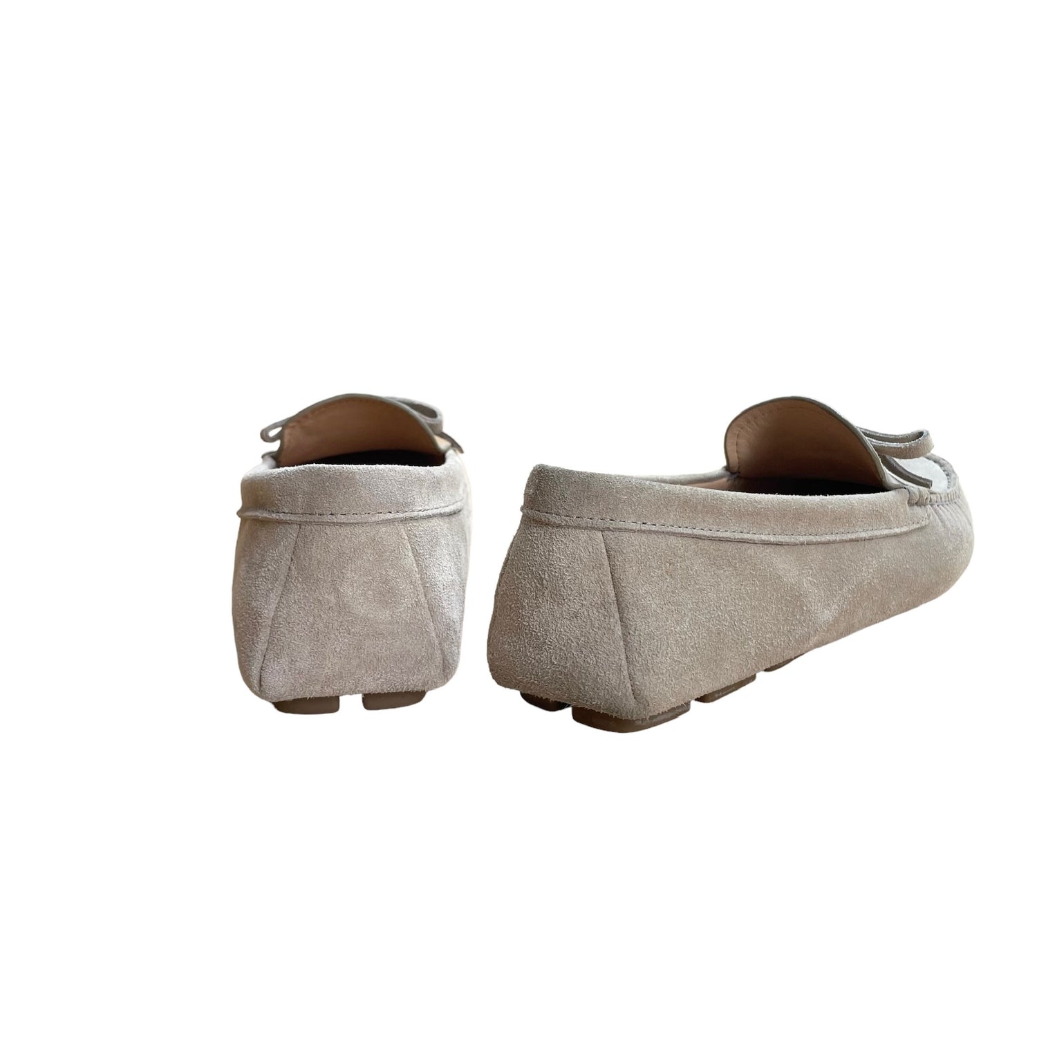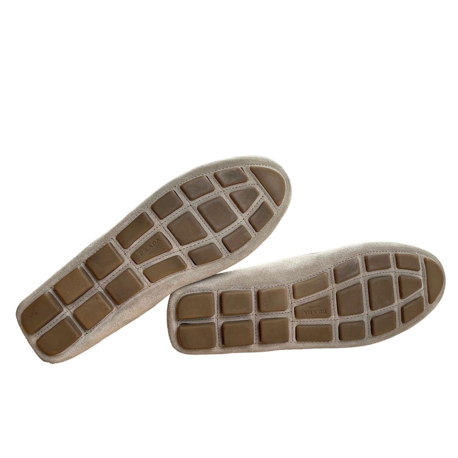 Prada beige suede loafers. Gold-tone Prada logo on top. Rubber outer soles. Designer size 38