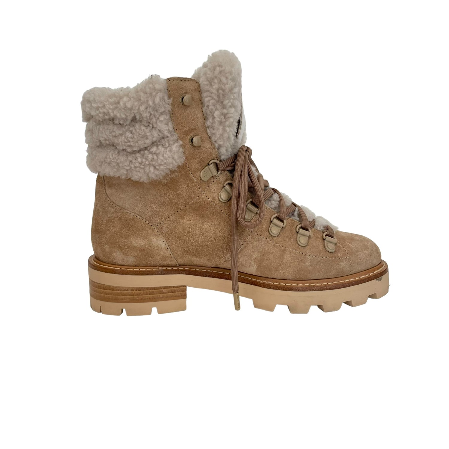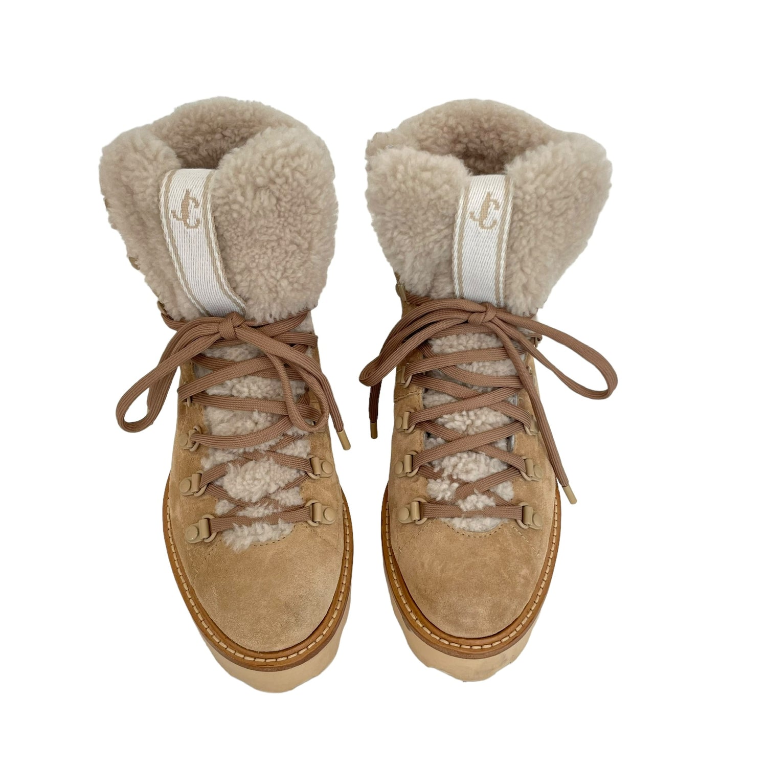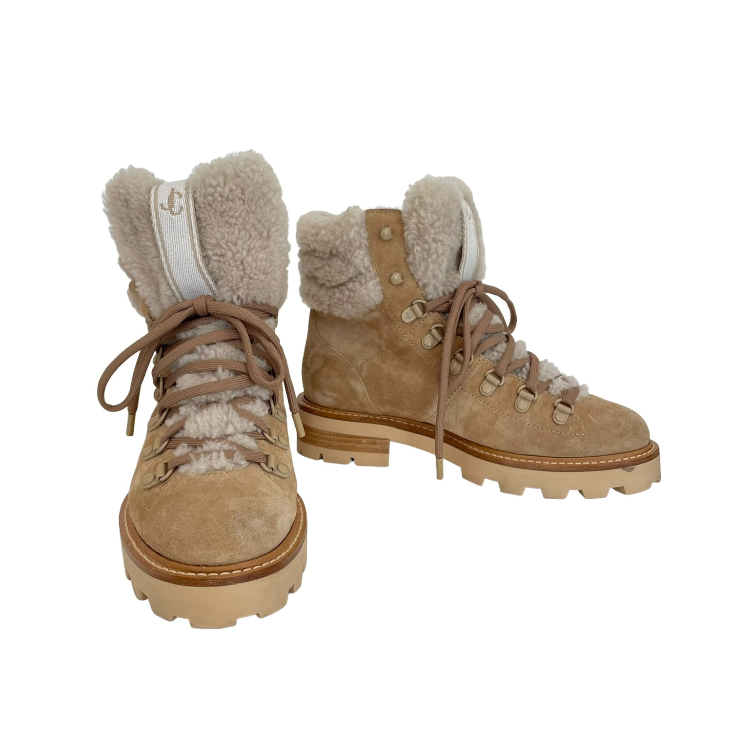 Jimmy Choo shearling boots. Beige suede. Laces at top. Round toe. Designer size 37.5