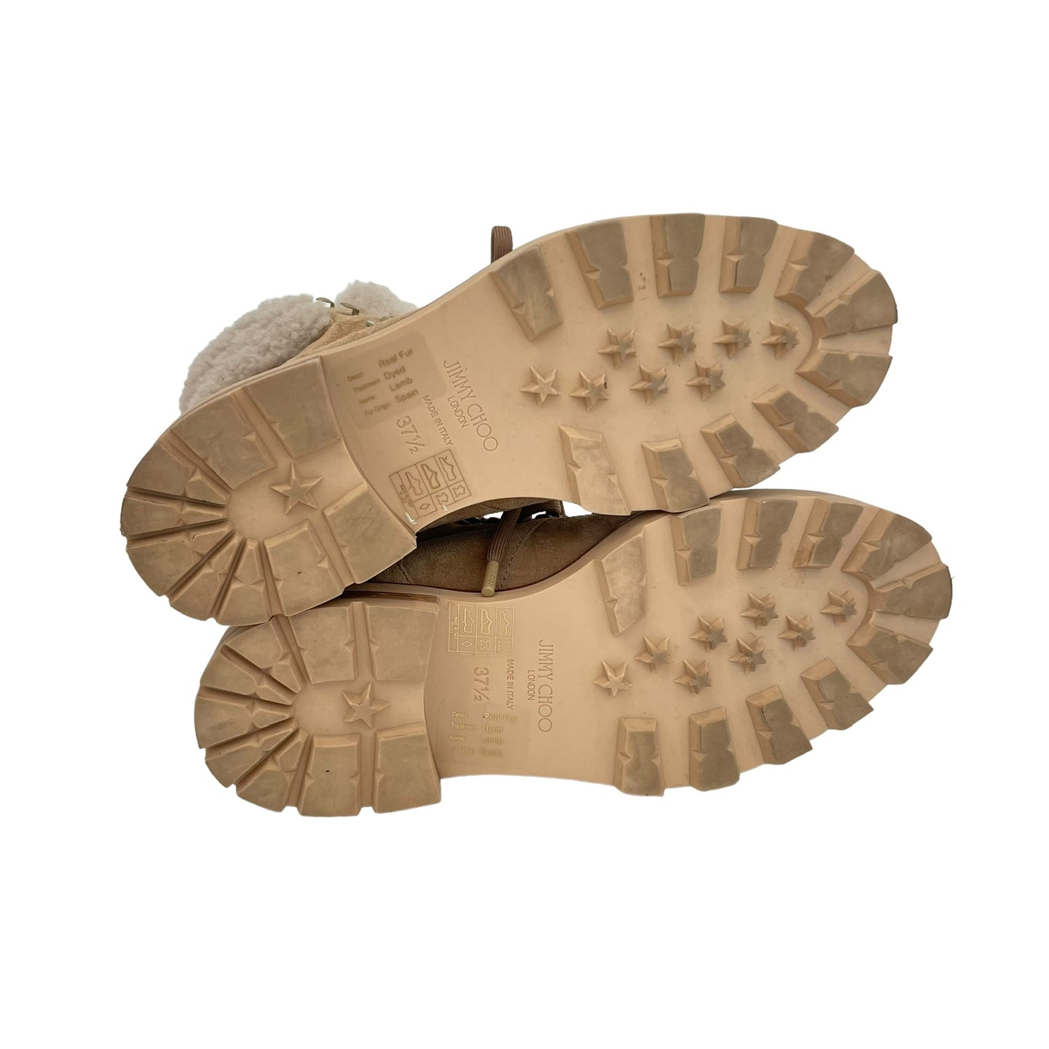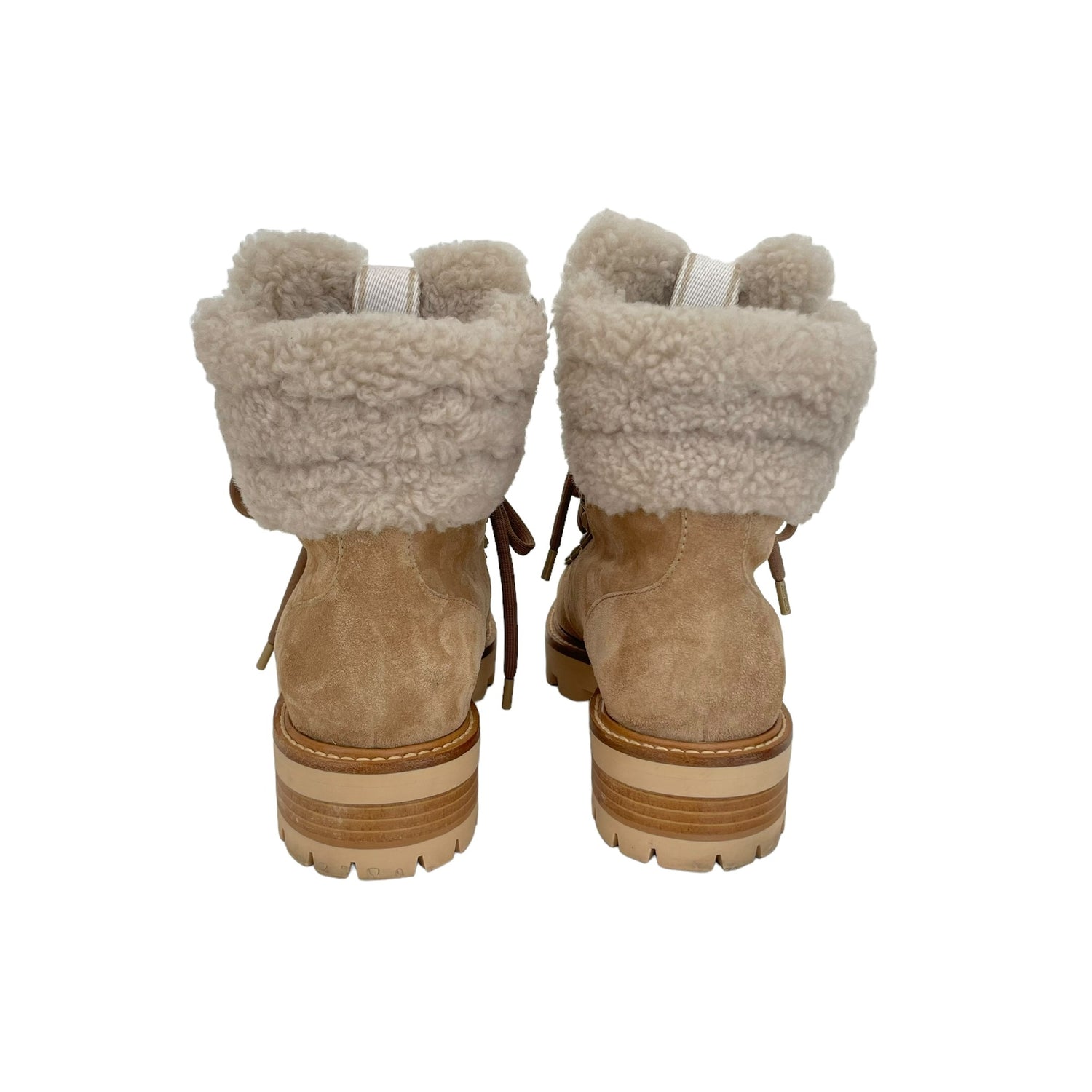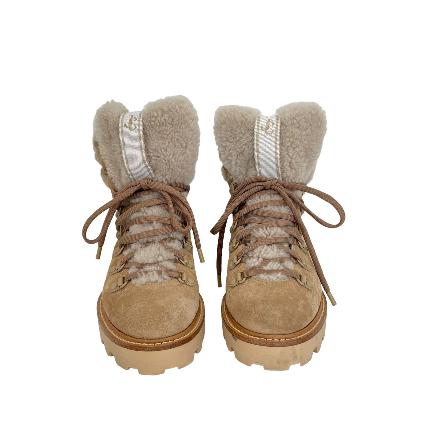 Jimmy Choo shearling boots. Beige suede. Laces at top. Round toe. Designer size 37.5