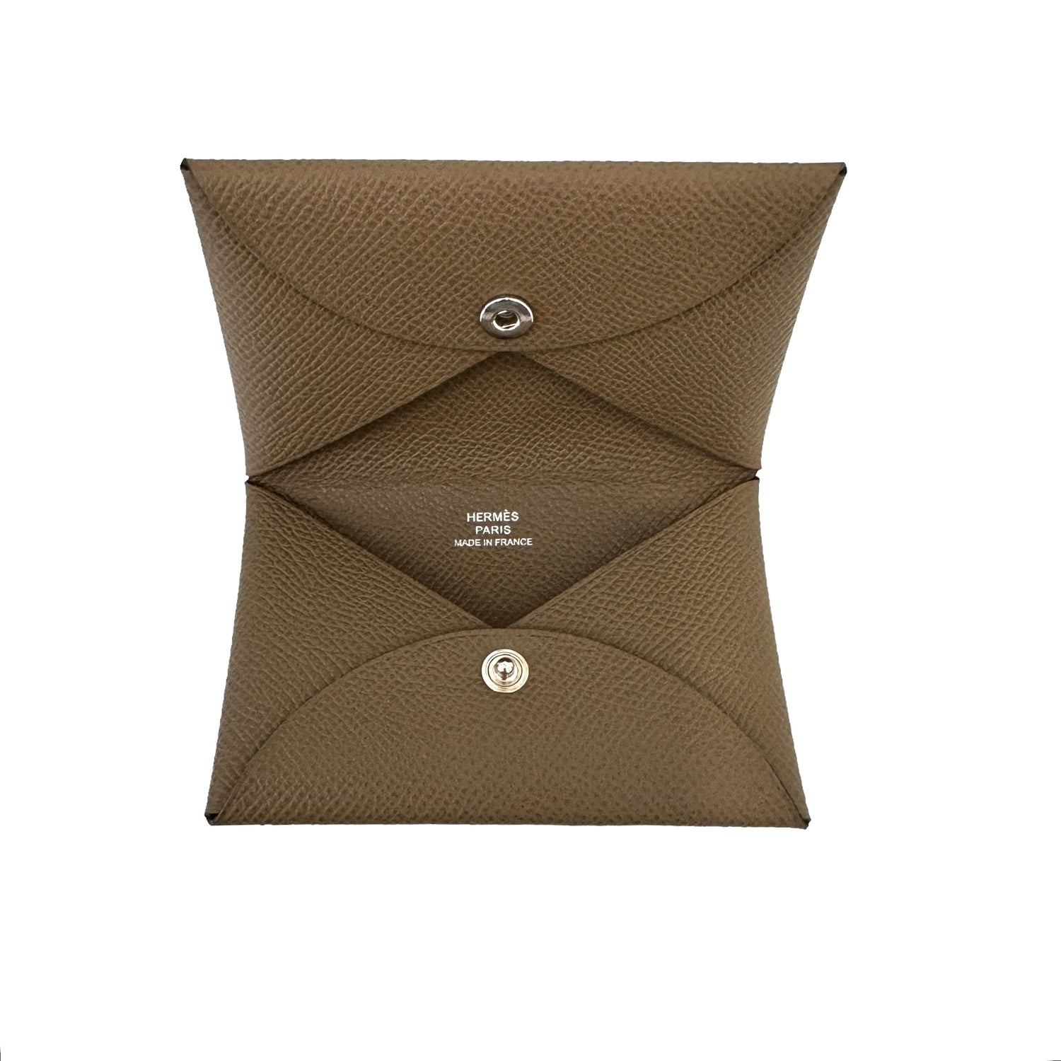 Hermes bi-fold wallet in Etoupe color. Epsom leather. Silver-tone hardware. Snap closure at flap.