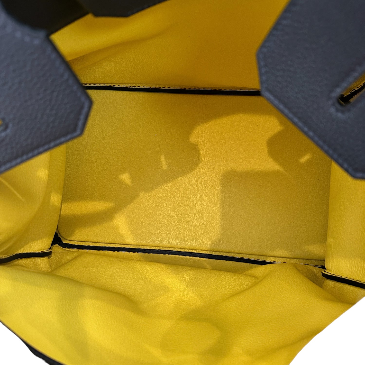 Hermes Birkin 40. Limited and special edition. Togo leather in four color. Navy body, deep green handles, bright yellow lining and orange clochette. Palladium hardware.