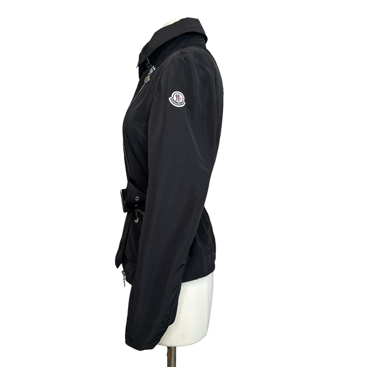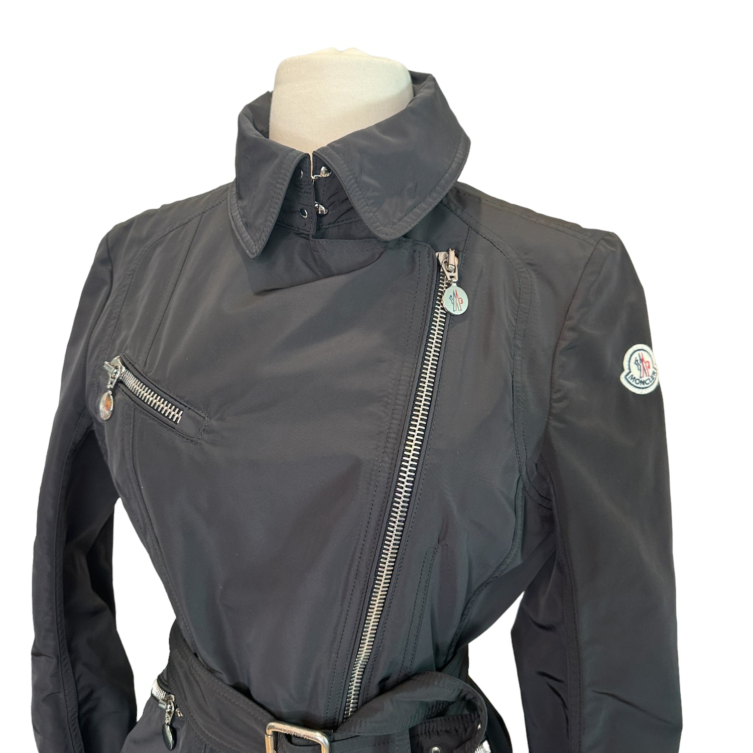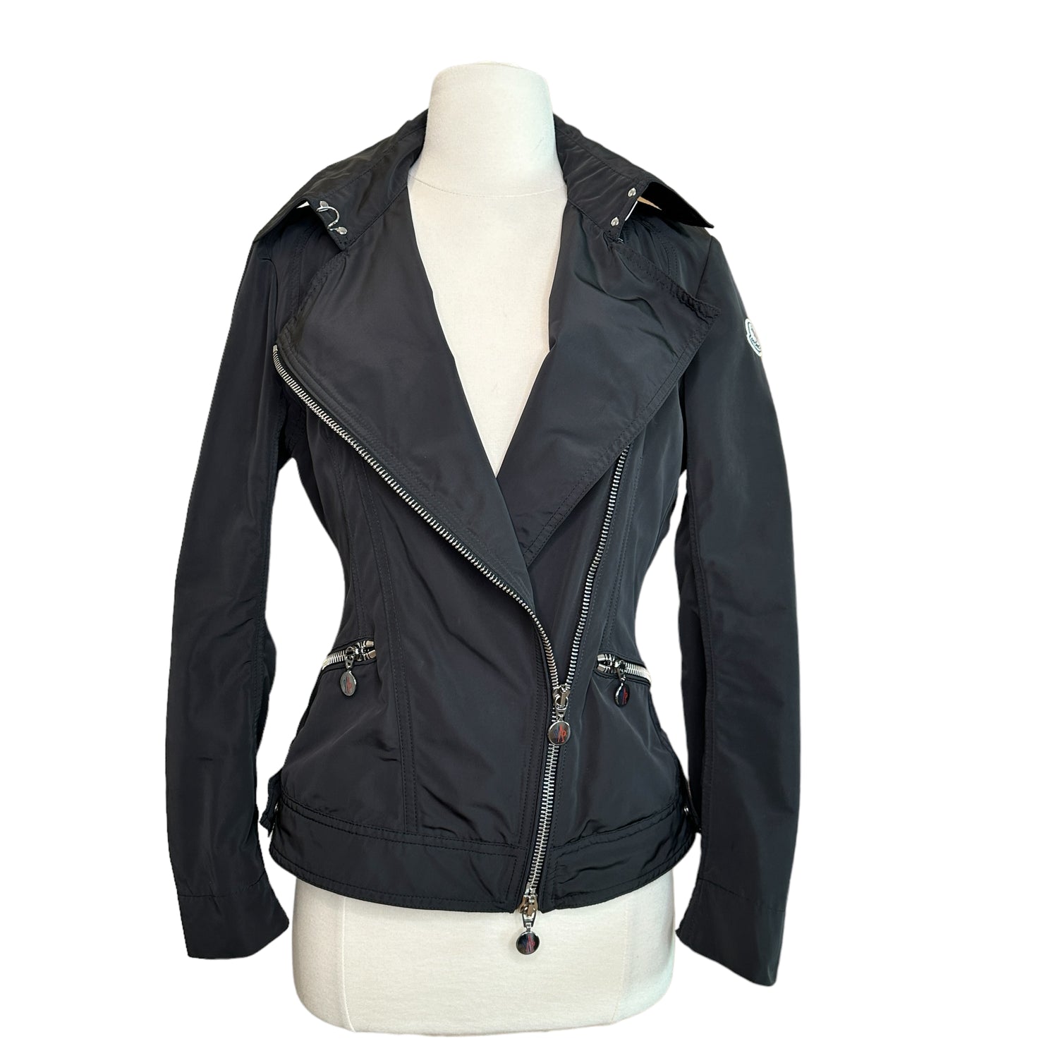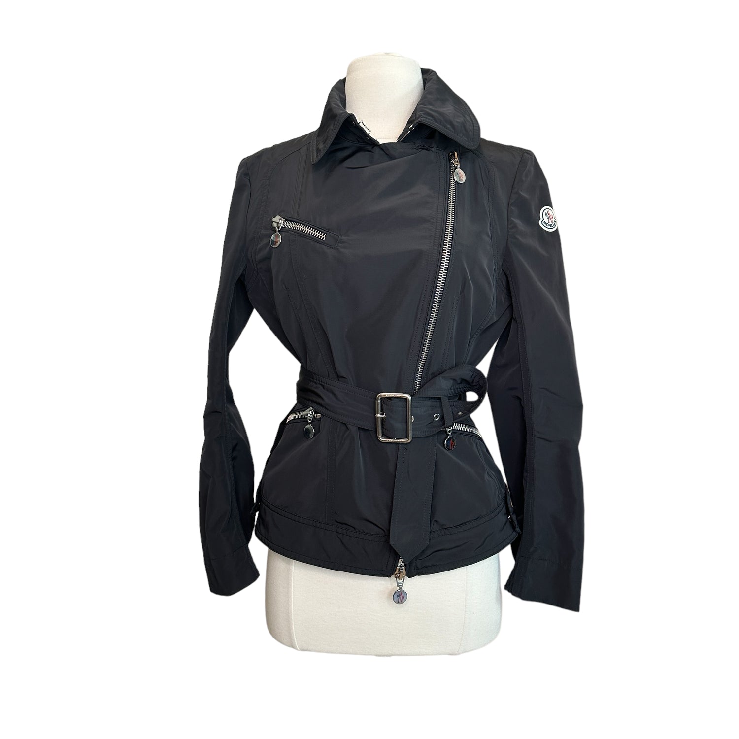 Moncler black perfecto. Lightweight biker jacket. Moncler logo at shoulder and zippers. Zipper closure. Two zipper pockets. Removable belt. Silver-tone hardware. Designer size 1.