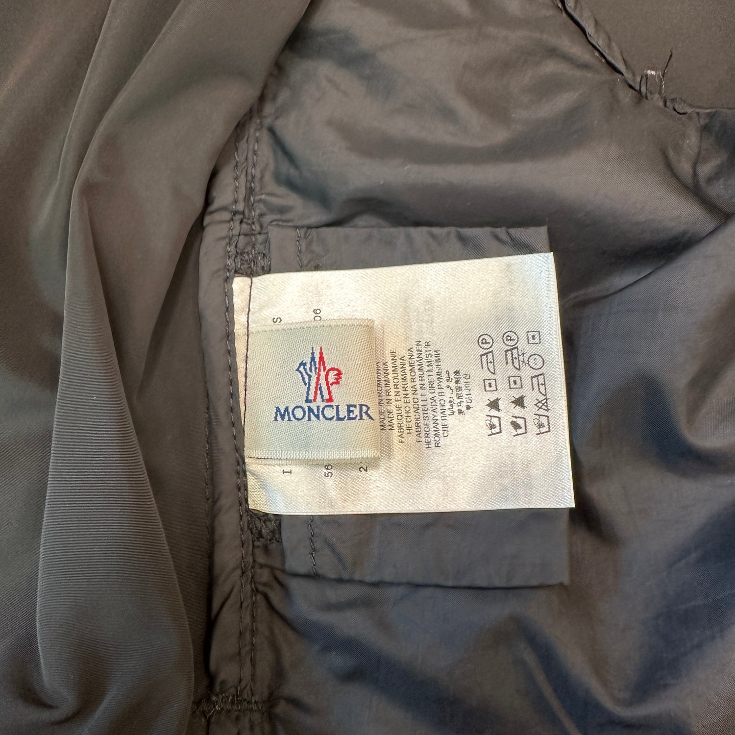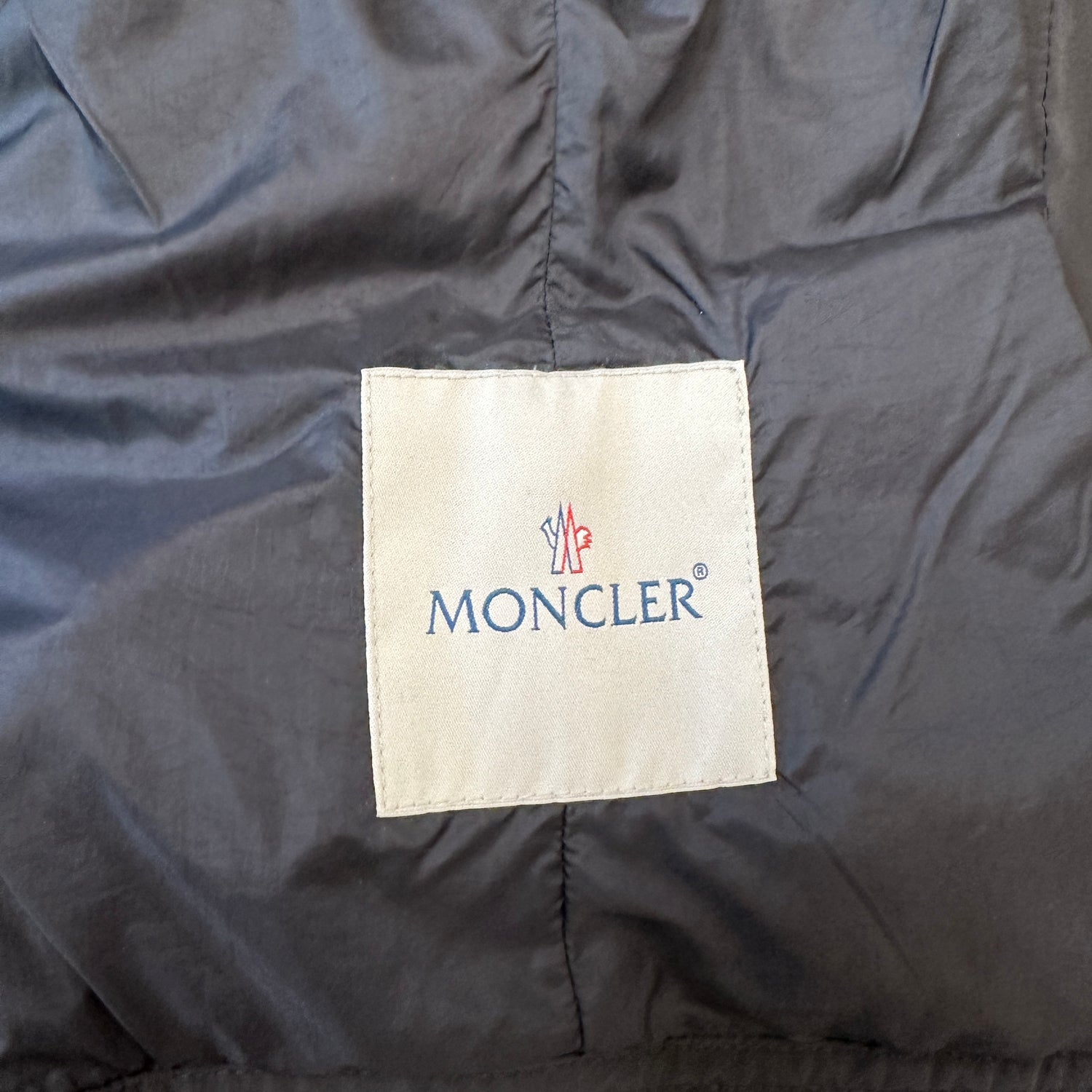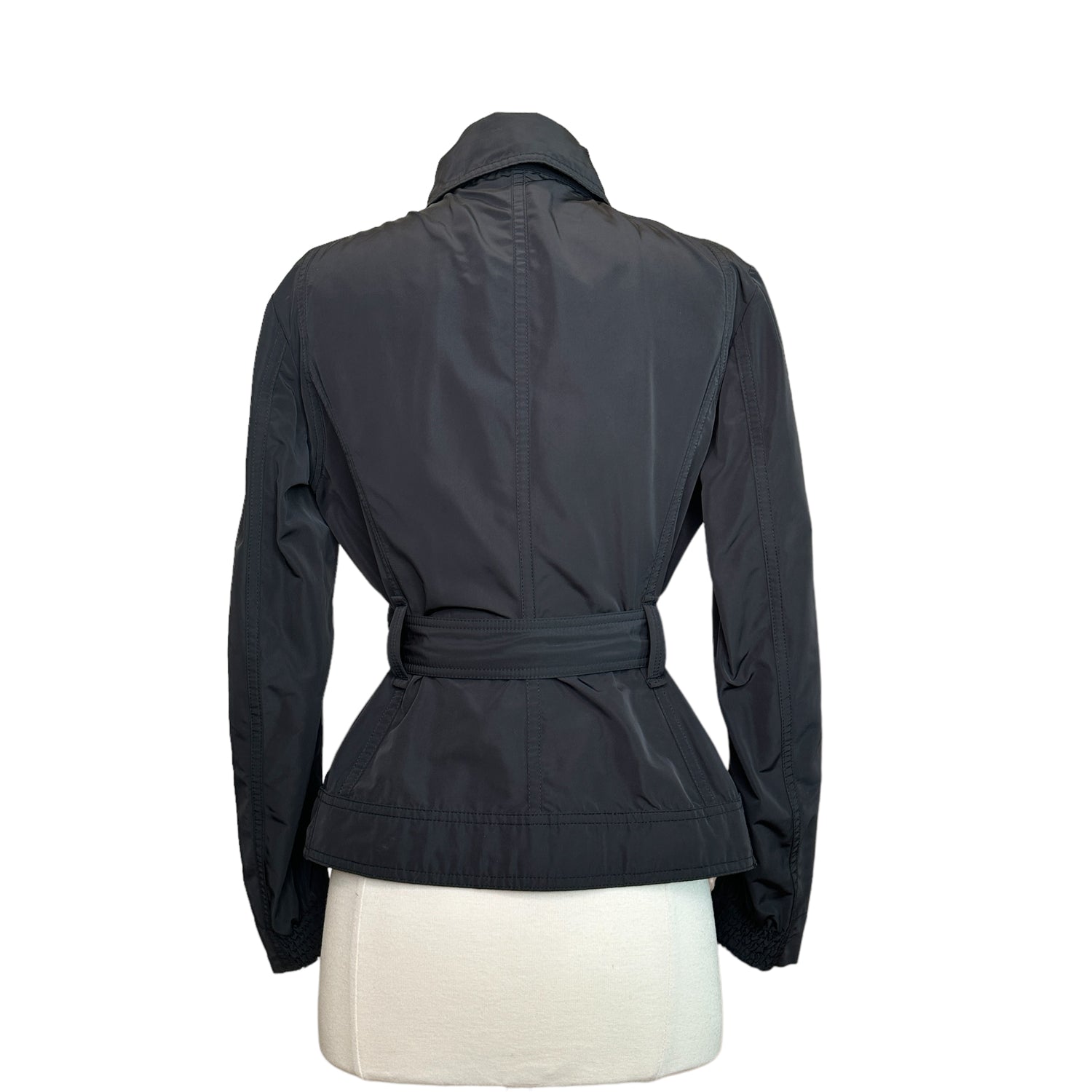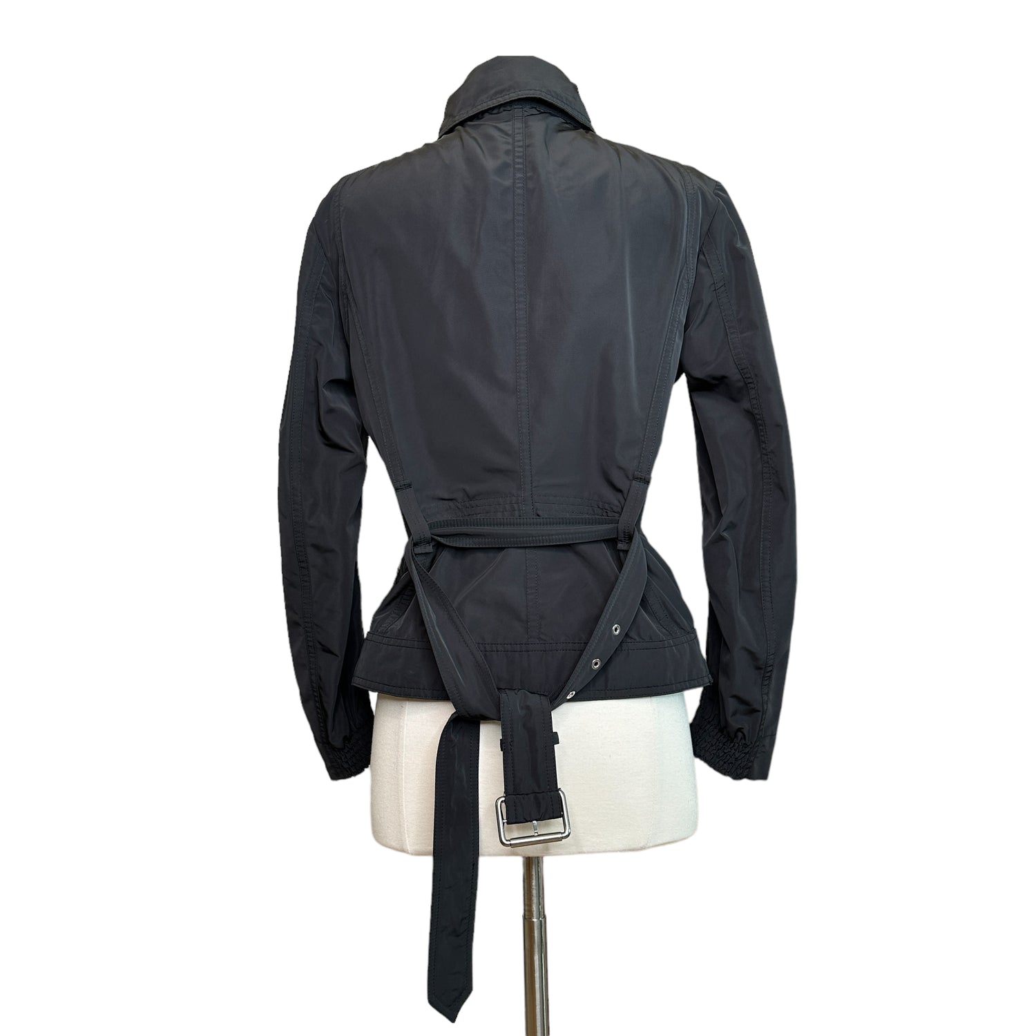 Moncler black perfecto. Lightweight biker jacket. Moncler logo at shoulder and zippers. Zipper closure. Two zipper pockets. Removable belt. Silver-tone hardware. Designer size 1.