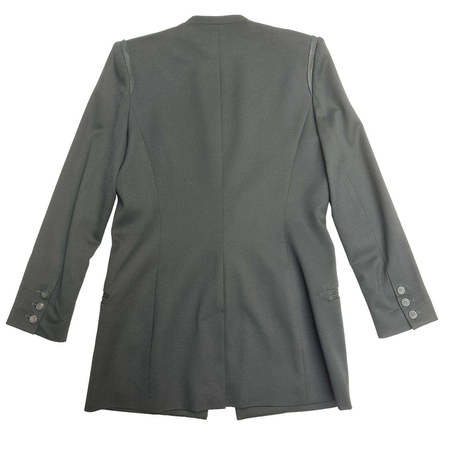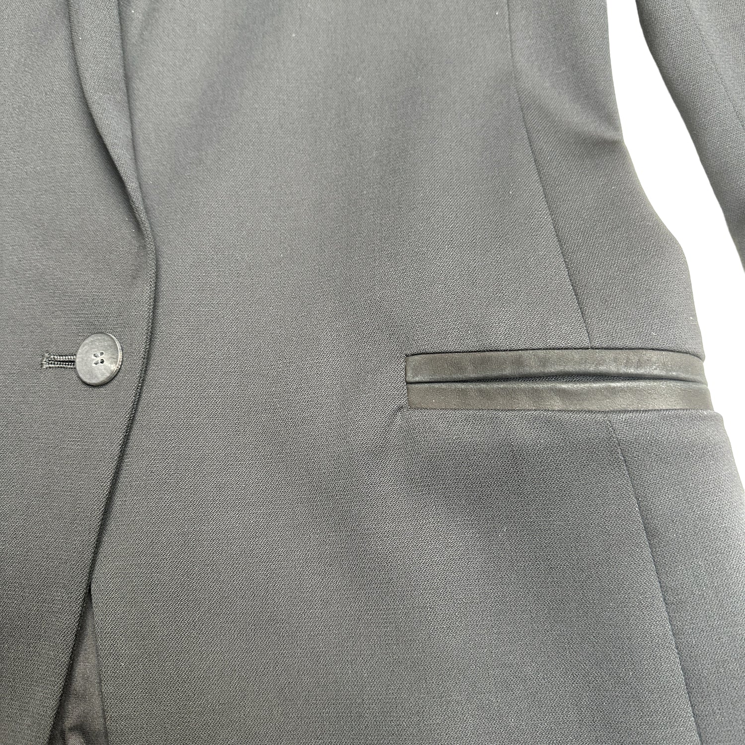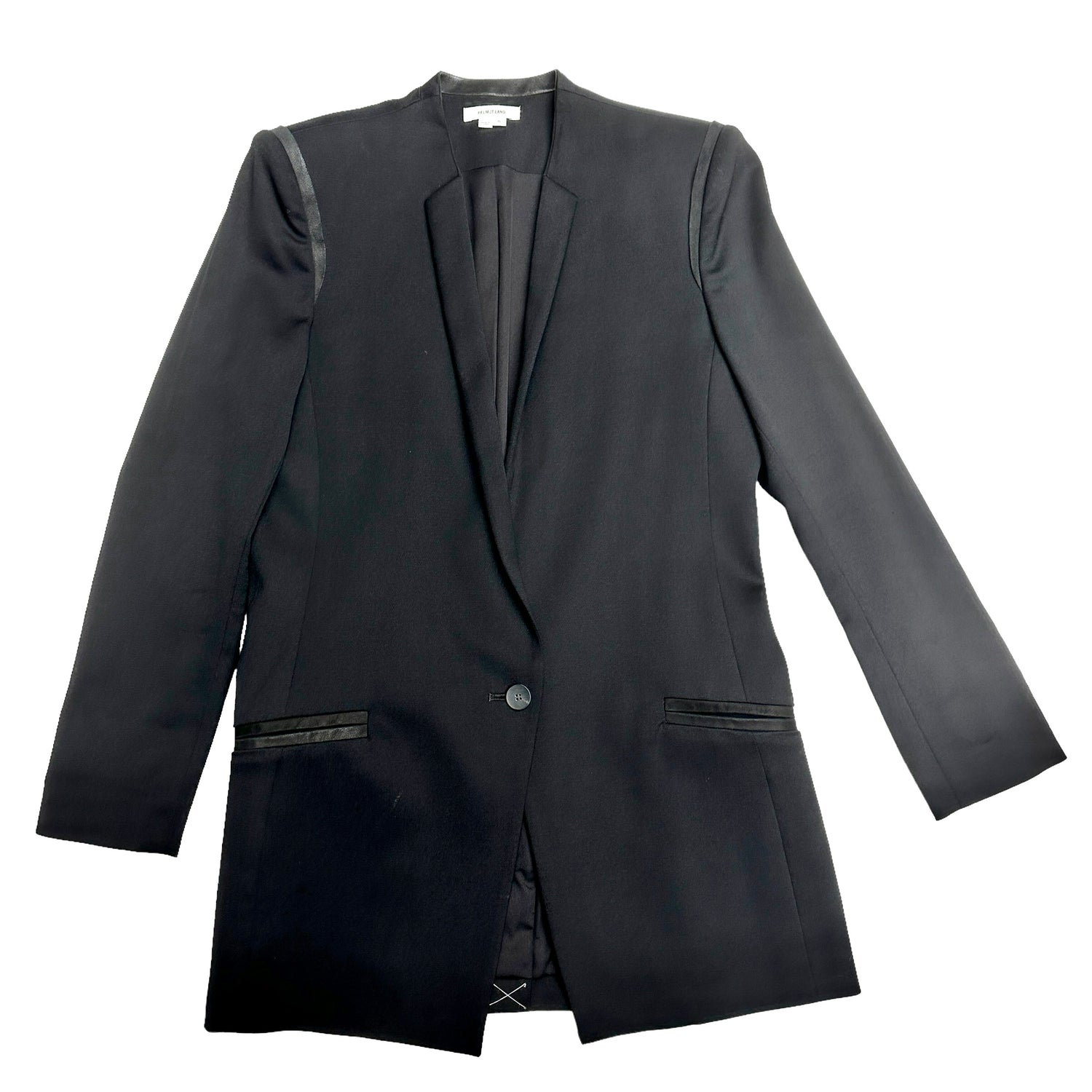 Helmut Lang black wool blazer. Lamb leather details at shoulder, neck and pockets. One button closure at front. Designer size 6.