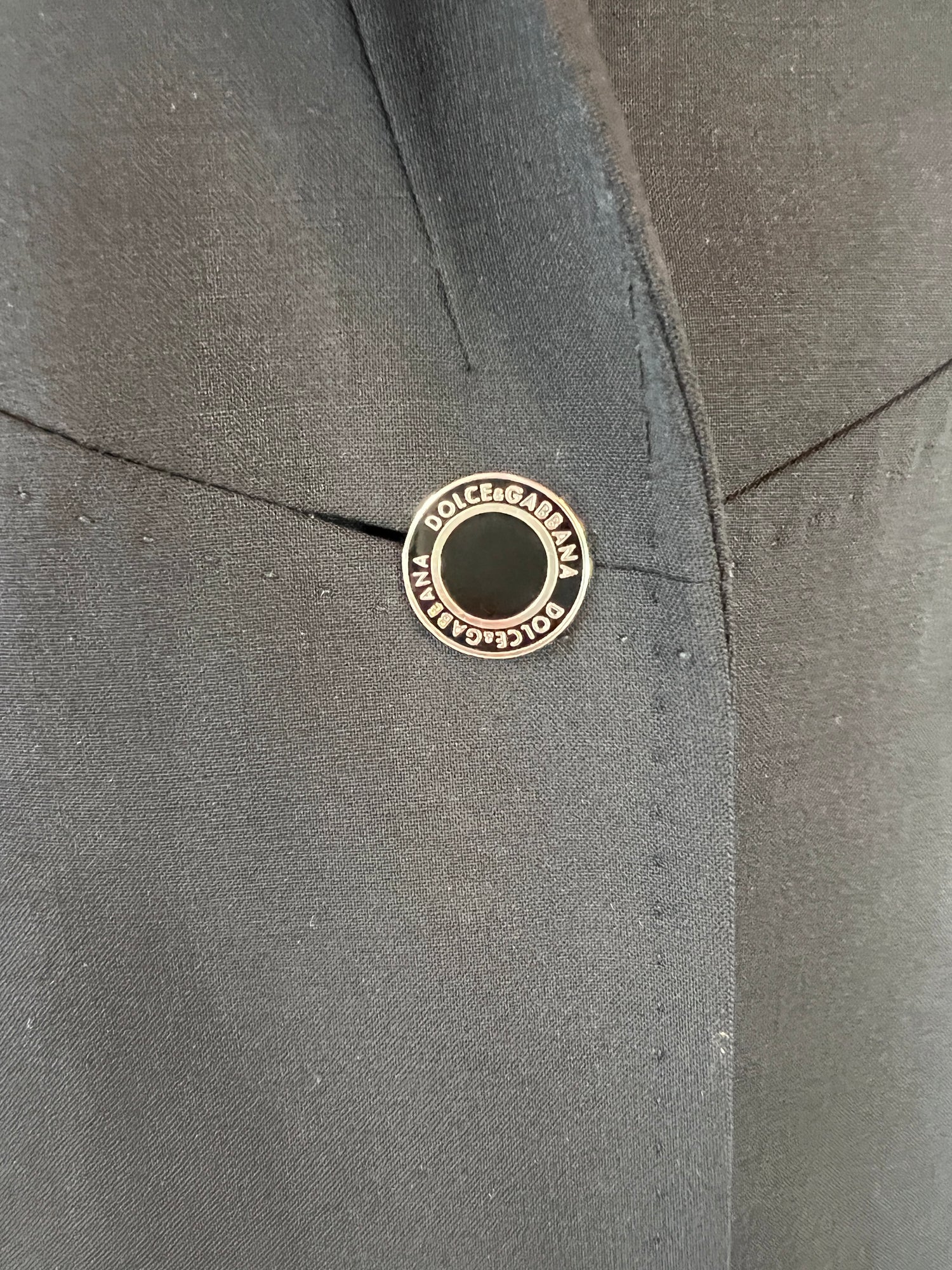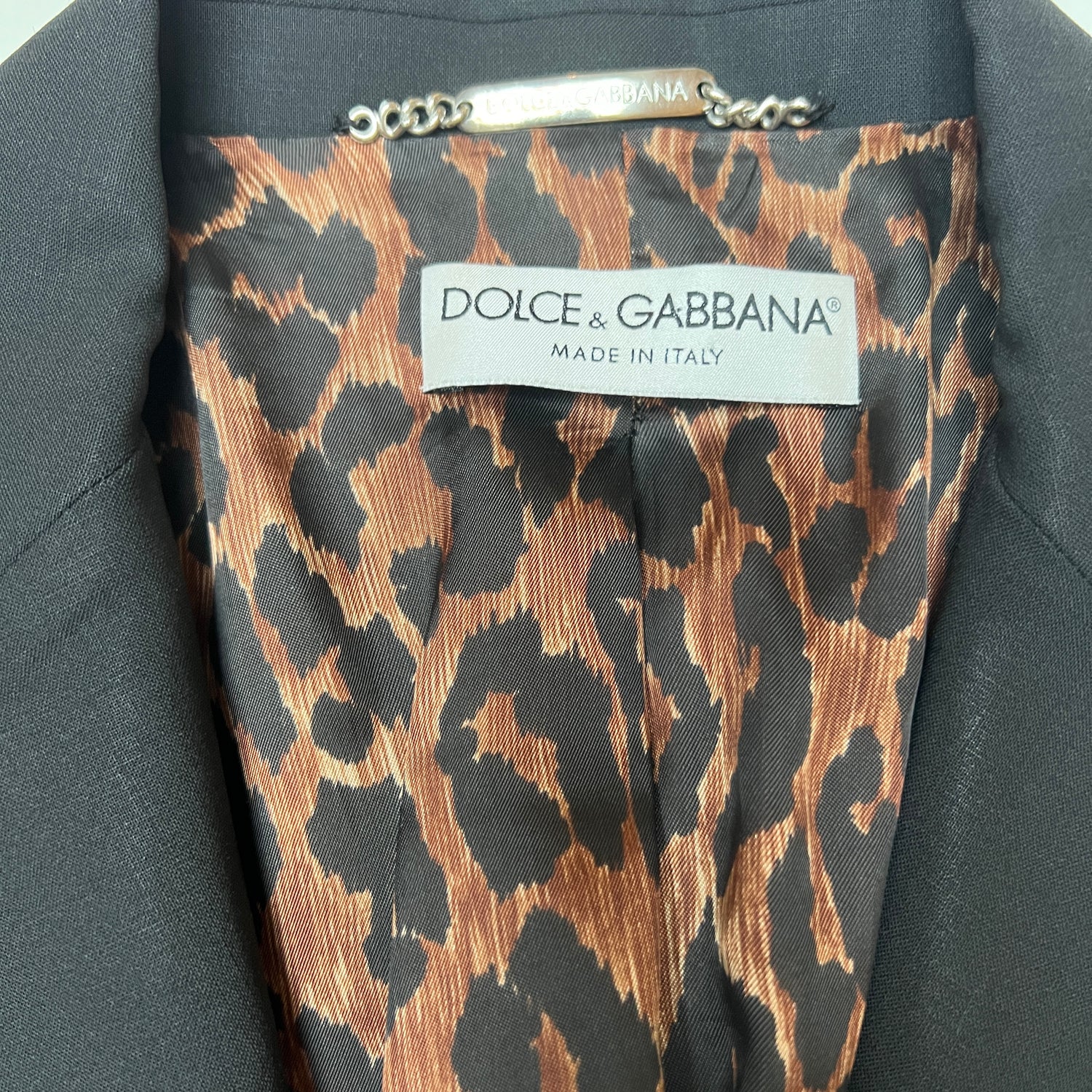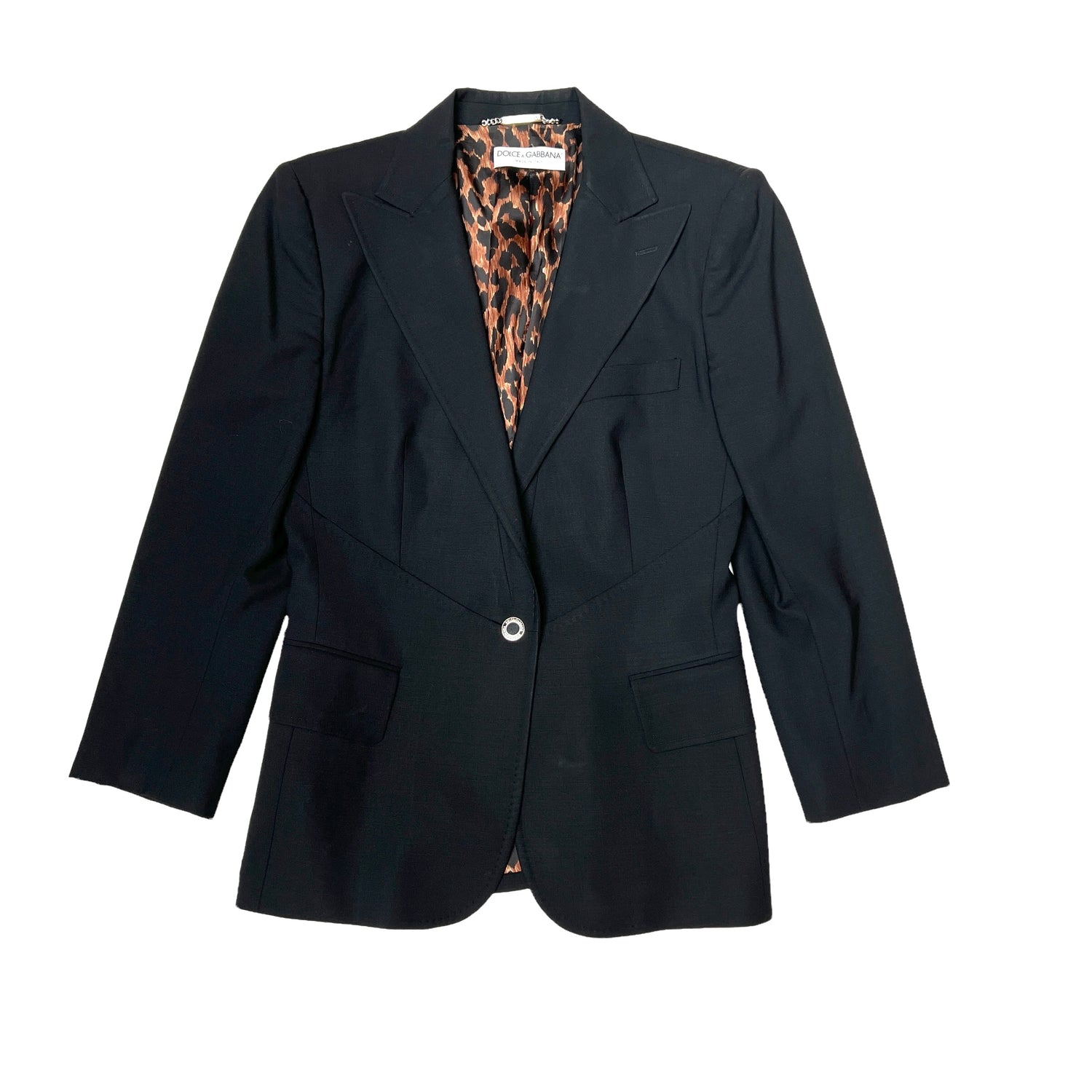 Dolce & Gabbana black blazer made out of wool. Light Blazer. Silver-tone buttons with logos throughout. One button closure at front. Four buttons at sleeves. Leopard lining which gives it such a nice touch. Designer size 46.