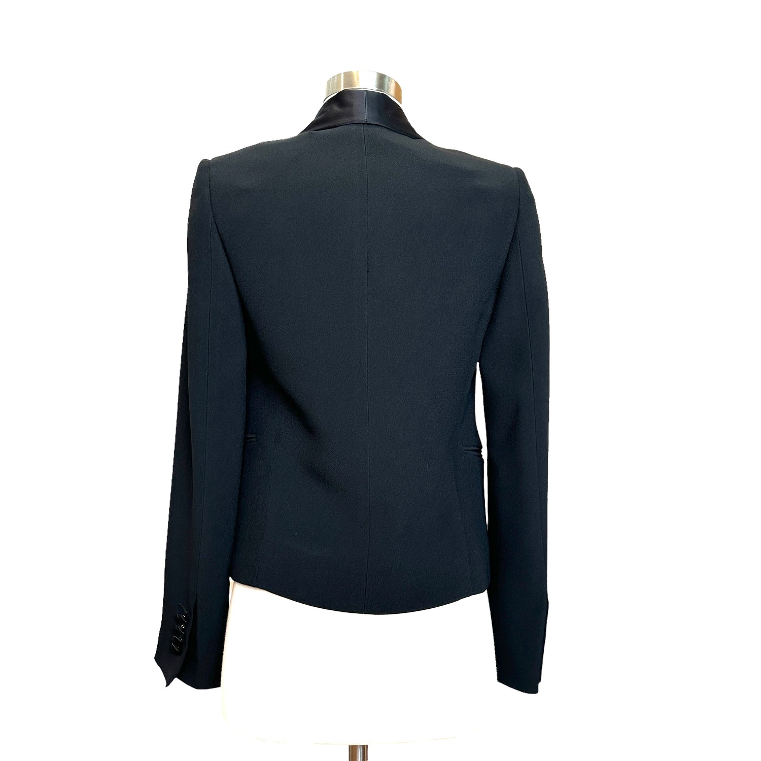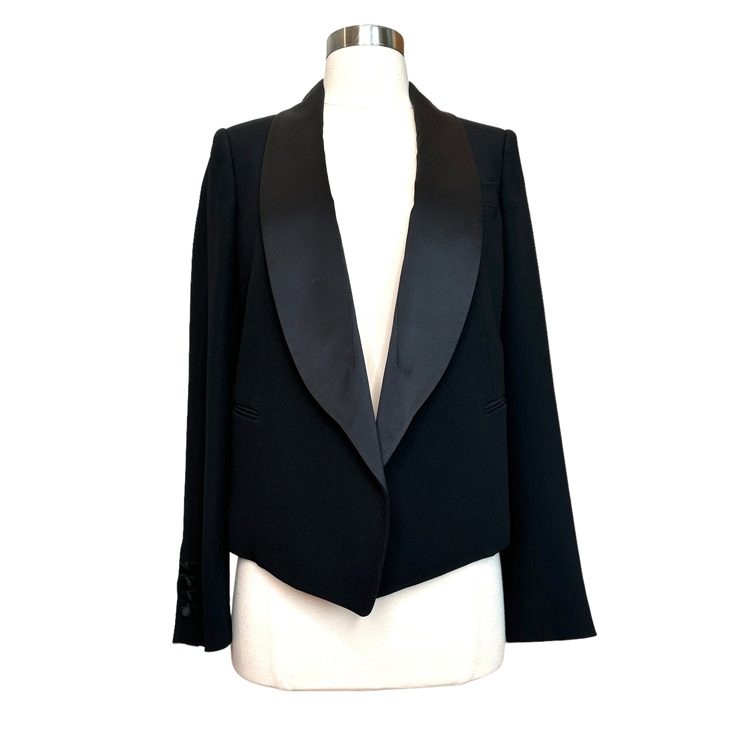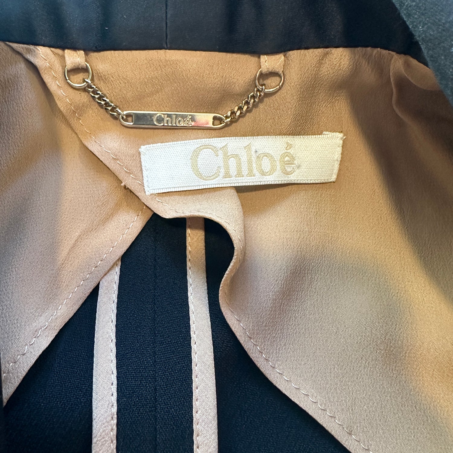Chloe black blazer. Round satin collar. Open front. Flat buttons at sleeves. Pockets (still unstitched). Designer size 34.