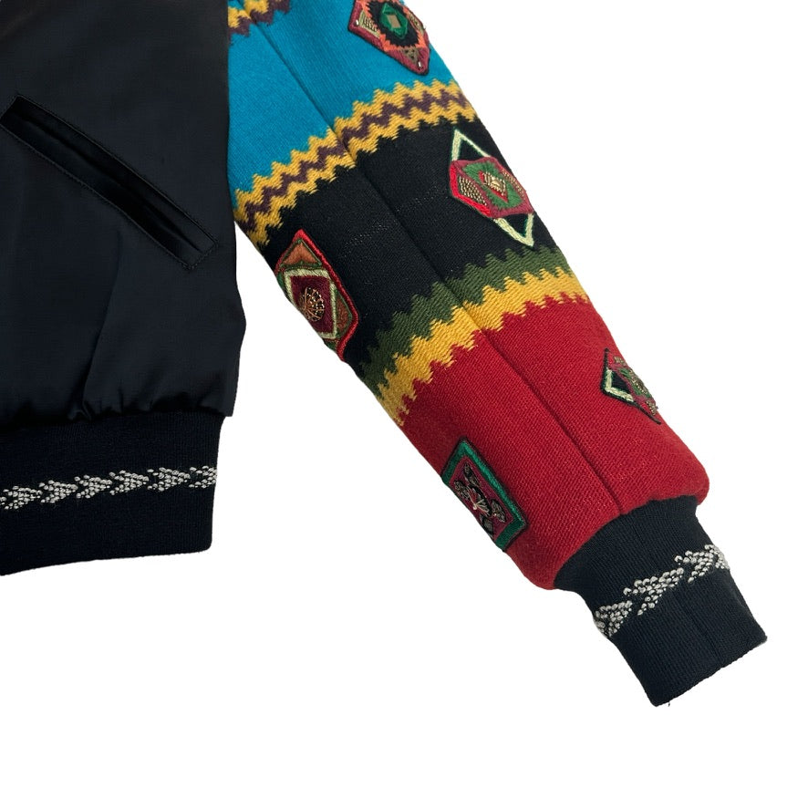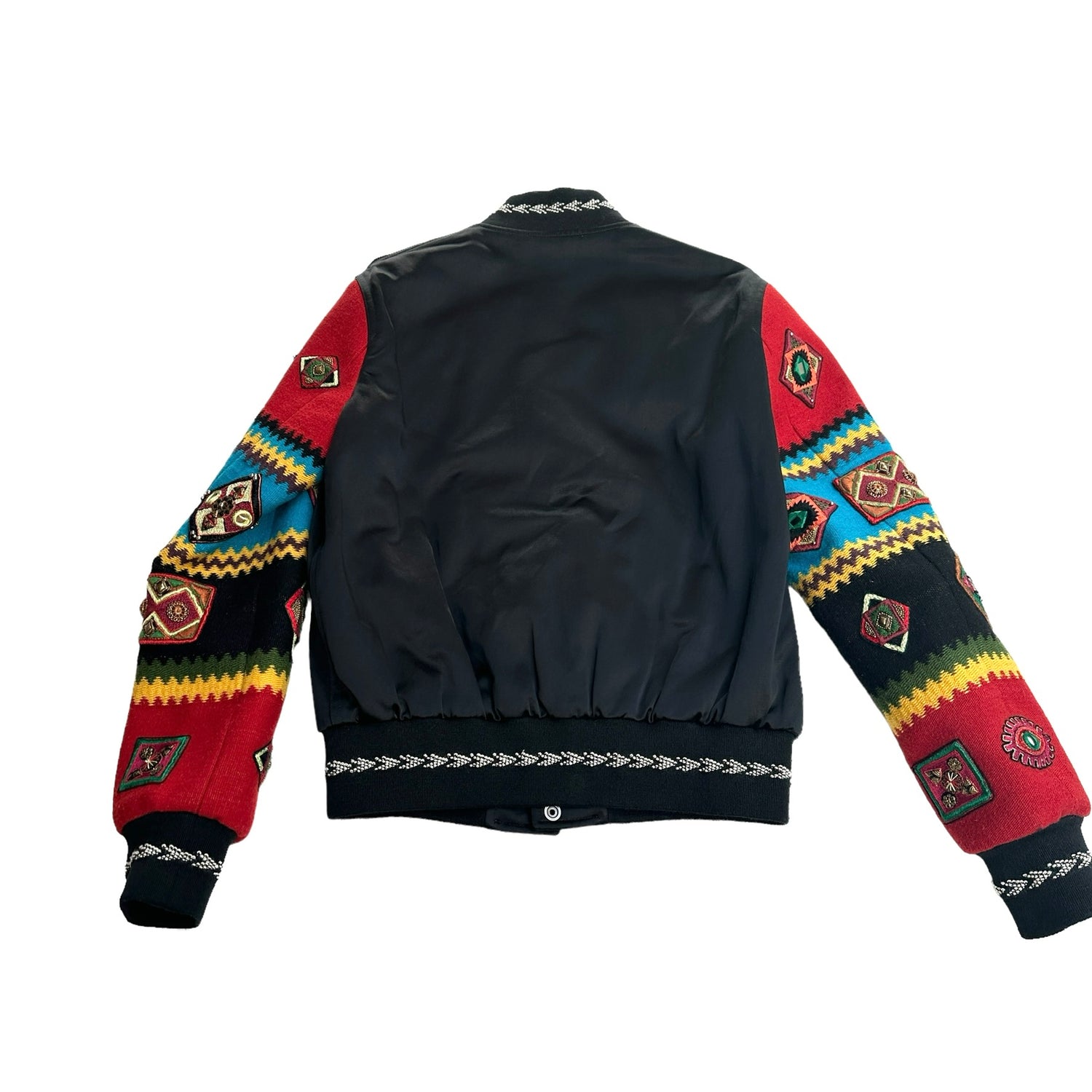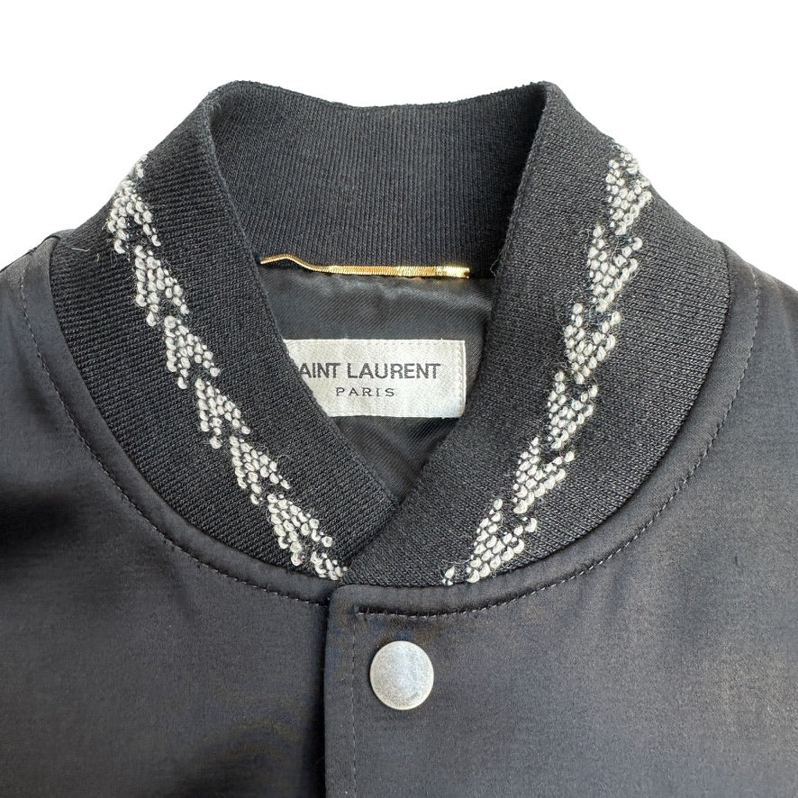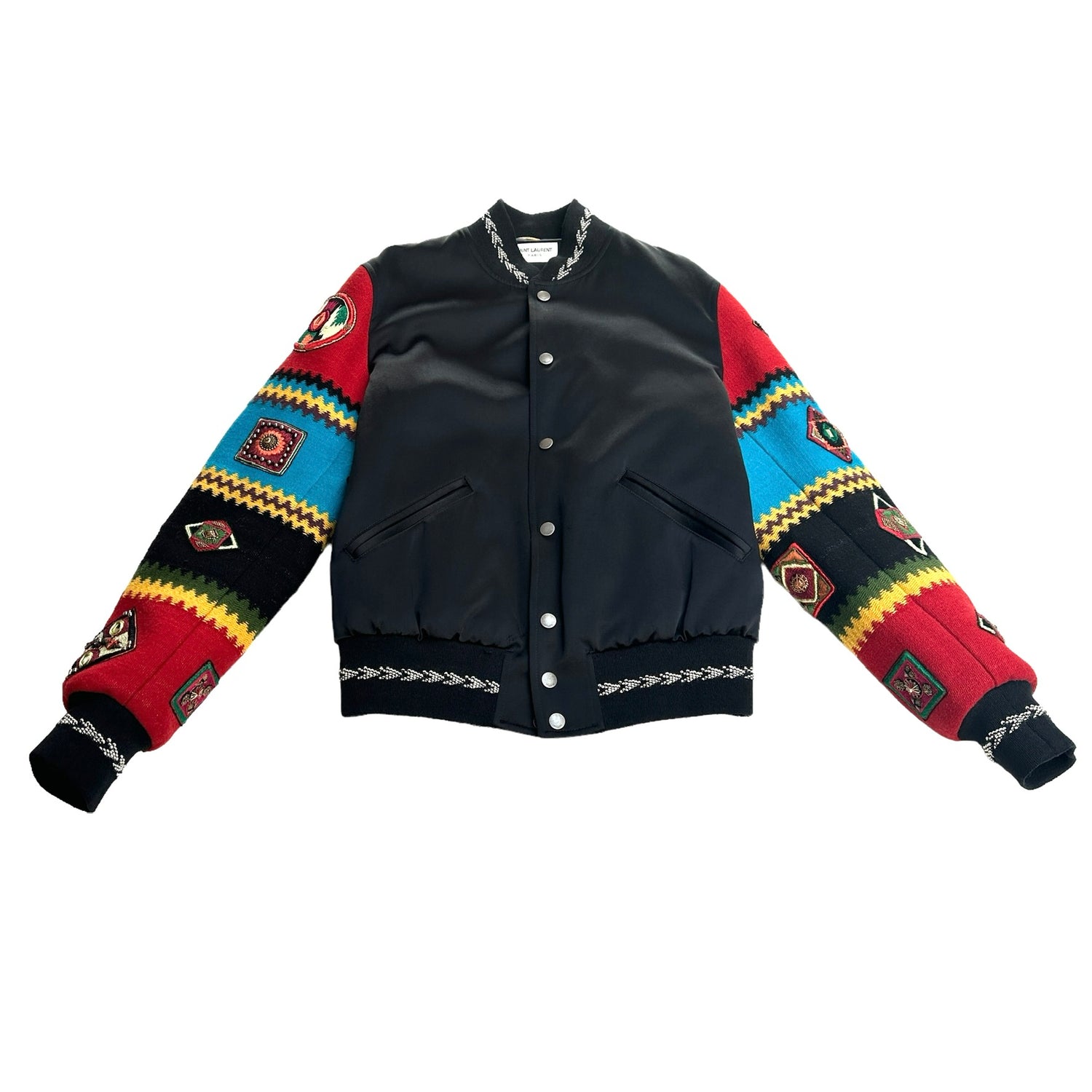 Saint Laurent black satin bomber with bohemian embroidered sleeves. Multicolor fabric and sequins at sleeves. From the 2017 collection by Anthony Vaccarello. Beaded, embroidered, sequin, studded & crystal accents. Stand collar. Slit pockets. Snap closure buttons at front. Designer size 38.