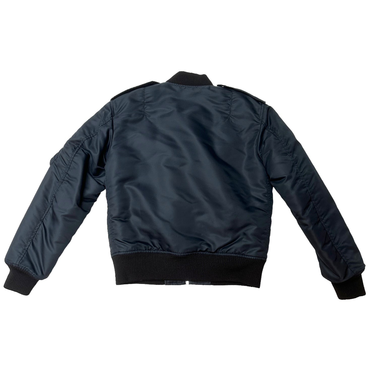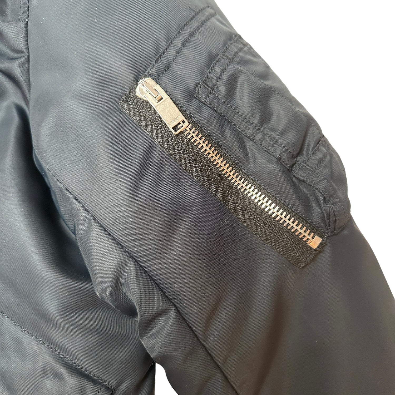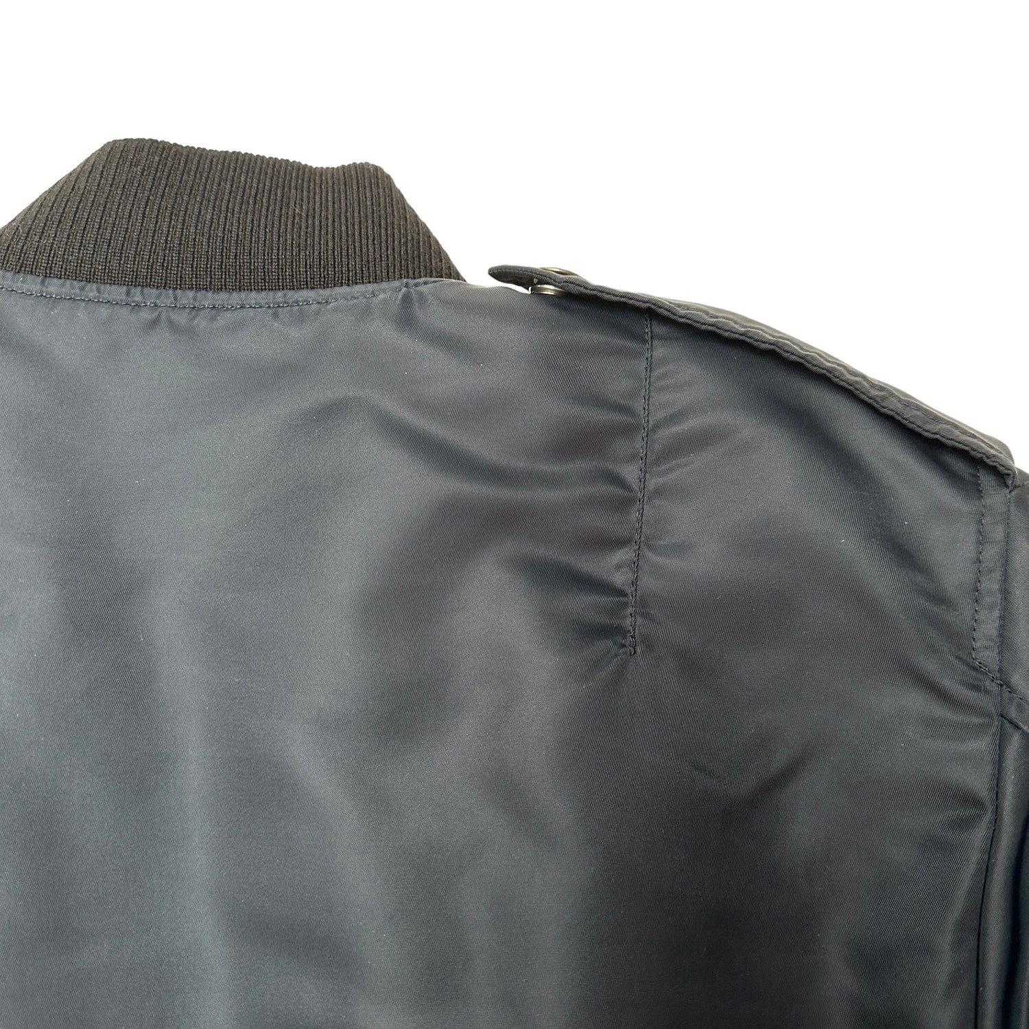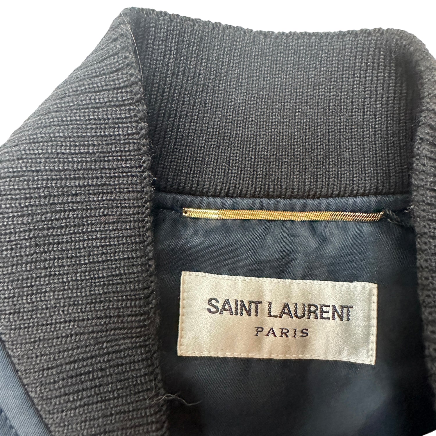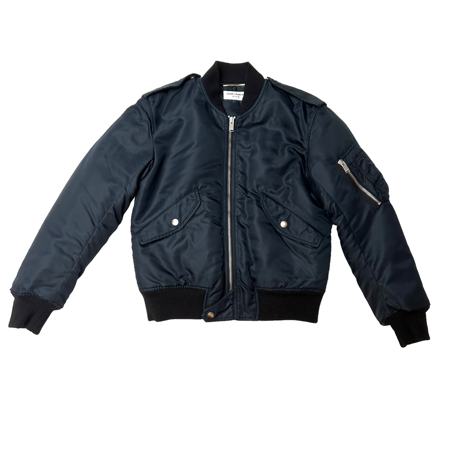 Saint Laurent black nylon bomber jacket. Round neck. Silver-tone zip closure at front. Zip pocket at left arm. Two snap on pockets. Designer size 34.