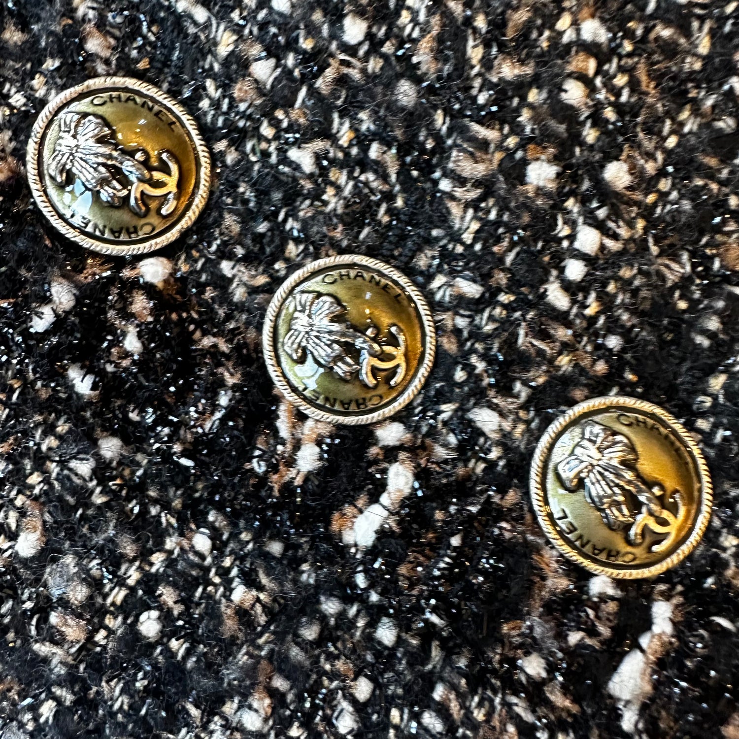 Chanel tweed blazer. Vintage from the Fall 2004 collection by Karl Lagerfeld. Black and brown tweed with some gold. CC logo buttons. Chain-link at interior. Button closure at front. Pointed collar. Designer size 44.