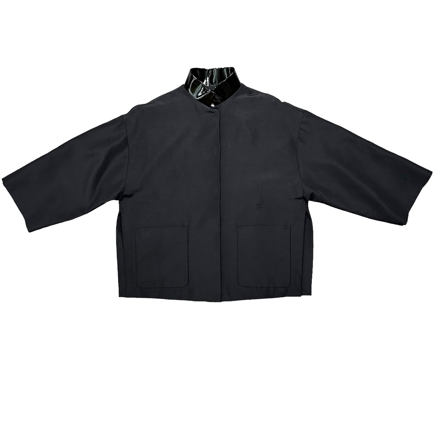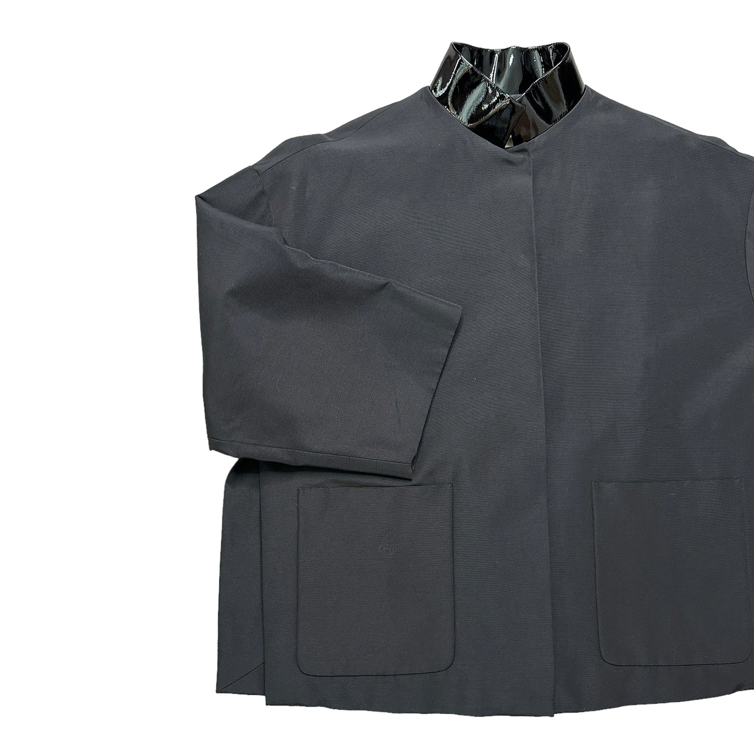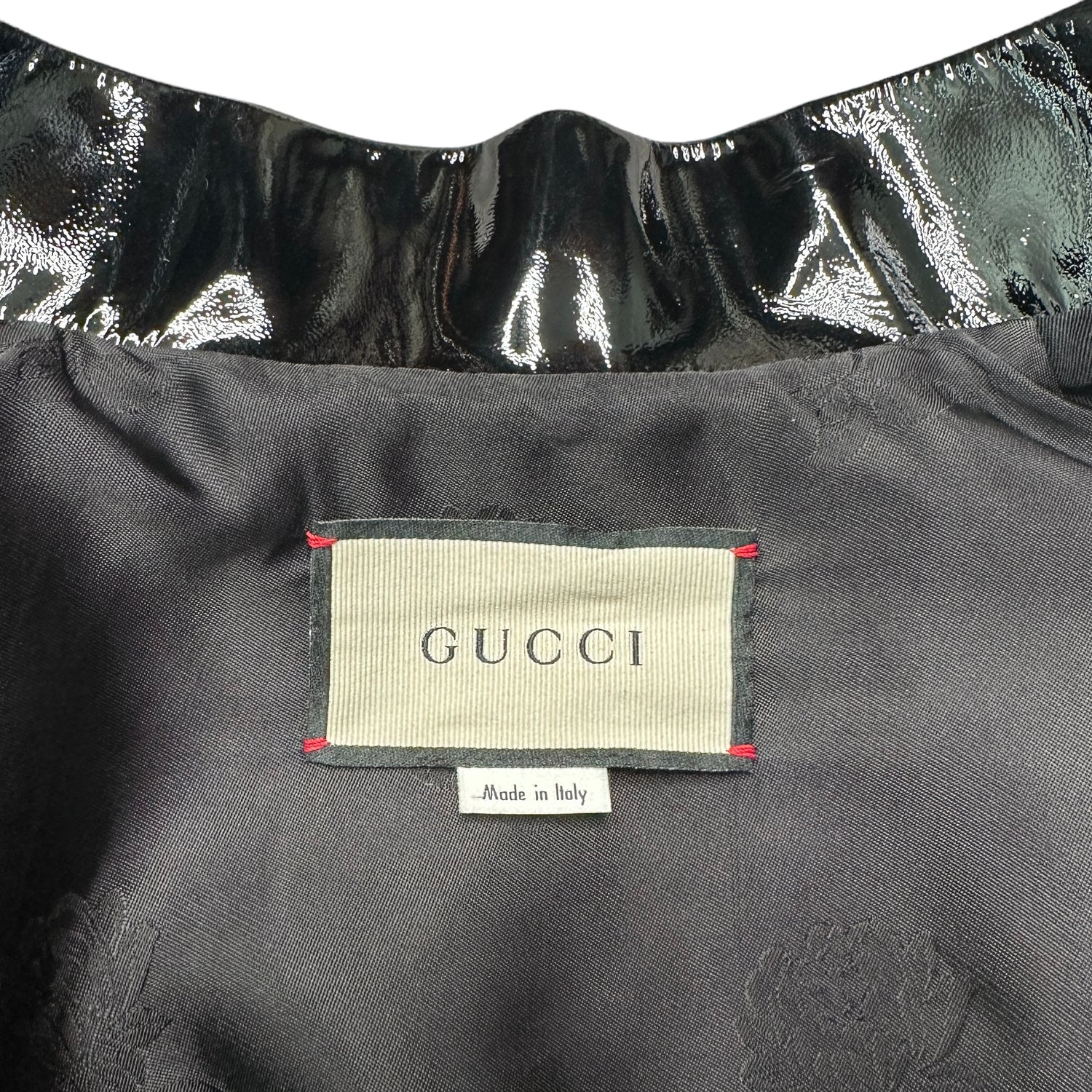 Gucci black cape jacket. Spring/Summer 2020 Collection by Alessandro Michele. Black patent leather stand alone collar. Two patch pockets at front. Designer size 38.