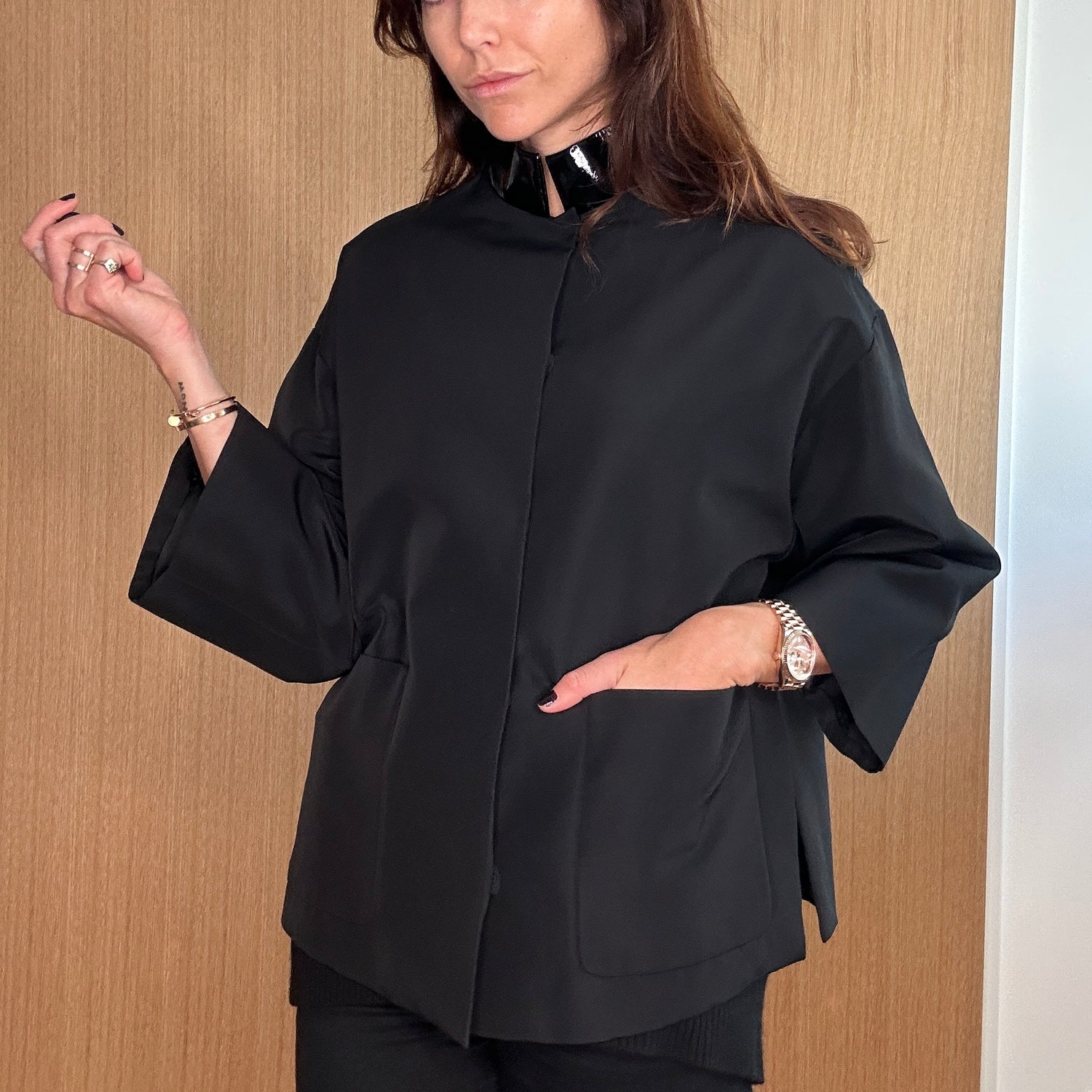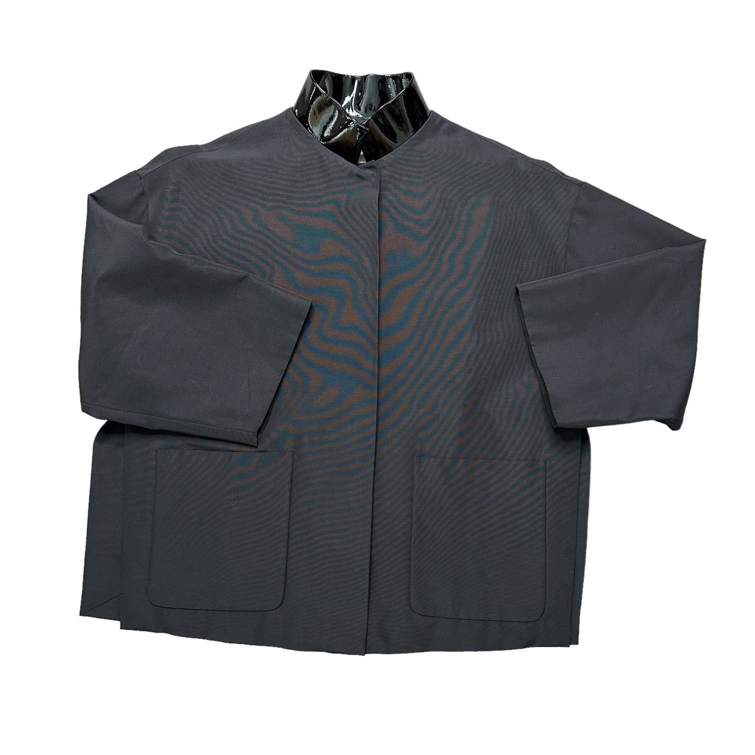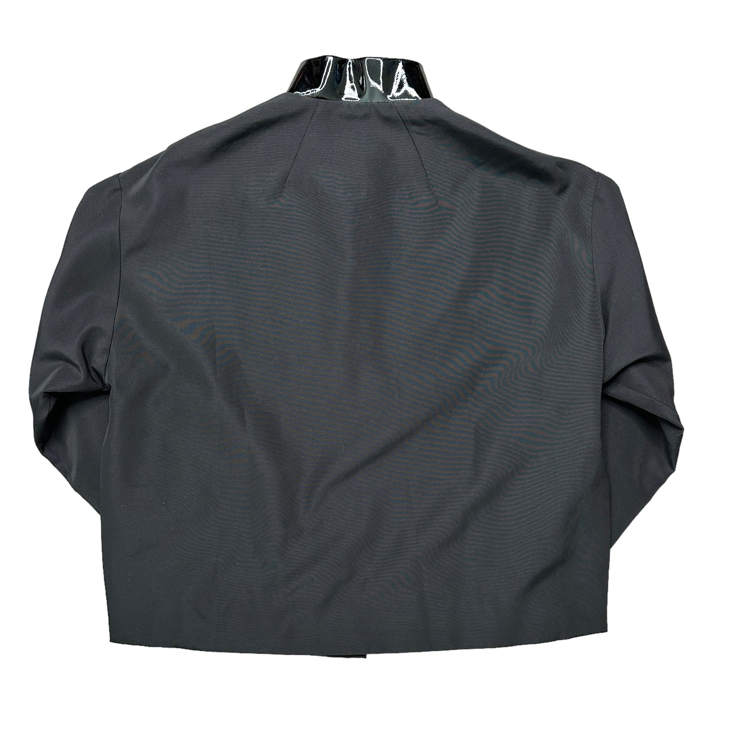 Gucci black cape jacket. Spring/Summer 2020 Collection by Alessandro Michele. Black patent leather stand alone collar. Two patch pockets at front. Designer size 38.