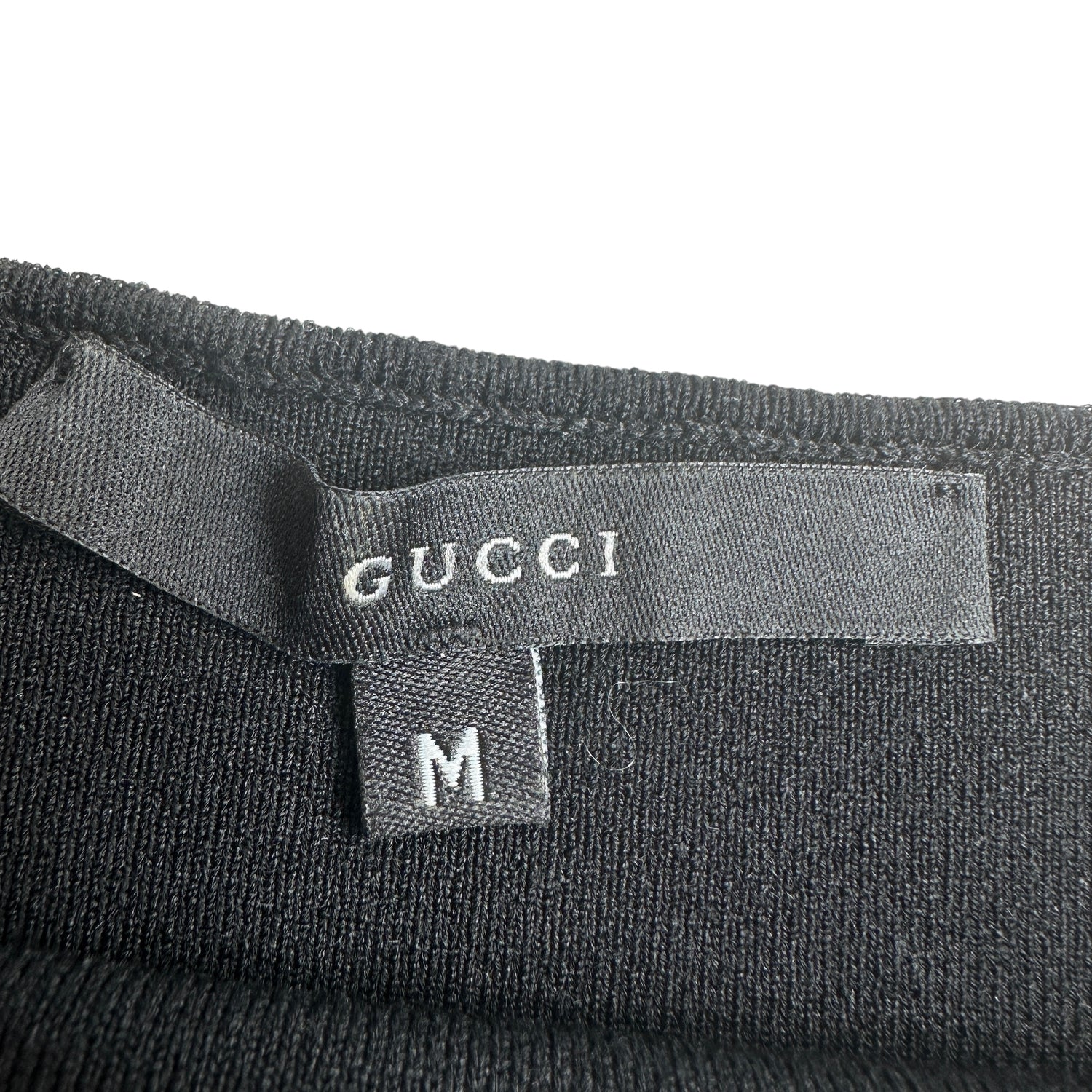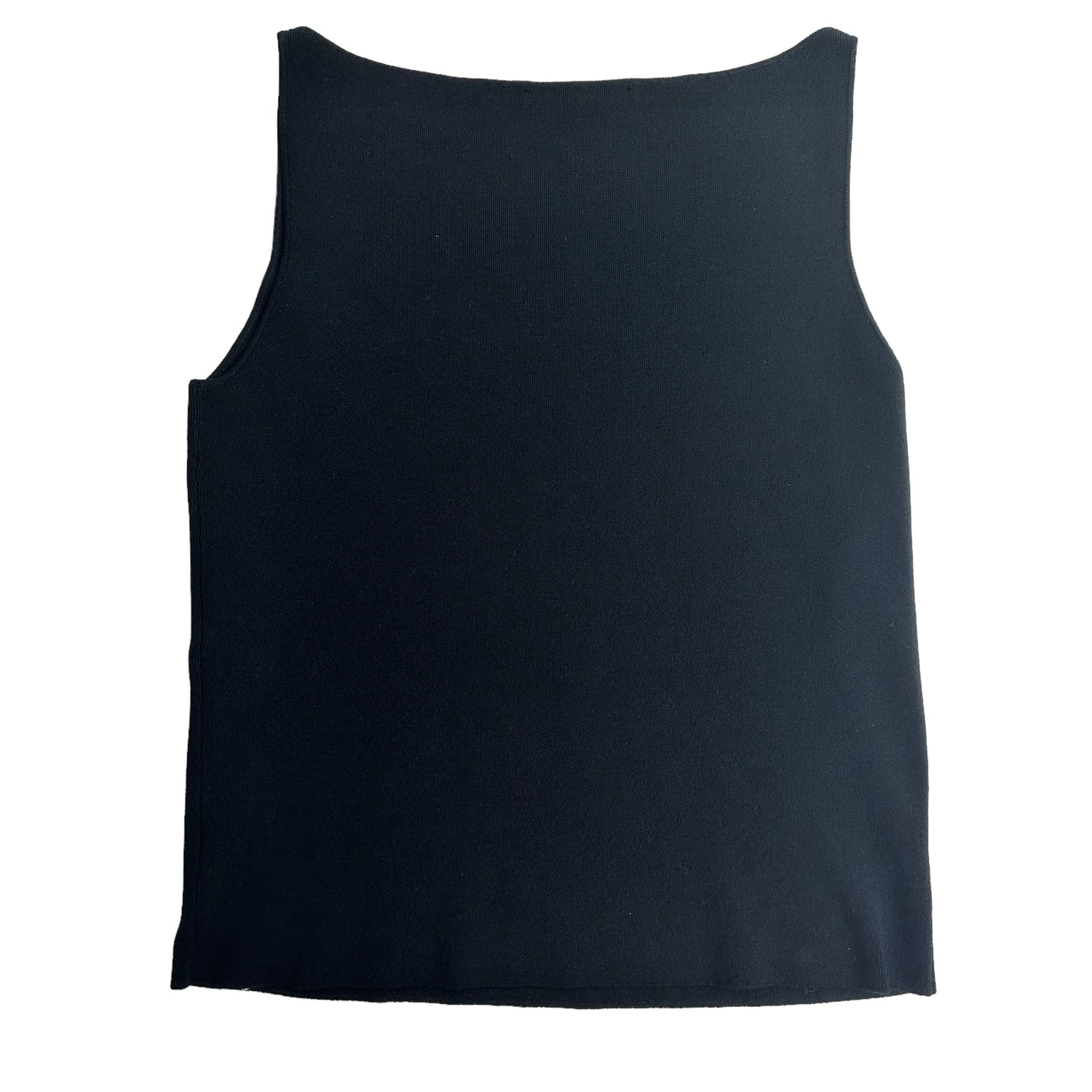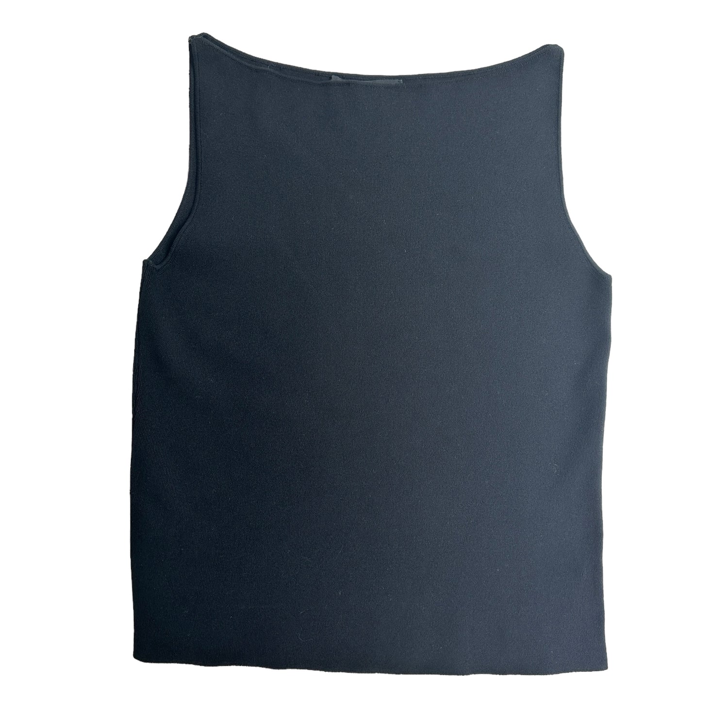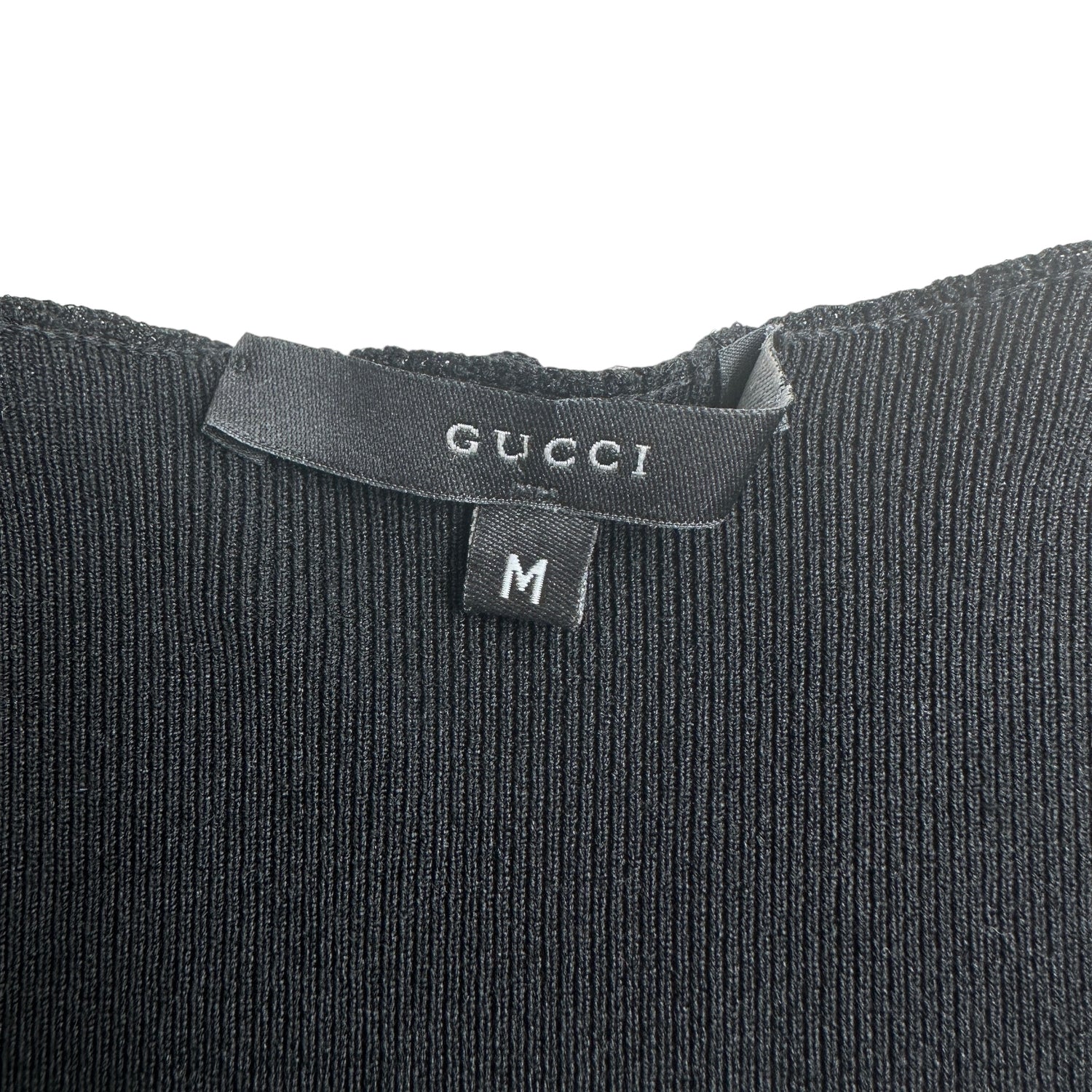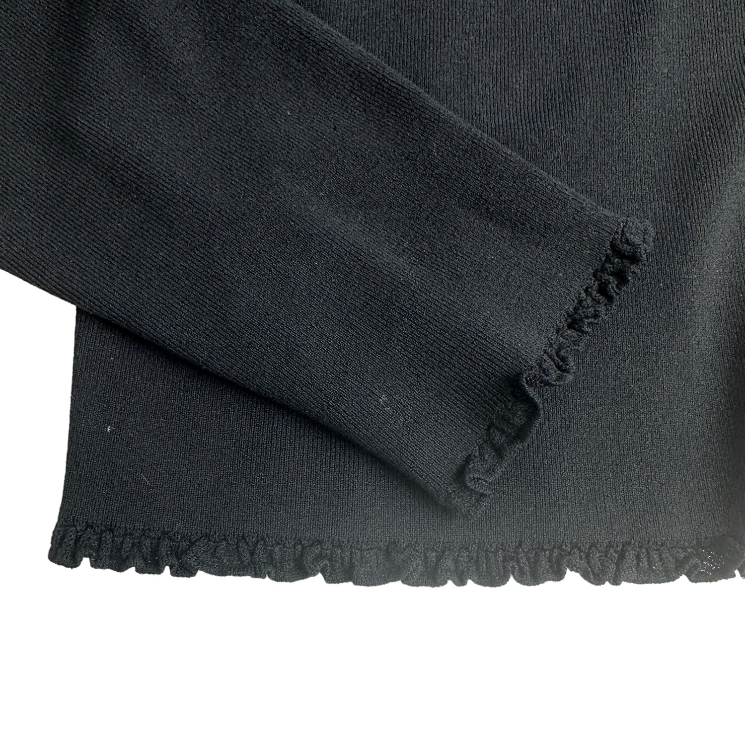 Gucci vintage black cardigan set. Gucci by Tom Ford. Tank top. Cardigan with multiple hooks closure at front. Round neck. Ruffled details at bottom and sleeves. Designer size medium.