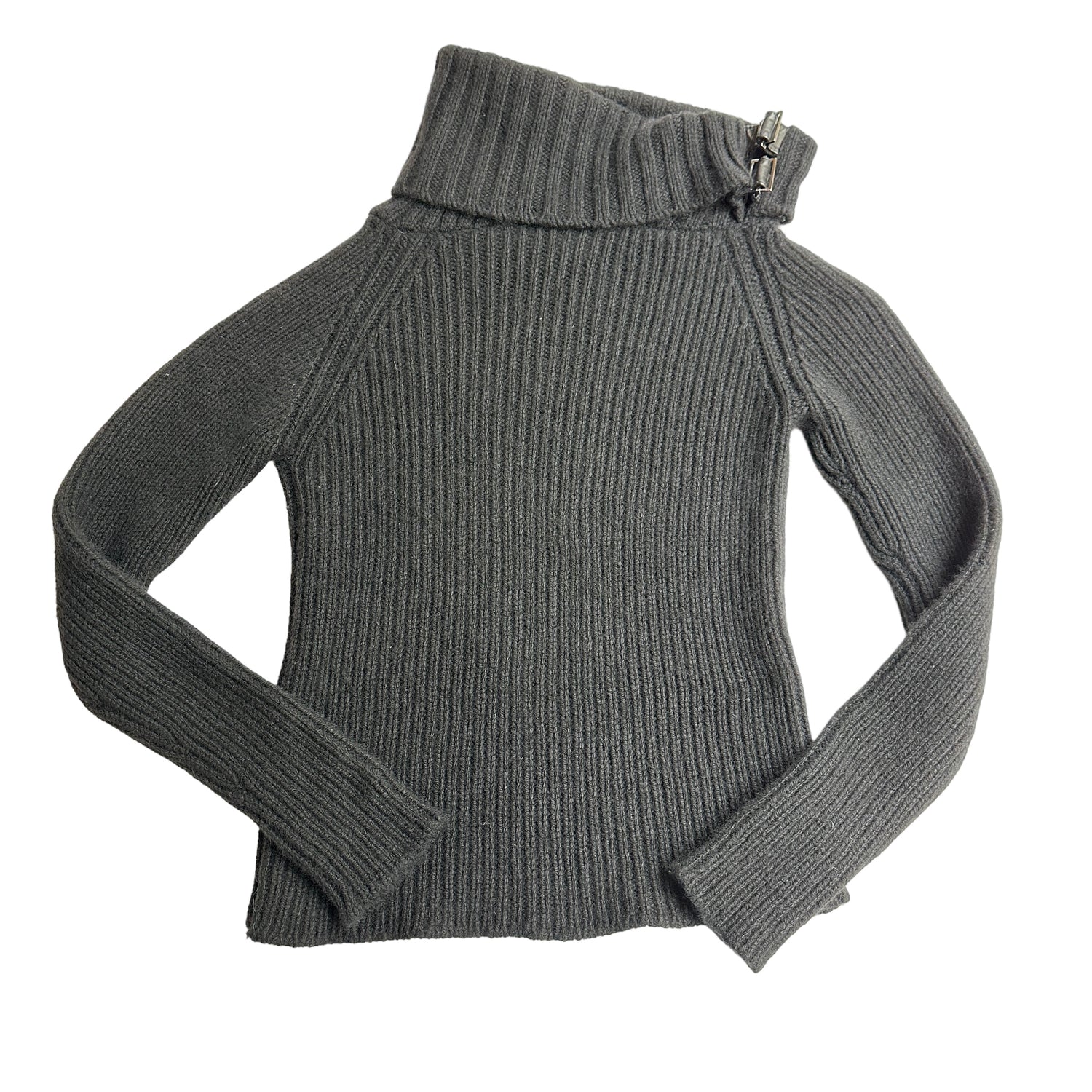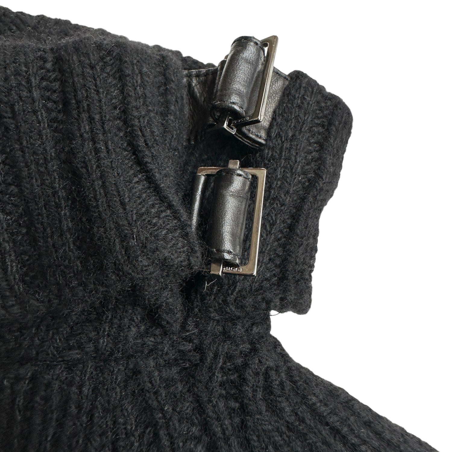 Gucci by Tom Ford black cashmere sweater. Turtleneck with black leather buckle straps at collar. Size XS.
