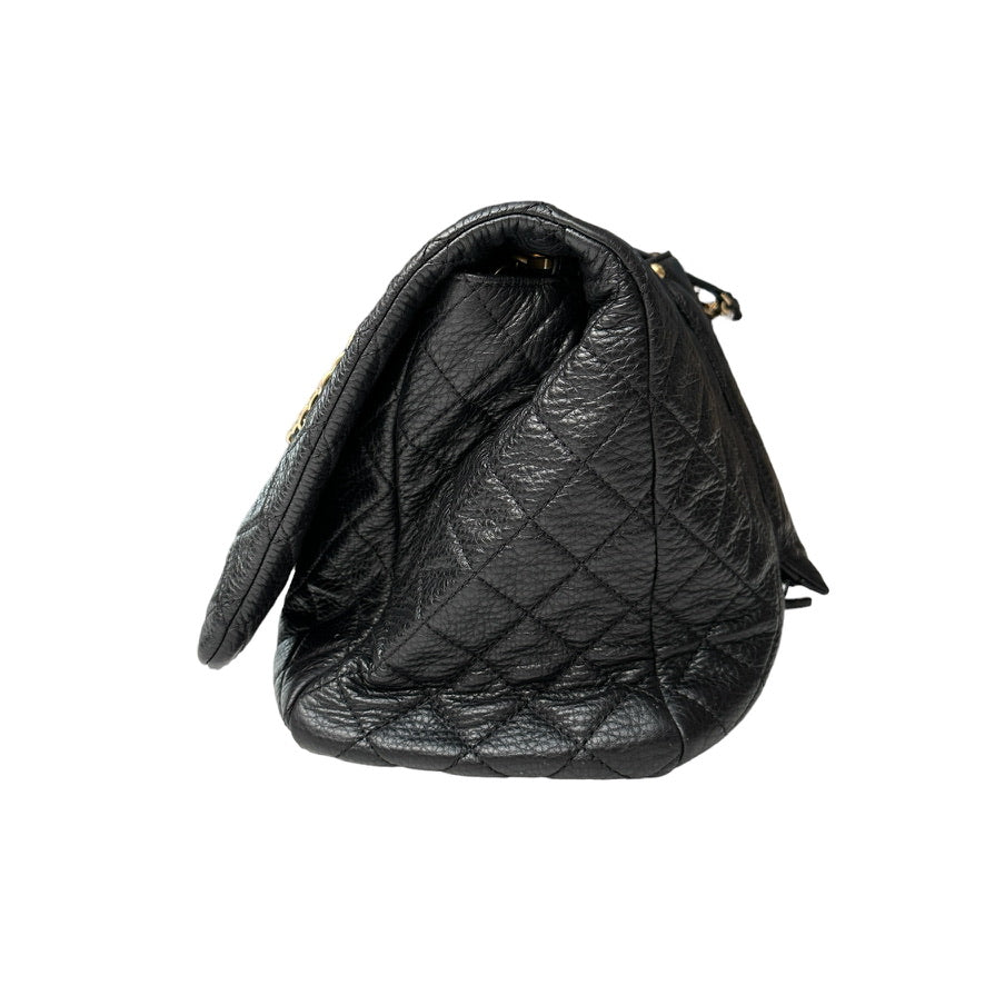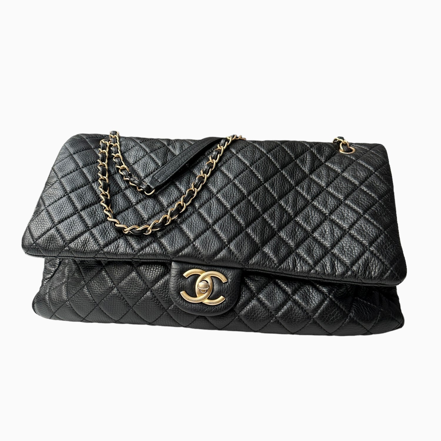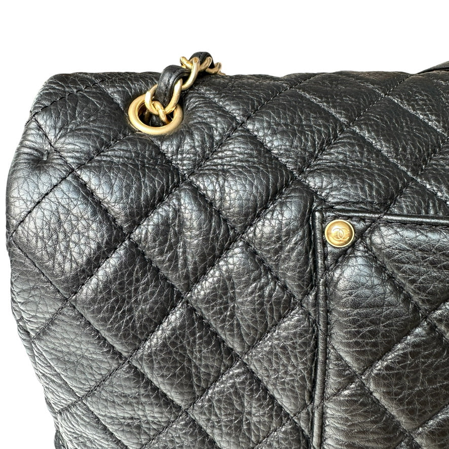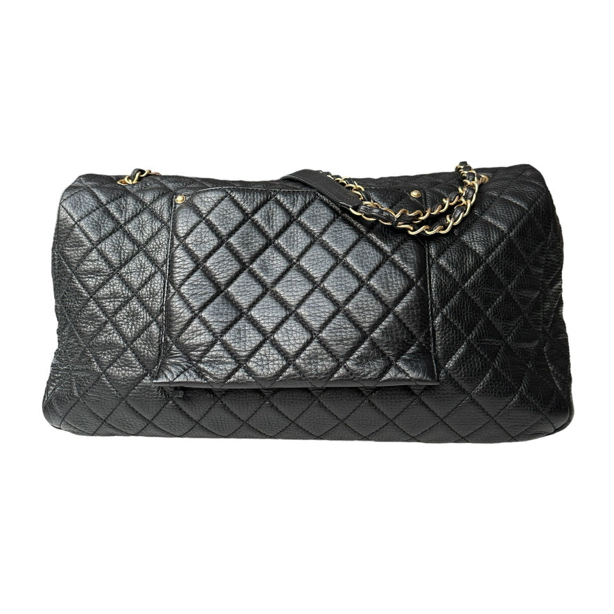Chanel Airlines XXL flap bag. Black soft caviar leather. Gold-tone hardware. Double chain straps. Interlocking CC lock at flap. The back pocket is either a pocket or open on the bottom with a zipper in order to slide the bag on a rolling suitcase handle. This is a very practical bag made to travel. Great as a work bag as it can fit it all. This is a rare item and hard to come across.
