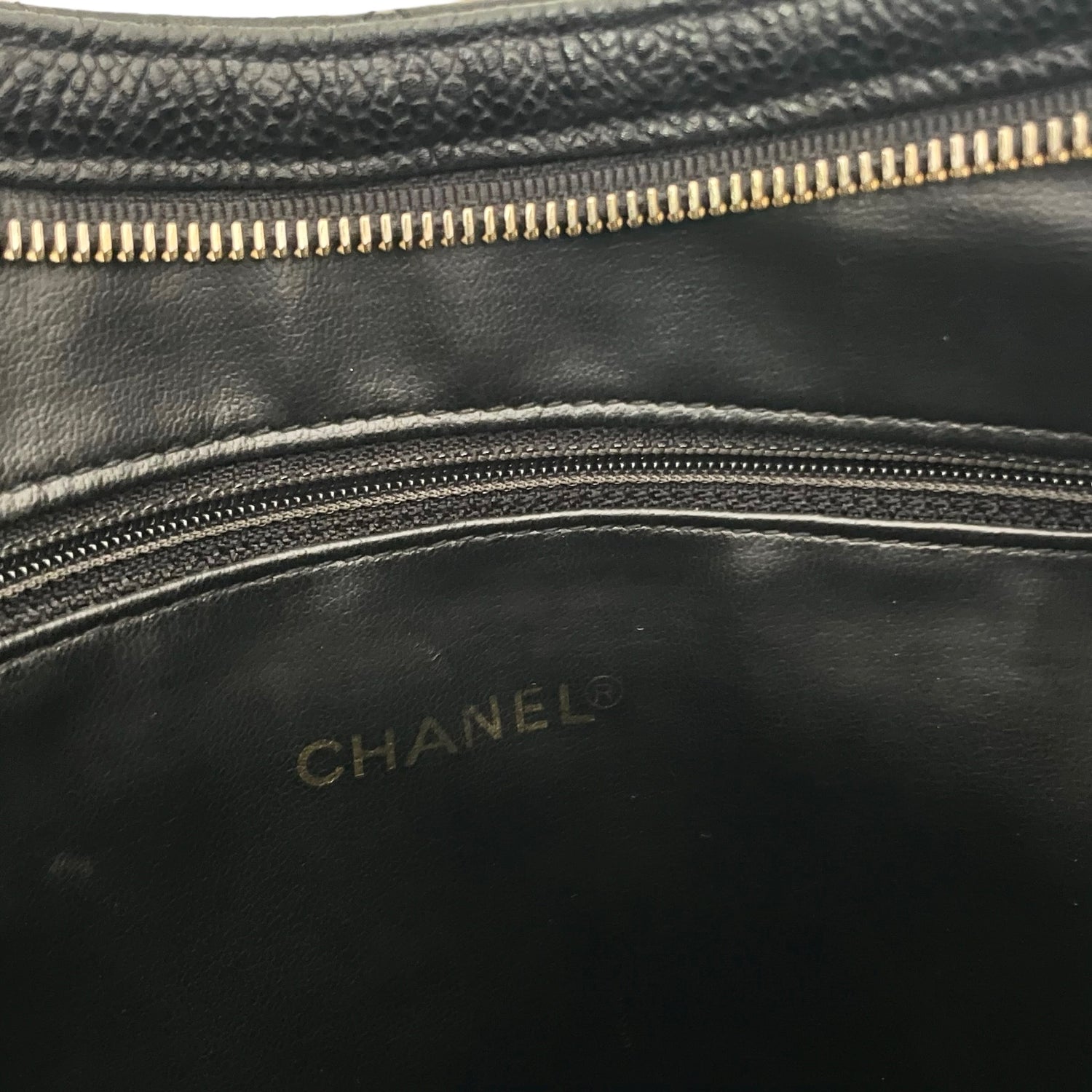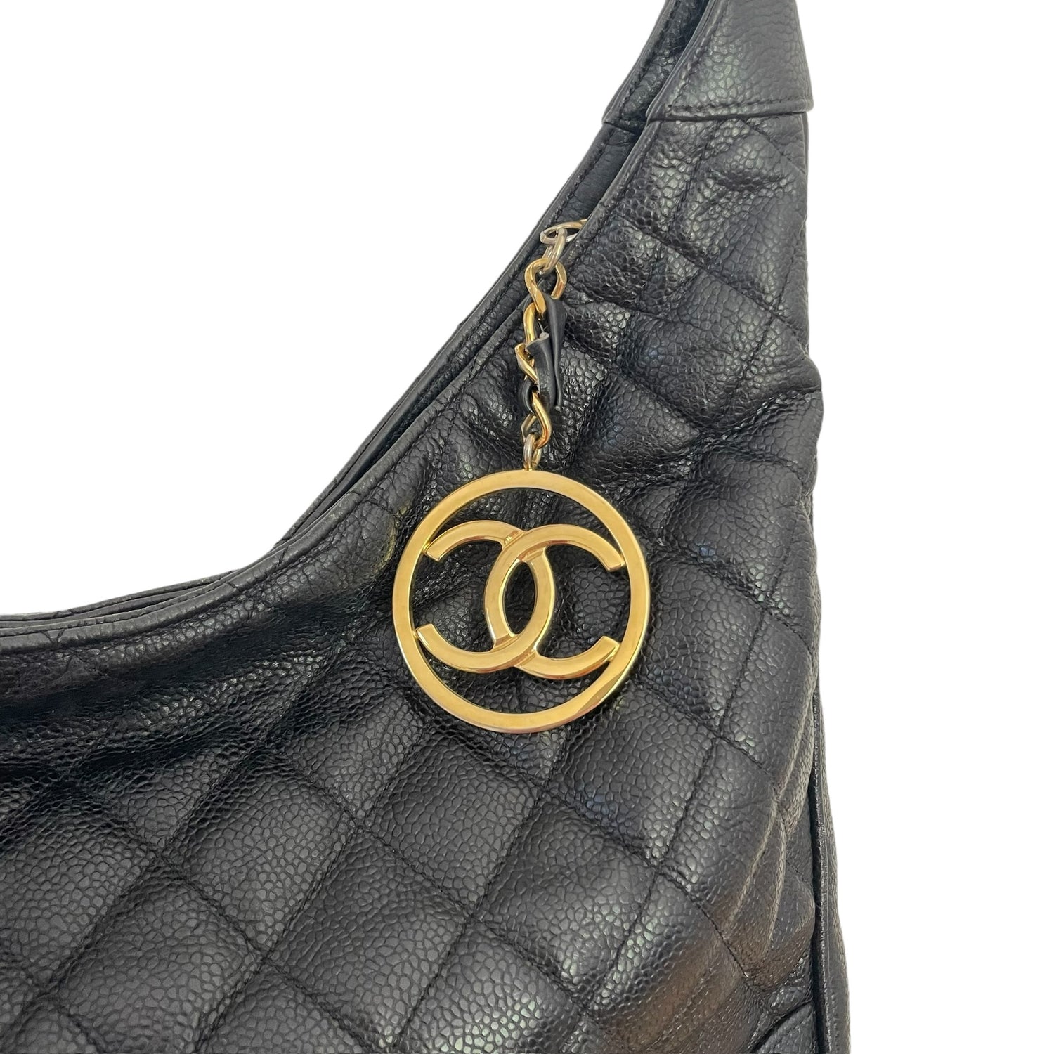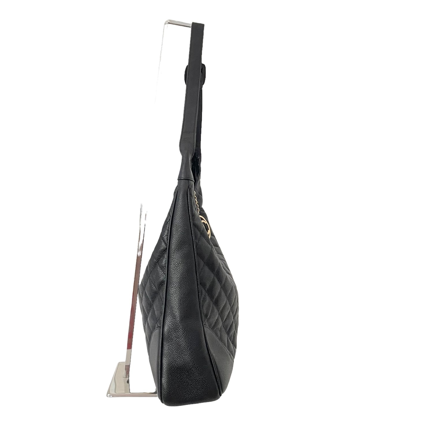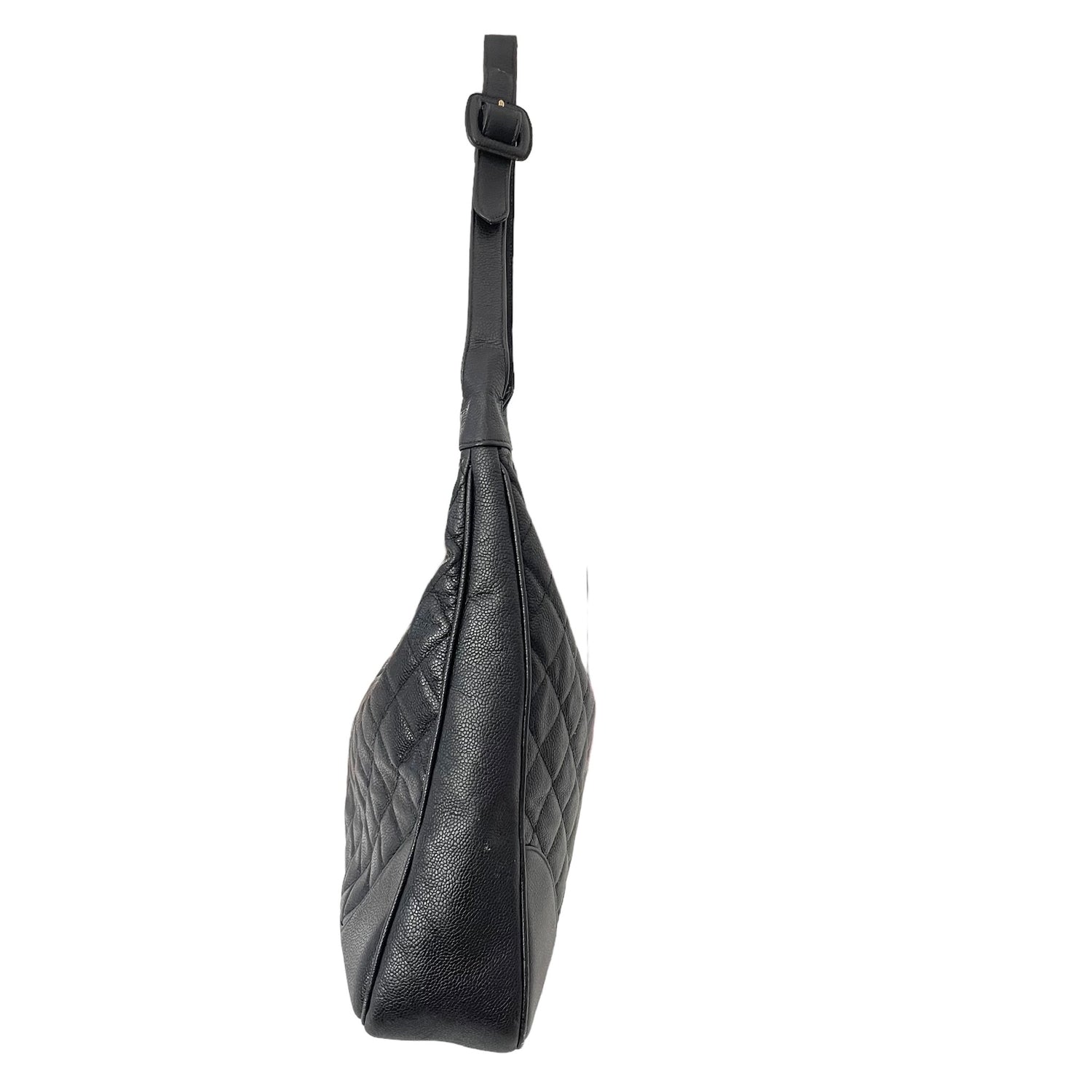 Chanel black caviar hobo bag. 2014 collection by Karl Lagerfeld. Quilted black caviar leather. CC logo medallion at zipper in gold-tone hardware. Black leather lining with one interior zipper pocket.
