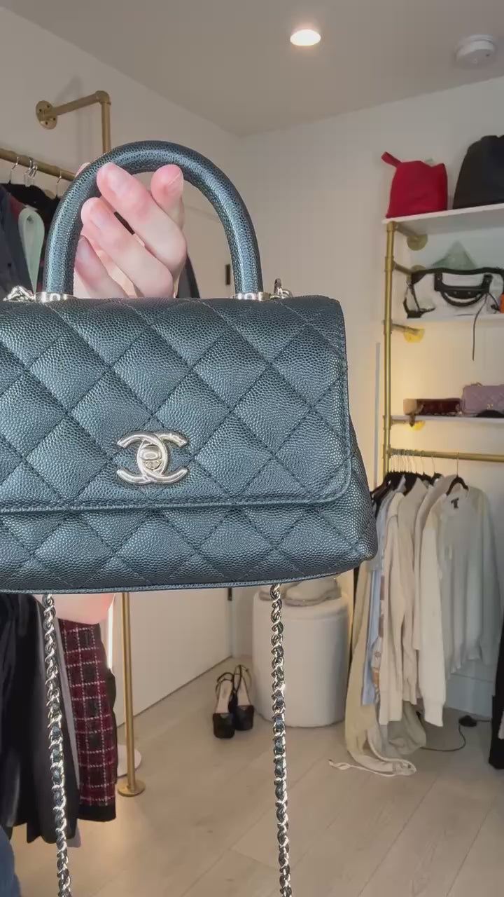 Chanel black caviar mini top handle bag. Removable crossbody chain strap. Gold hardware.