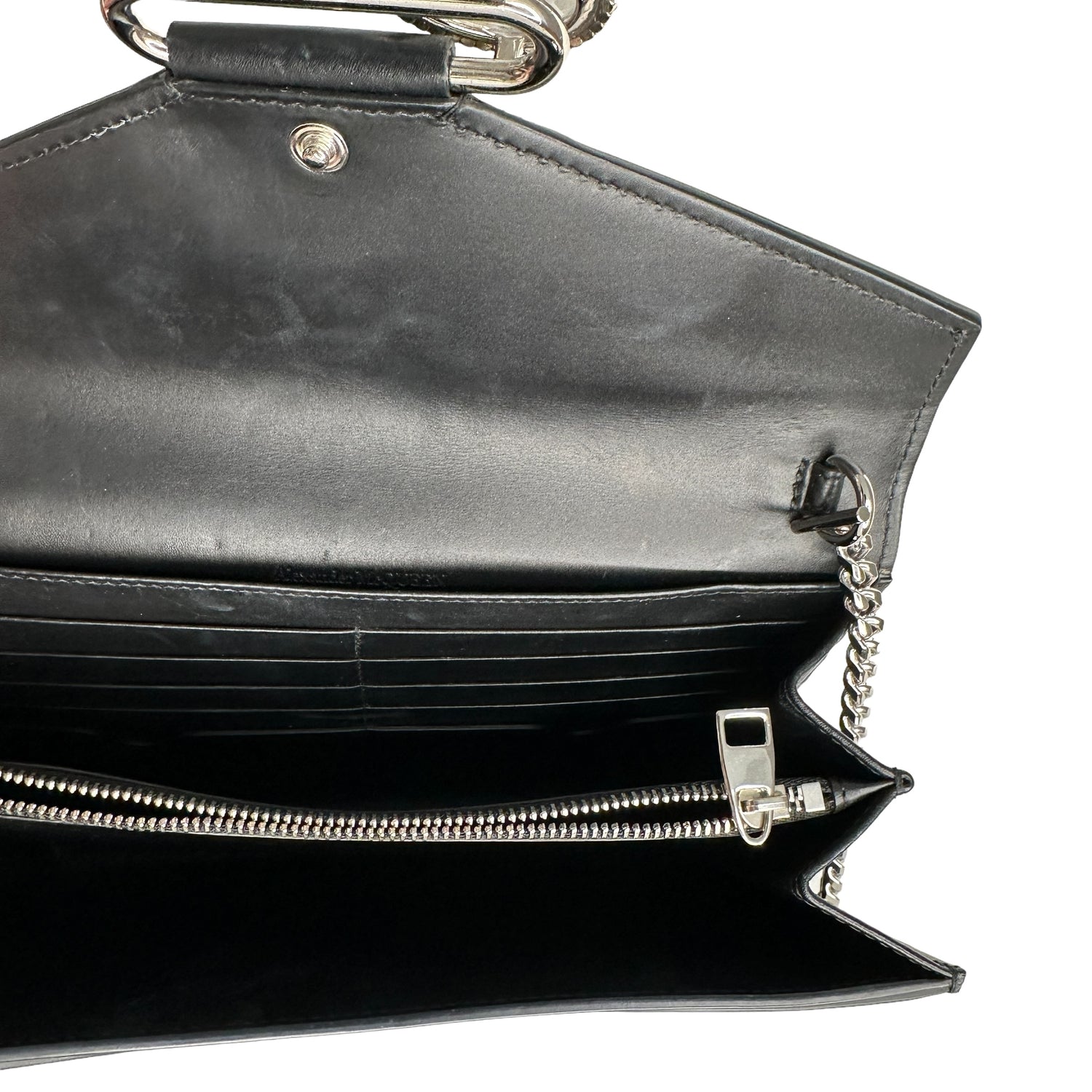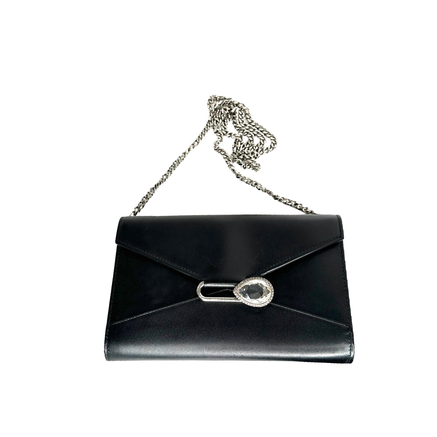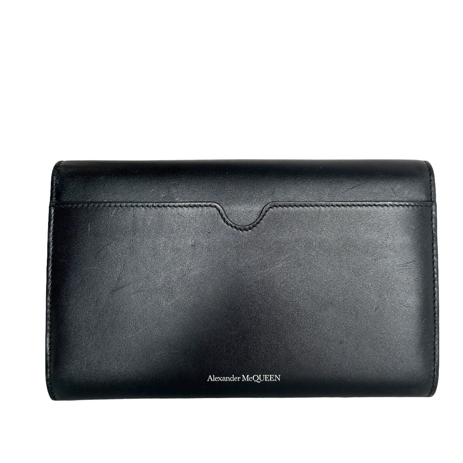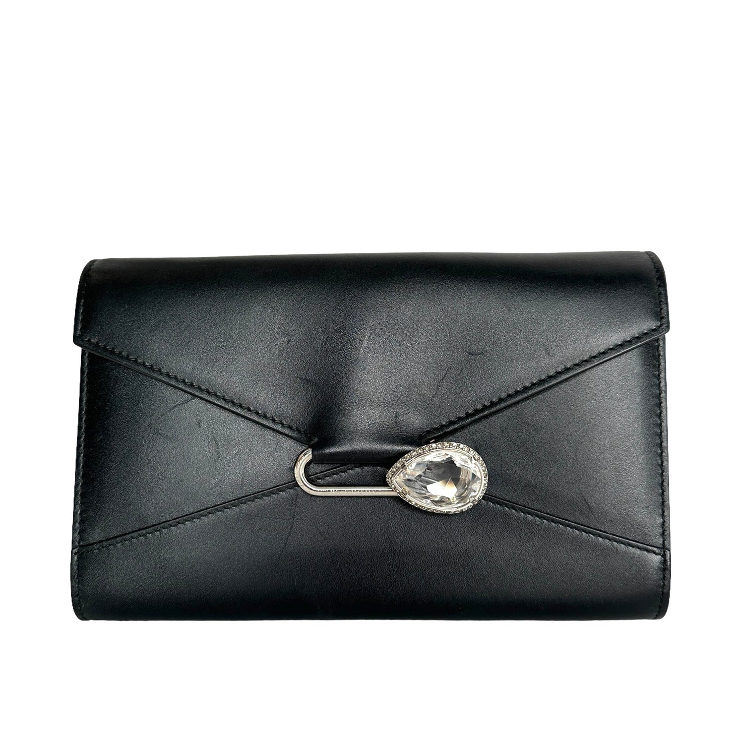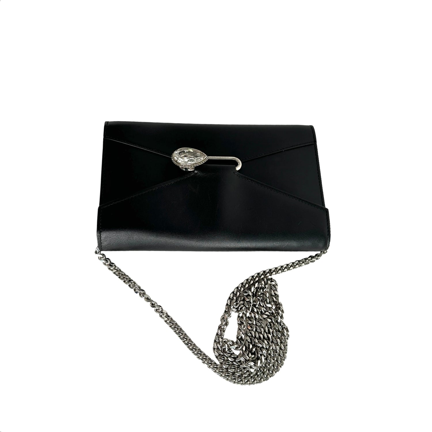 Alexander McQueen black clutch. Silver crossbody chain. Crystal pin detail at closure. Magnetic snap closure at flap. Multiple compartment with one zipper pocket at interior.