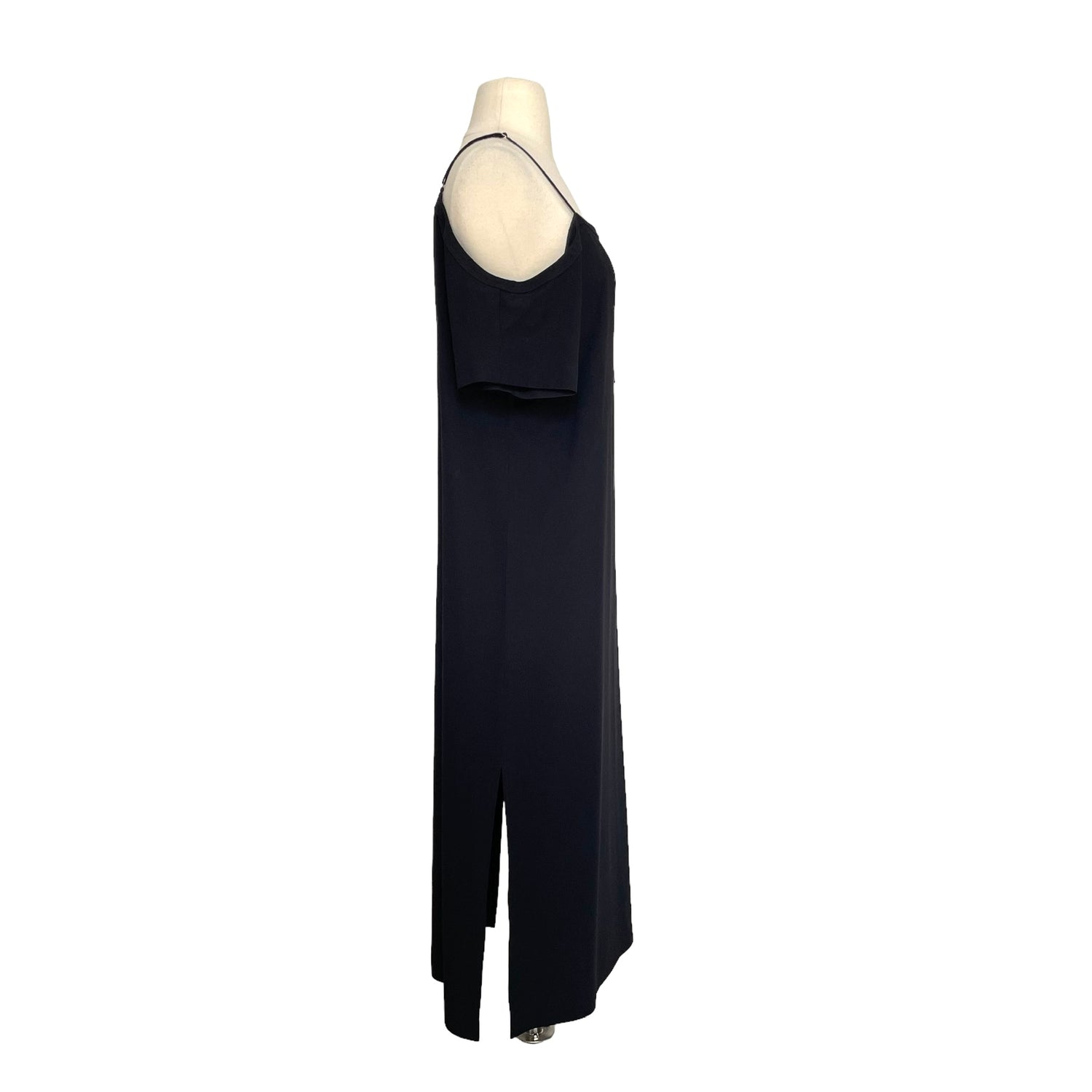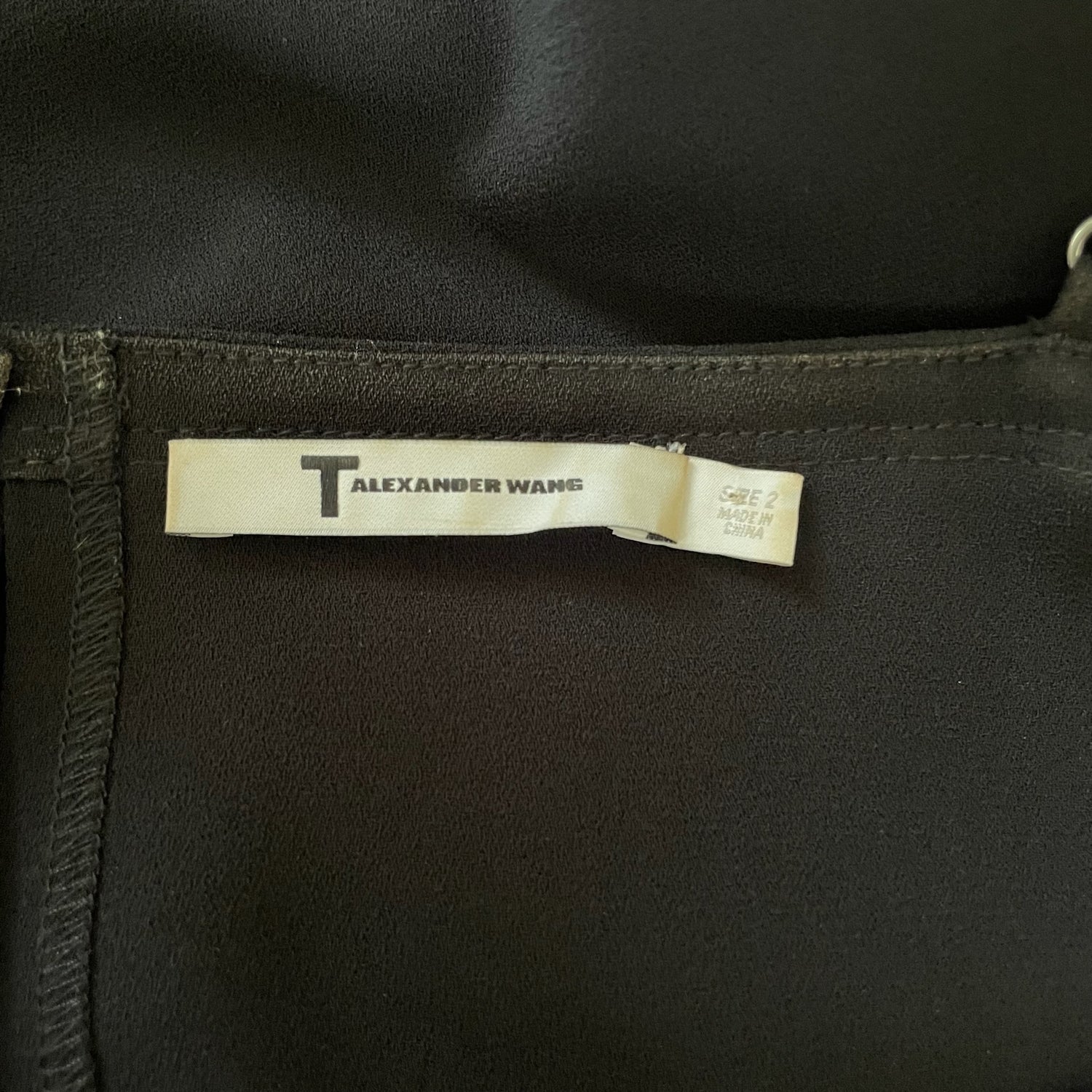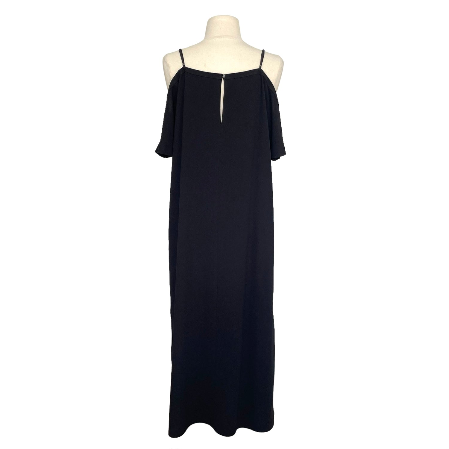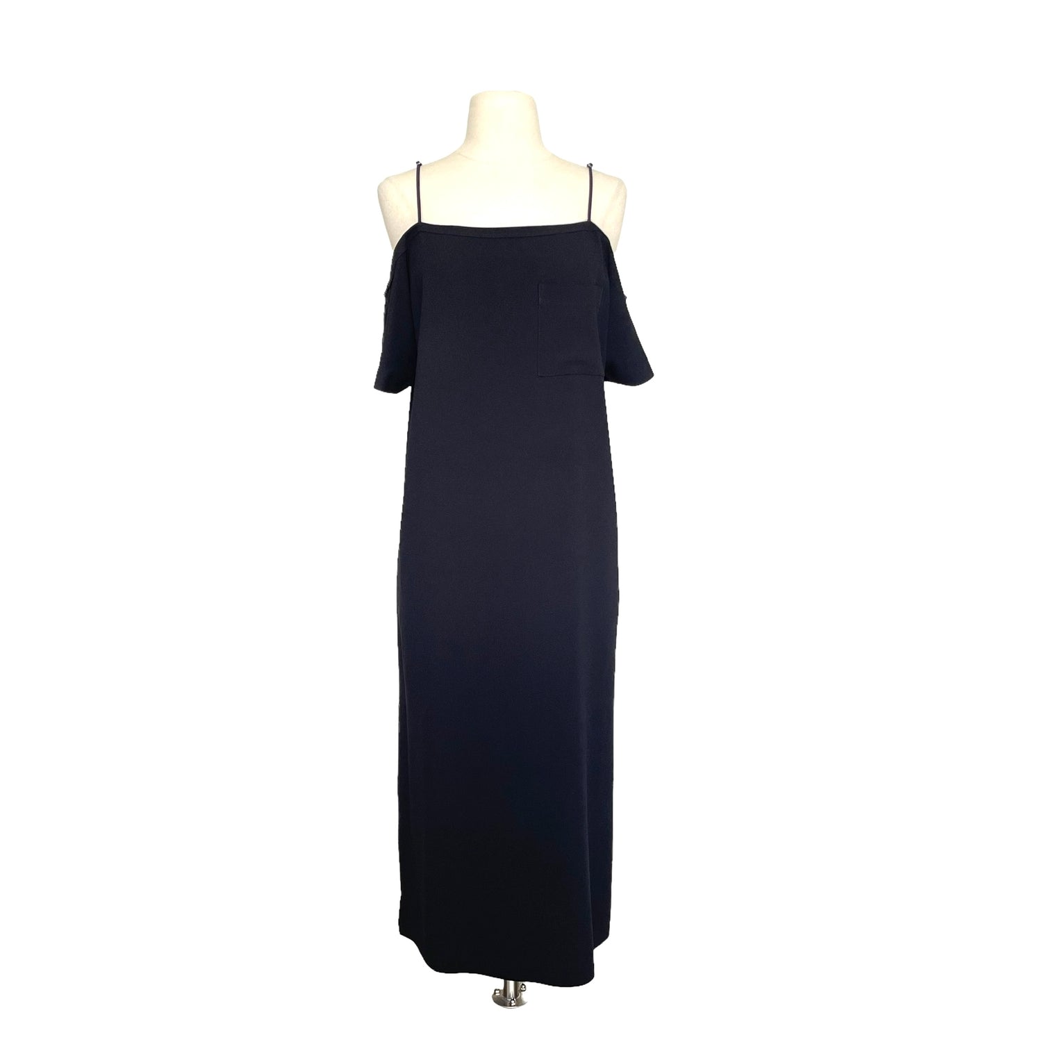 Alexander Wang black dress. Cold-shoulders short sleeves. Adjustable spaghetti straps. One pocket at front. One button closure at back. Shift dress with slits at bottom. Designer size 2.