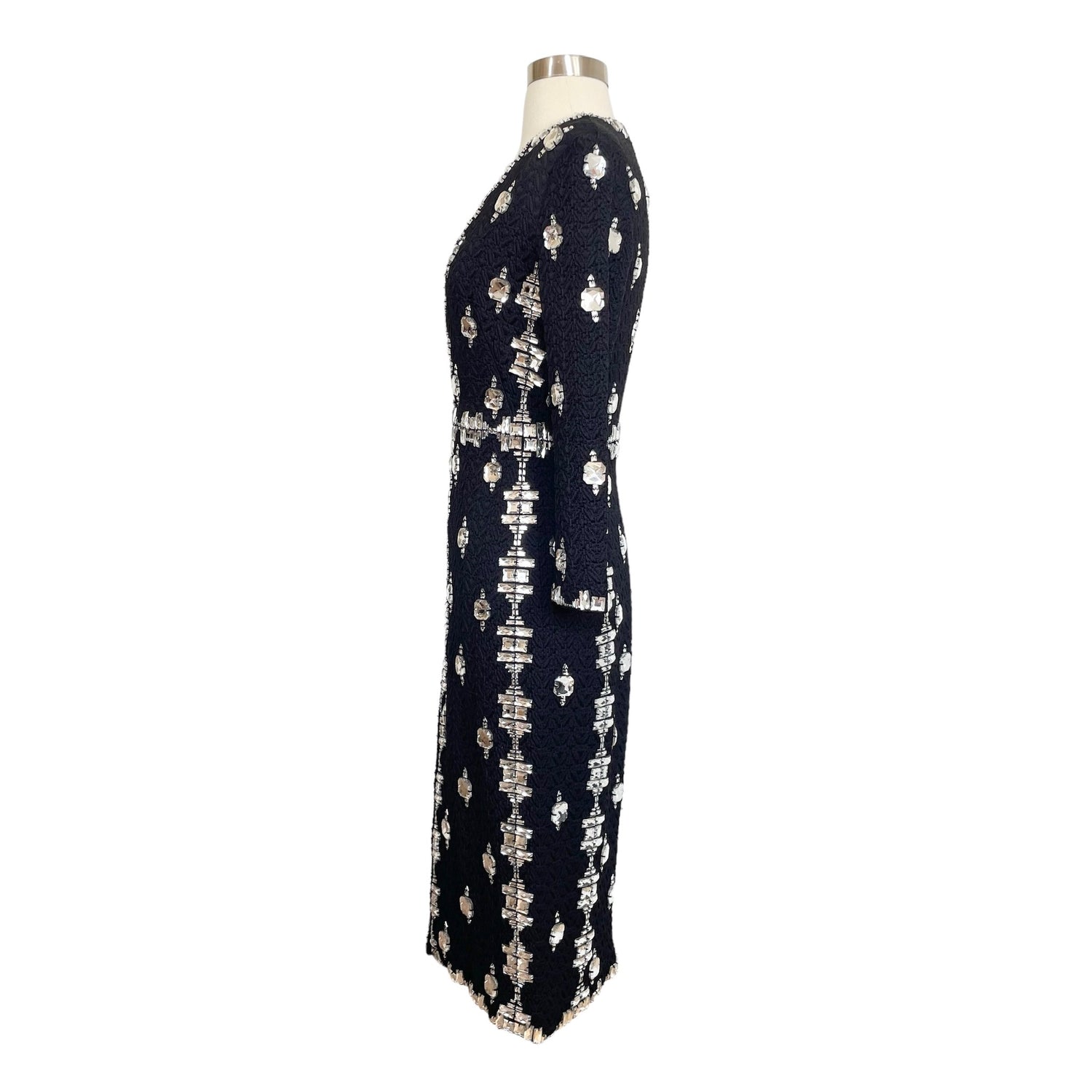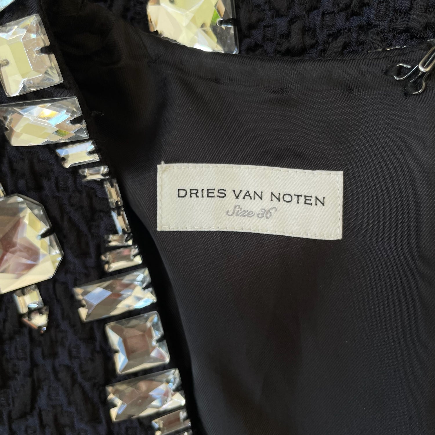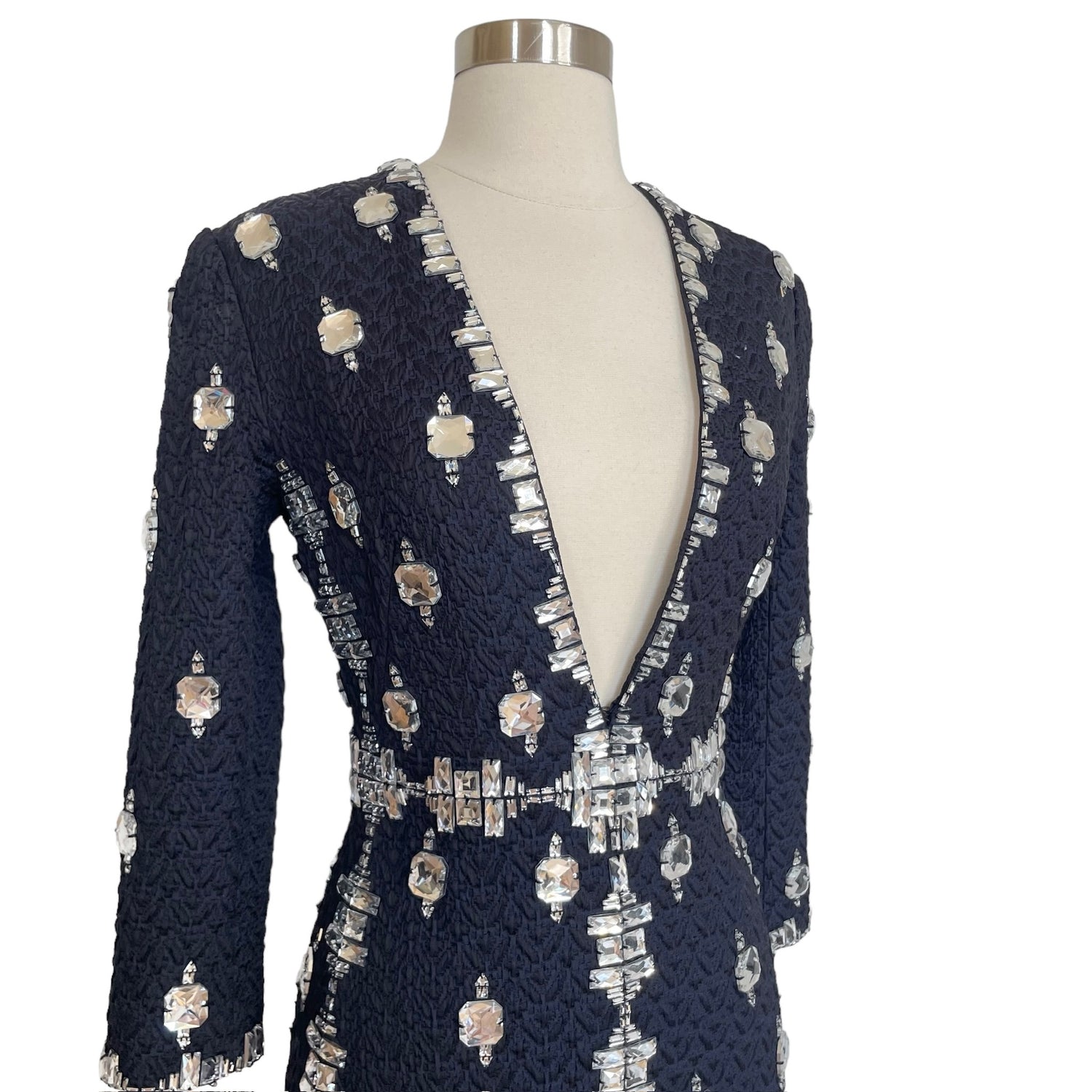 Dries Van Noten black textured dress with crystal embellishments. Deep V-neck at front. Concealed zipper closure at back. Slit at front. Designer size 36.