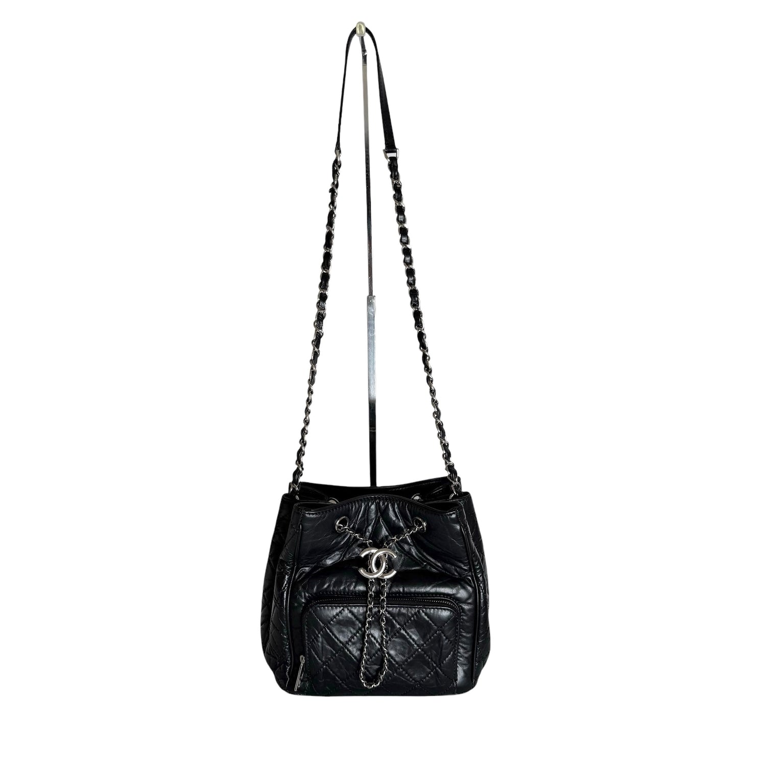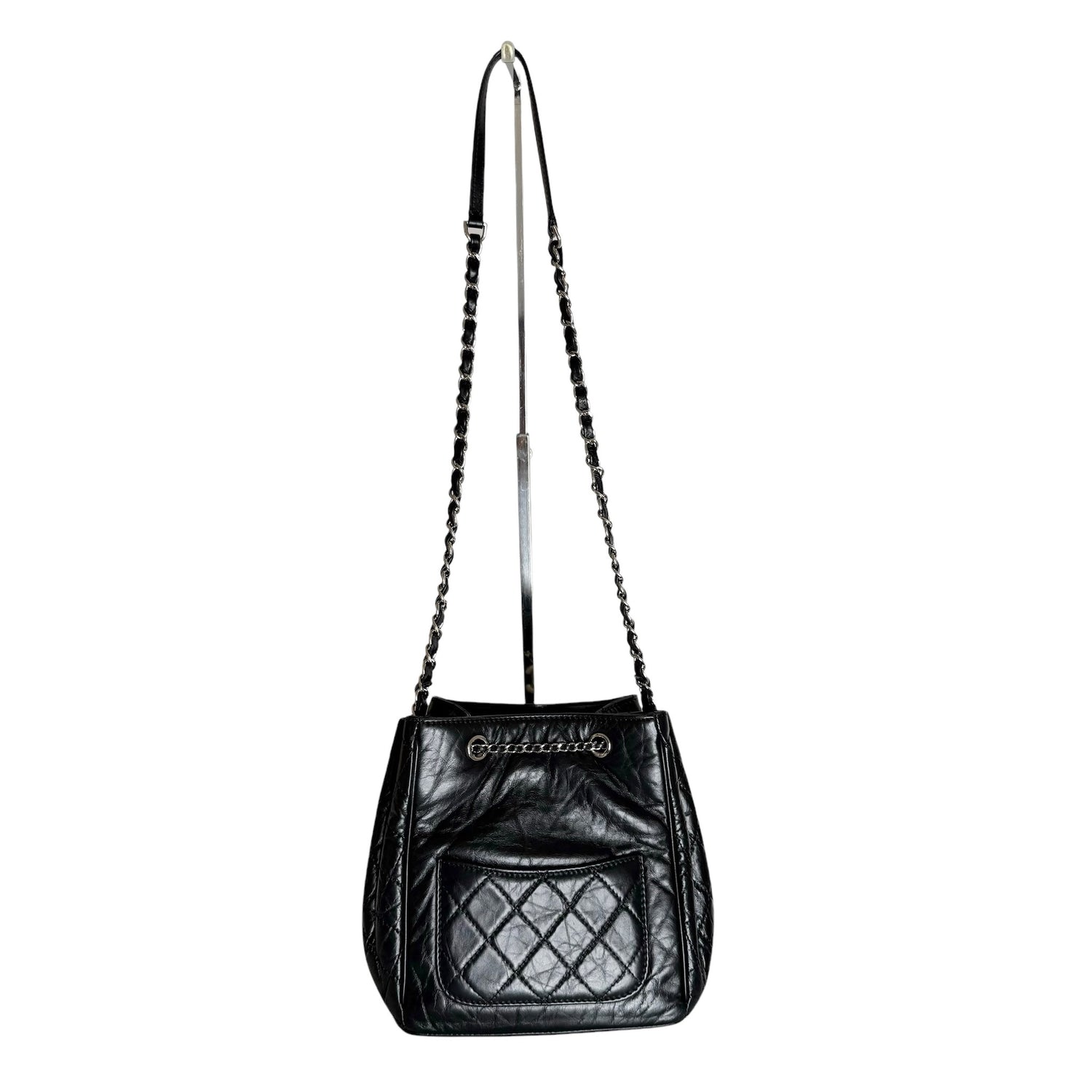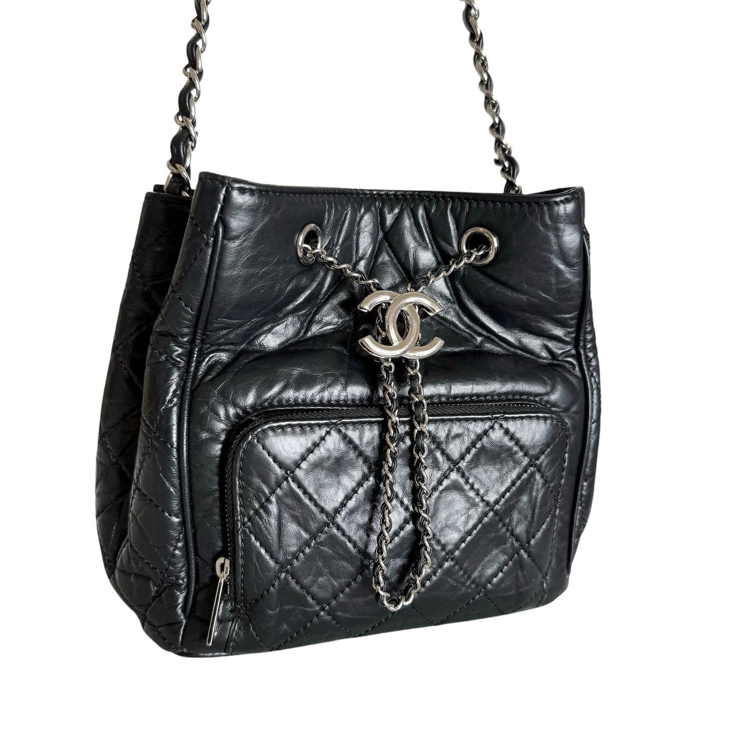Chanel drawstring bag. 2018 collection. Black calfskin leather with silver-tone hardware and chain. One back exterior pocket. Gros grain lining.