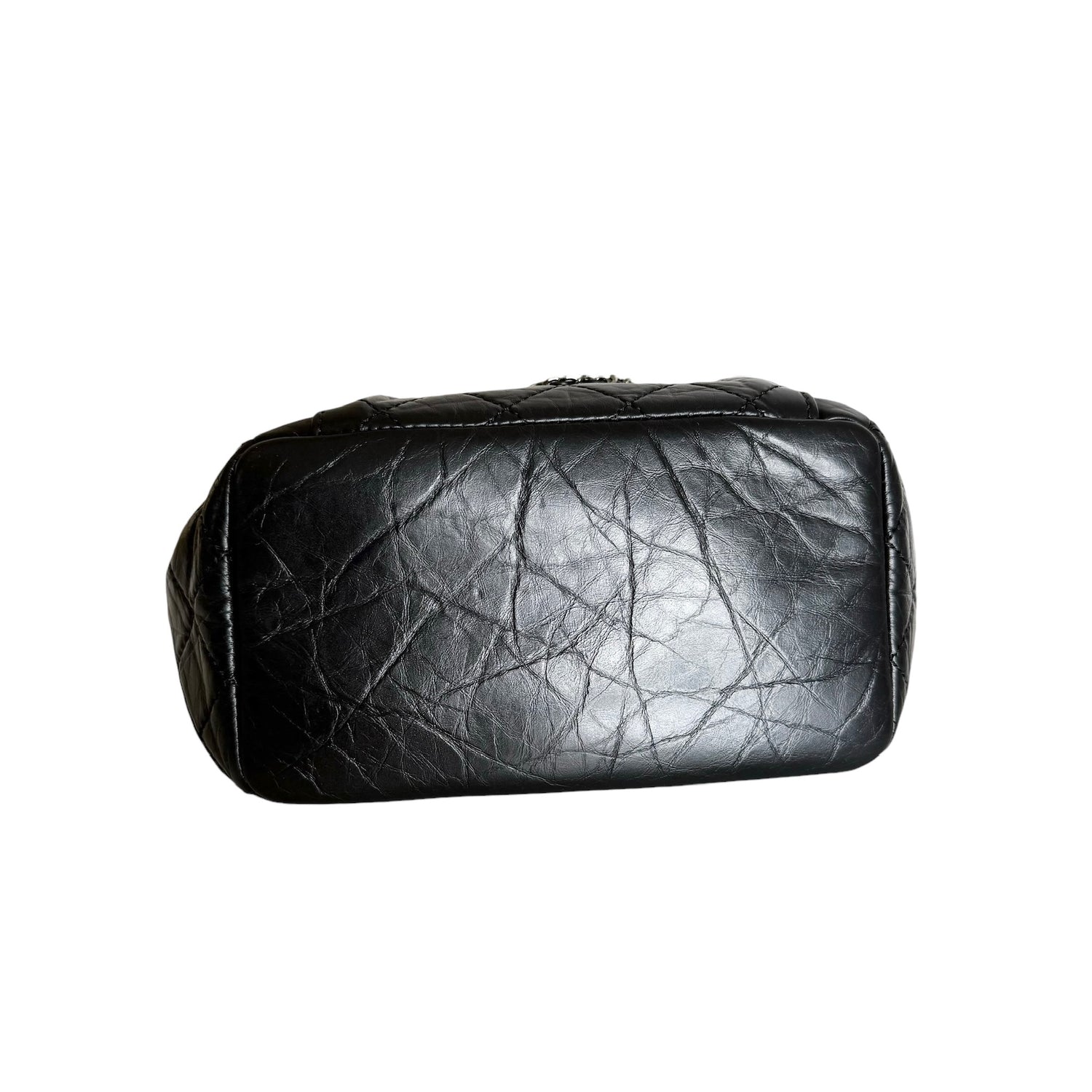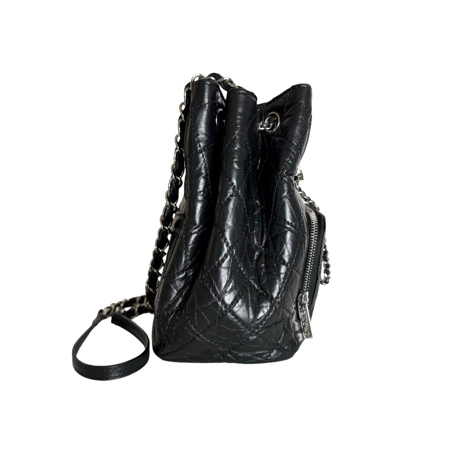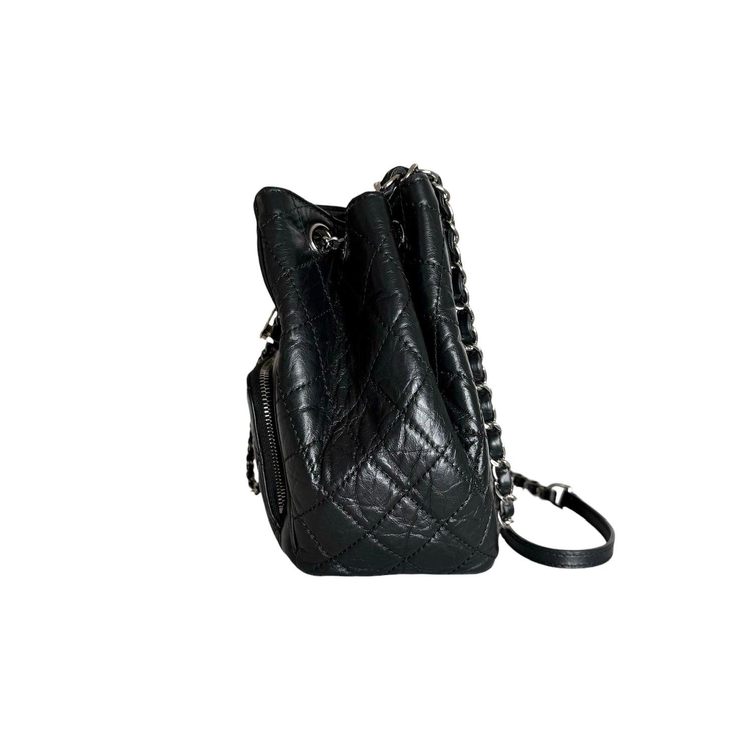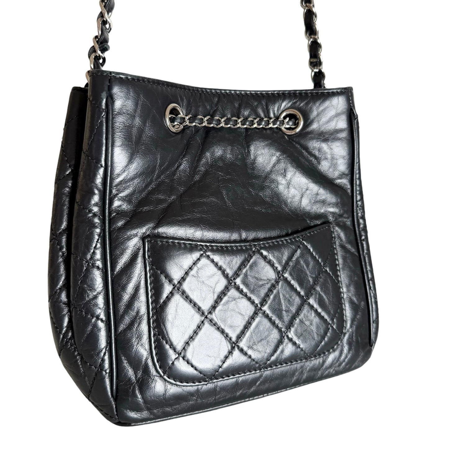 Chanel drawstring bag. 2018 collection. Black calfskin leather with silver-tone hardware and chain. One back exterior pocket. Gros grain lining.