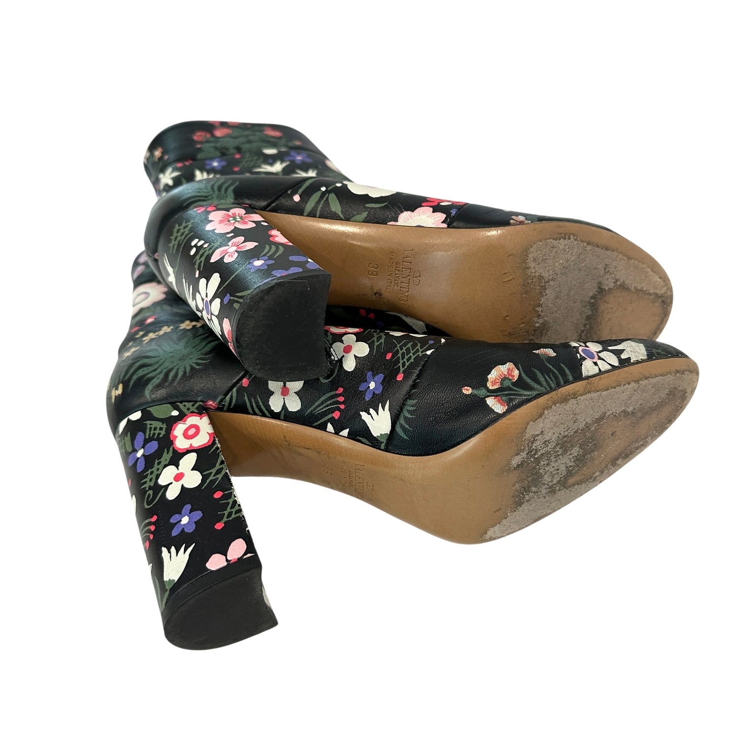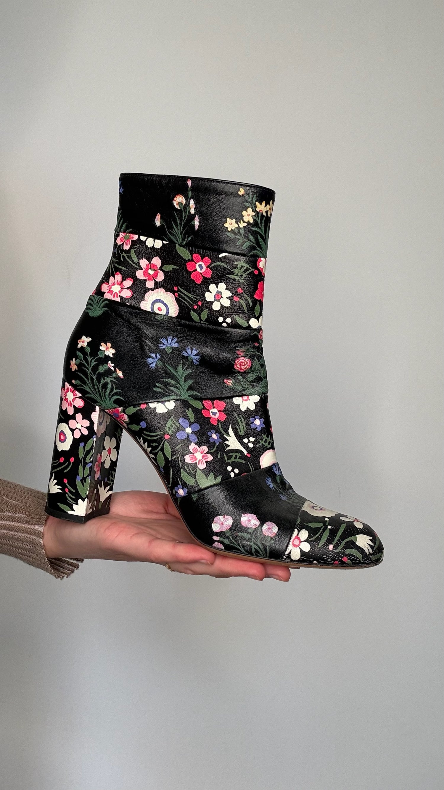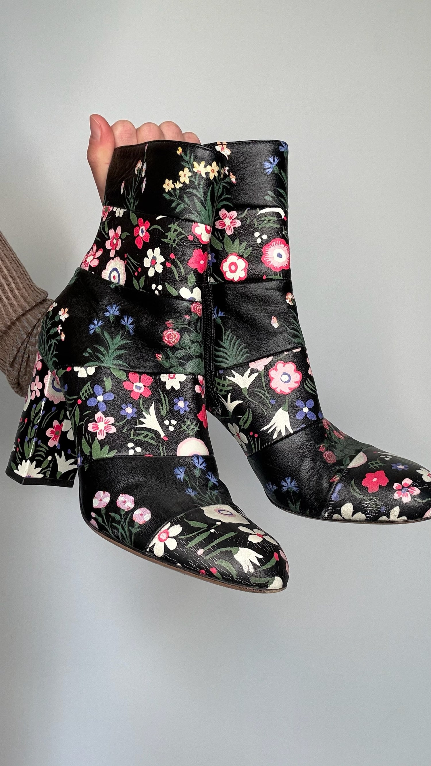 Valentino floral leather boots. Round toe. Zipper closure at side. Block heels. Designer size 39.