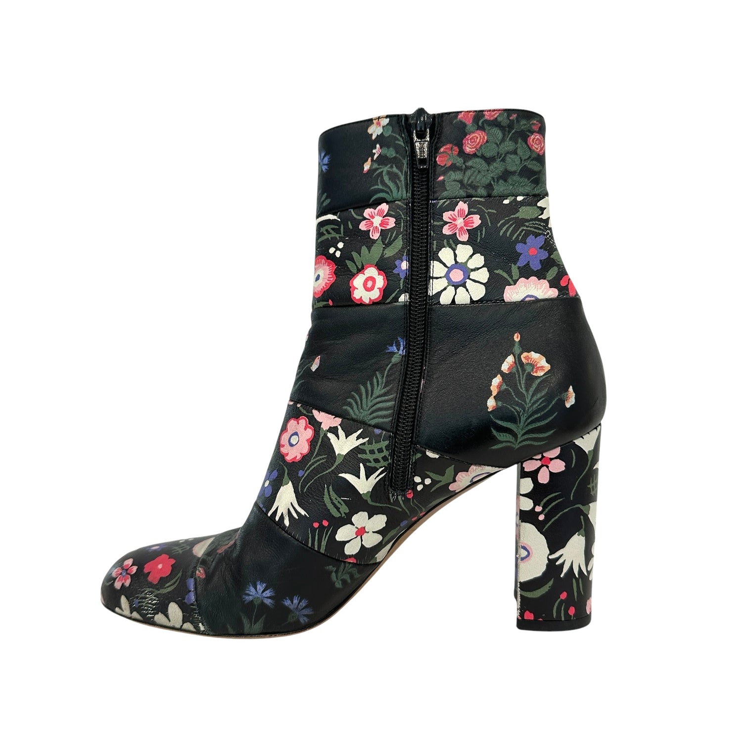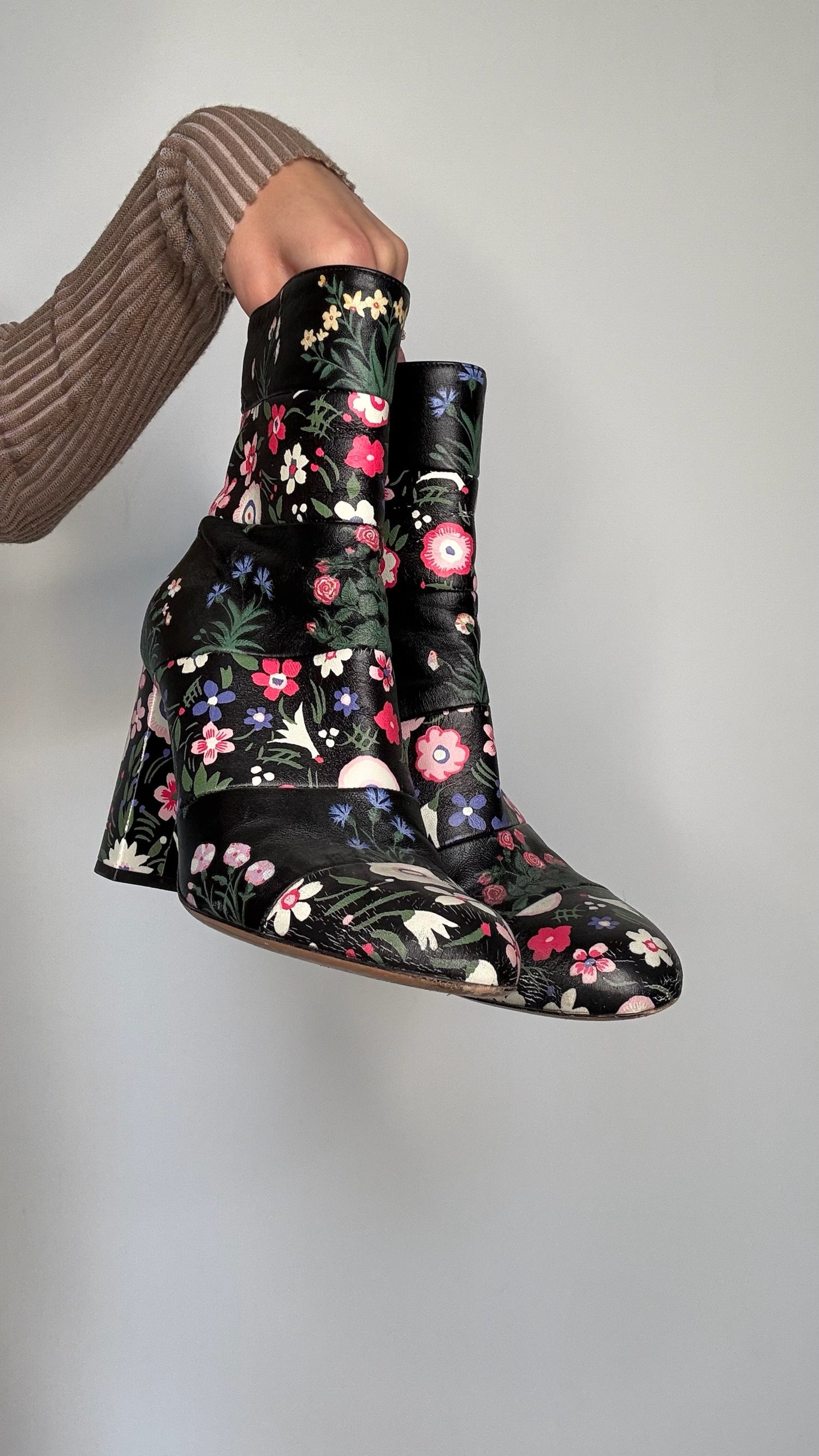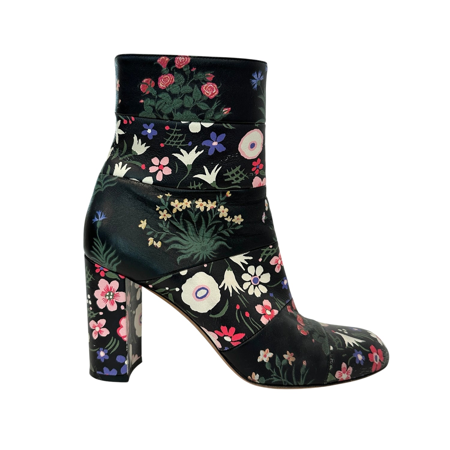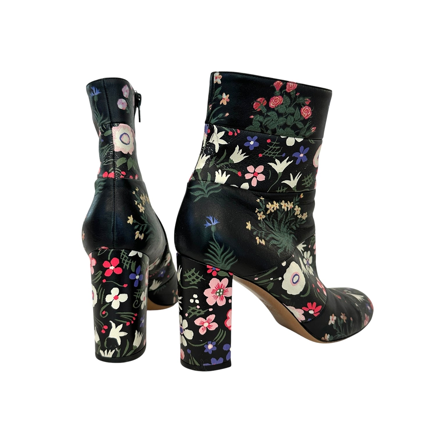 Valentino floral leather boots. Round toe. Zipper closure at side. Block heels. Designer size 39.